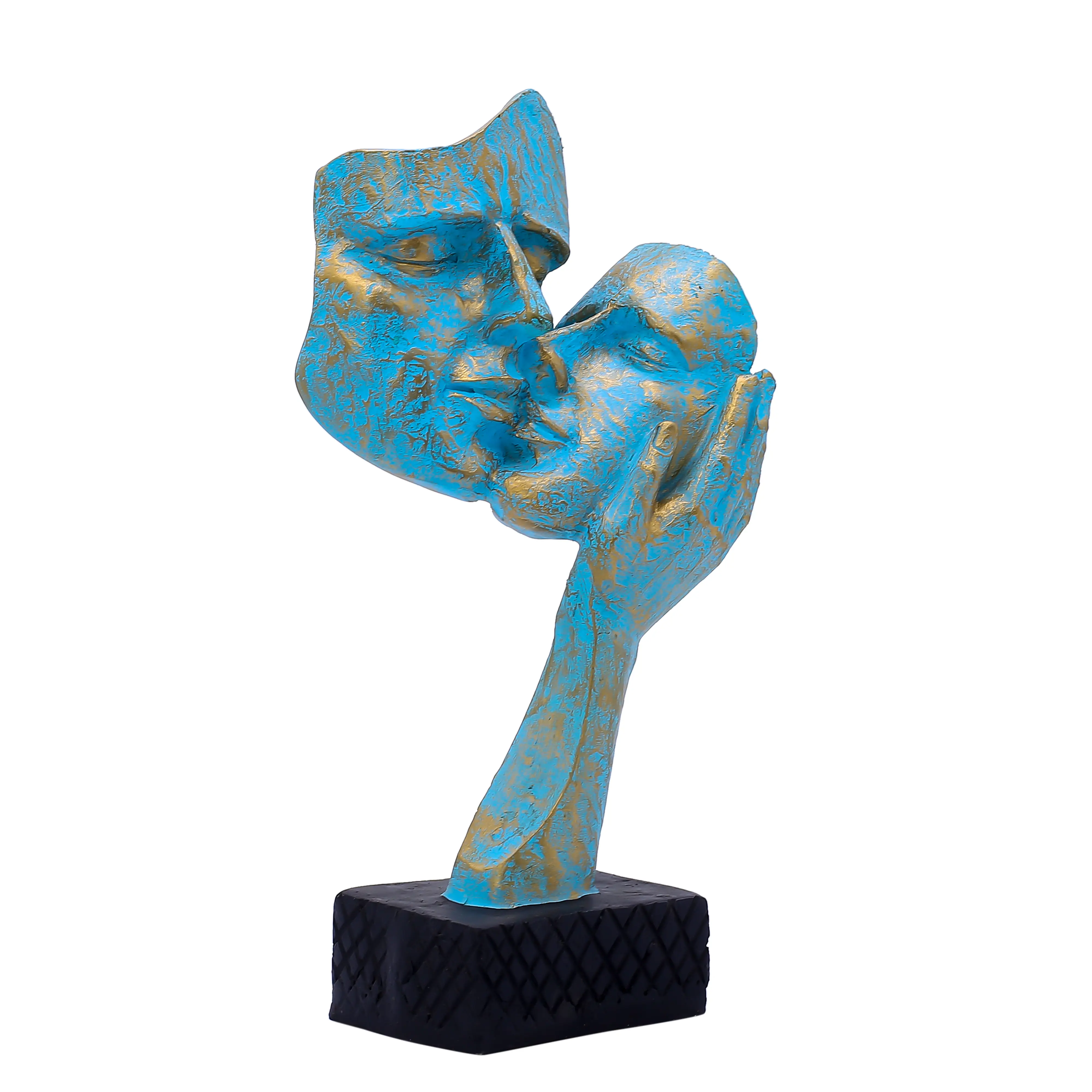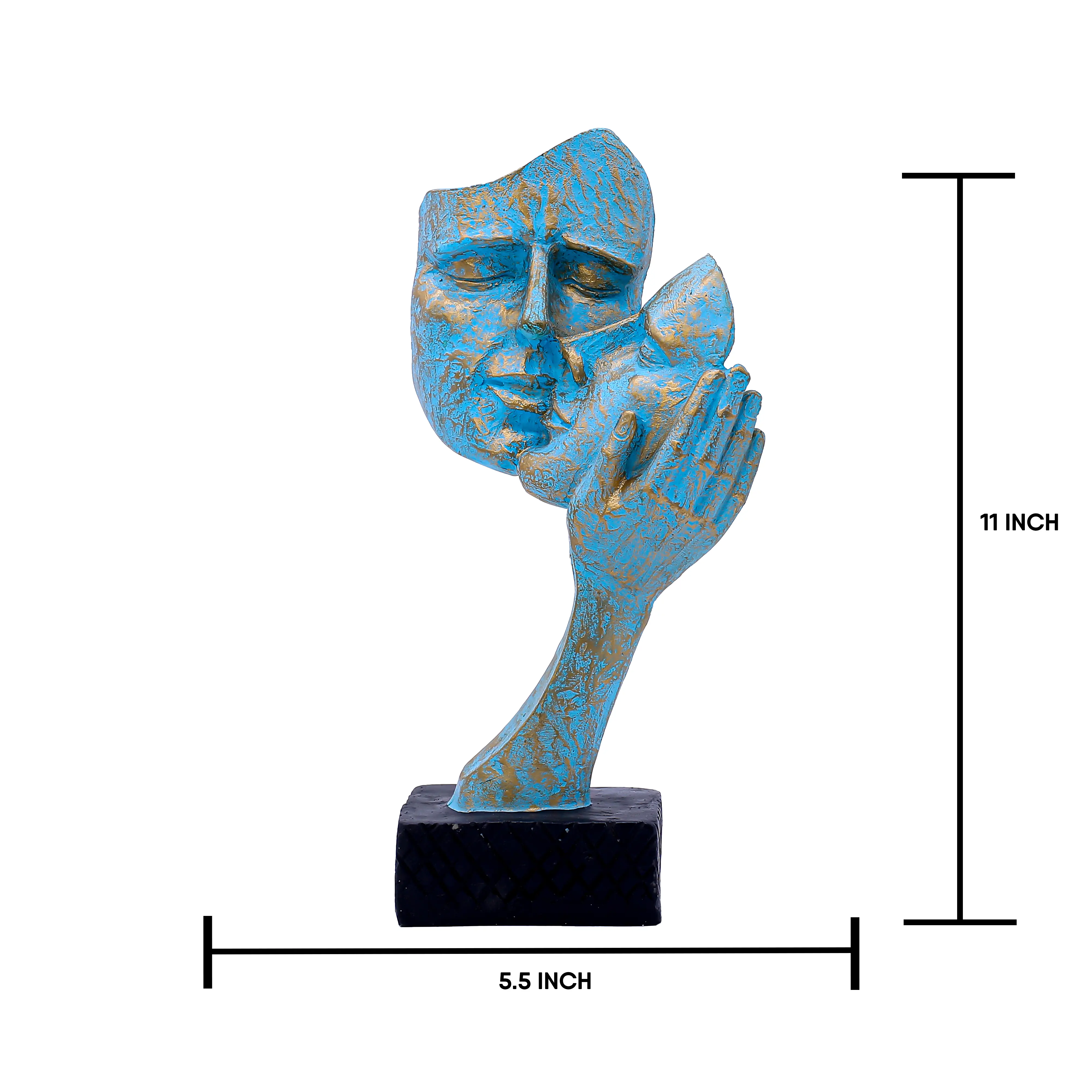 Exquisite Texture and Color The visual appeal of this statue lies in its intricate finish. It is not just painted; it is textured. The teal-blue portion of the face features a rough, weathered finish that mimics the look of oxidized copper or ancient stone artifacts found in a museum. This rustic matte texture creates a stunning contrast against the smooth, metallic gold leafing applied to the lips, nose, and the supporting hand. This interplay of "old" texture and "new" shine makes the piece versatile enough to fit into both vintage-inspired and ultra-modern homes.