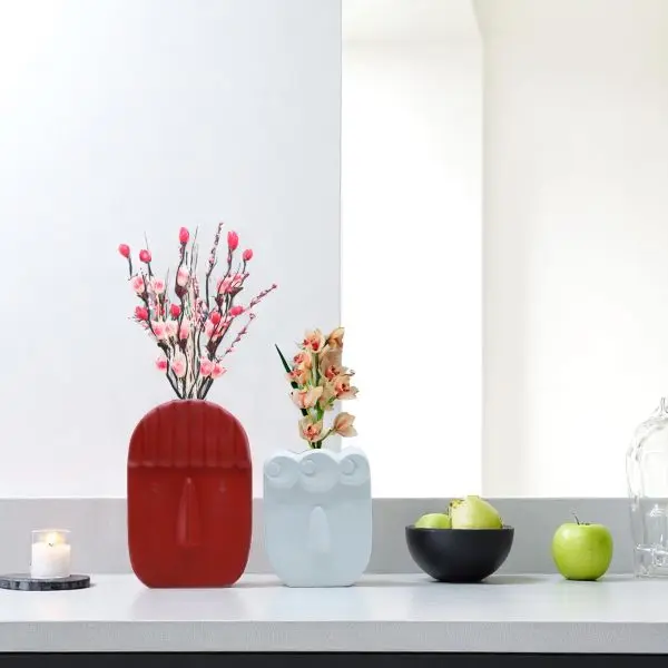Make a bold statement with this pair of abstract ceramic elephant sculptures. One finished in sleek, glossy black and the other in vibrant, high-gloss red, they symbolize strength, good luck, and prosperity. The modern, simplified forms with elegantly curled trunks offer a striking contrast. Ideal for adding a pop of color and sophistication to contemporary homes, office desks, or as an eye-catching accent on a minimalist shelf or mantle.