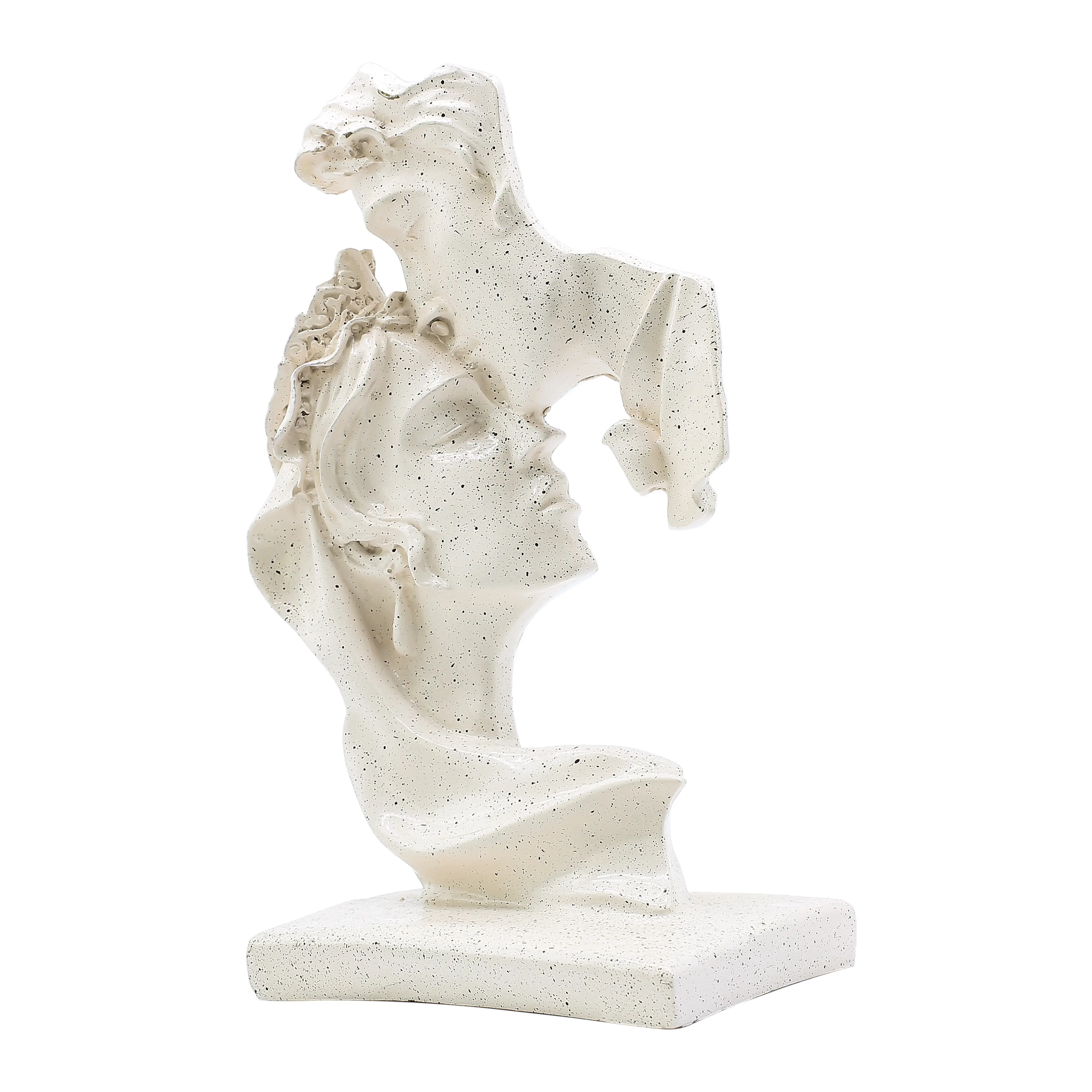 Sophisticated Material & Finish Crafted from robust polyresin, this statue is designed to stand the test of time. The finish is particularly noteworthy; instead of a glossy shine, it features a matte, textured white surface. This deliberate design choice mimics the raw, organic feel of plaster or limestone sculptures found in art museums. The rough texture catches the light beautifully, adding depth and dimension to the facial features. The sculpture is anchored by a solid black block base, which not only ensures stability but also elevates the white figure, making it pop against any background color.