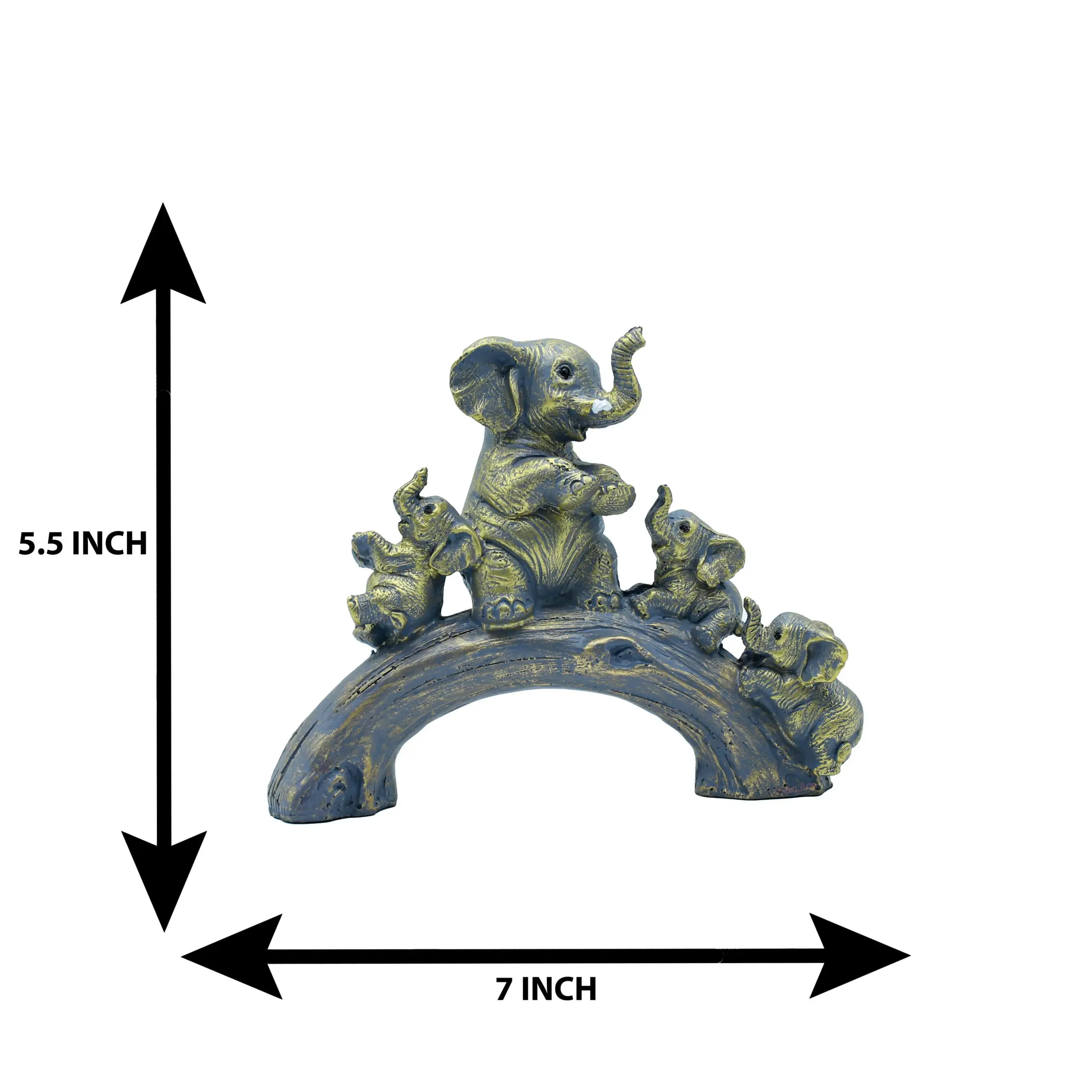 A Celebration of Family and Fun Bring a smile to your face every day with the Antique Bronze Resin Elephant Family Statue on Log. This exquisitely detailed figurine captures a candid moment in the wild, showcasing the strong, affectionate bond between a mother elephant and her calves. The composition is dynamic and full of life: the mother sits triumphantly in the center of a curved tree arch, trunk raised in a trumpet of joy, while three adorable babies climb the sides, eager to join the fun.