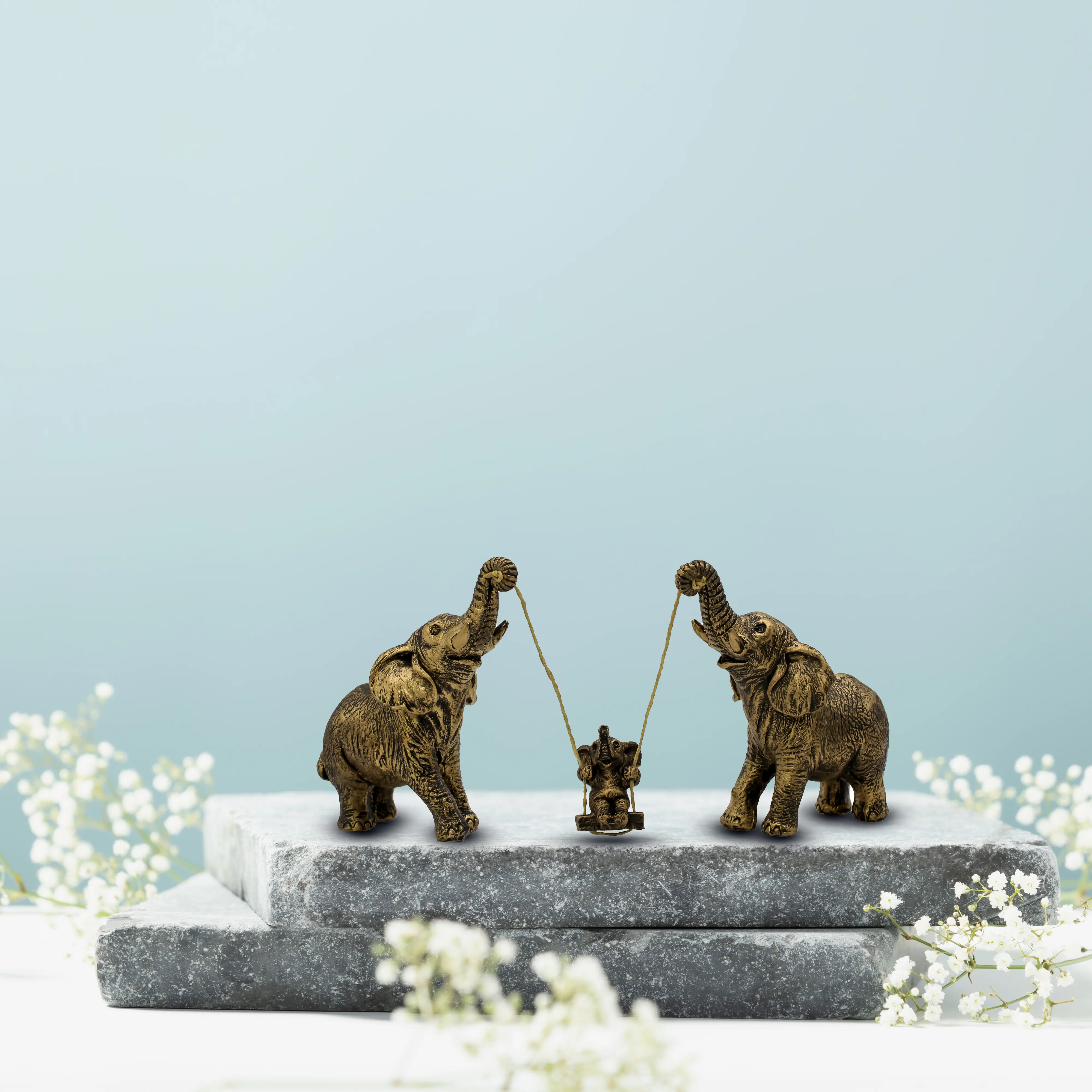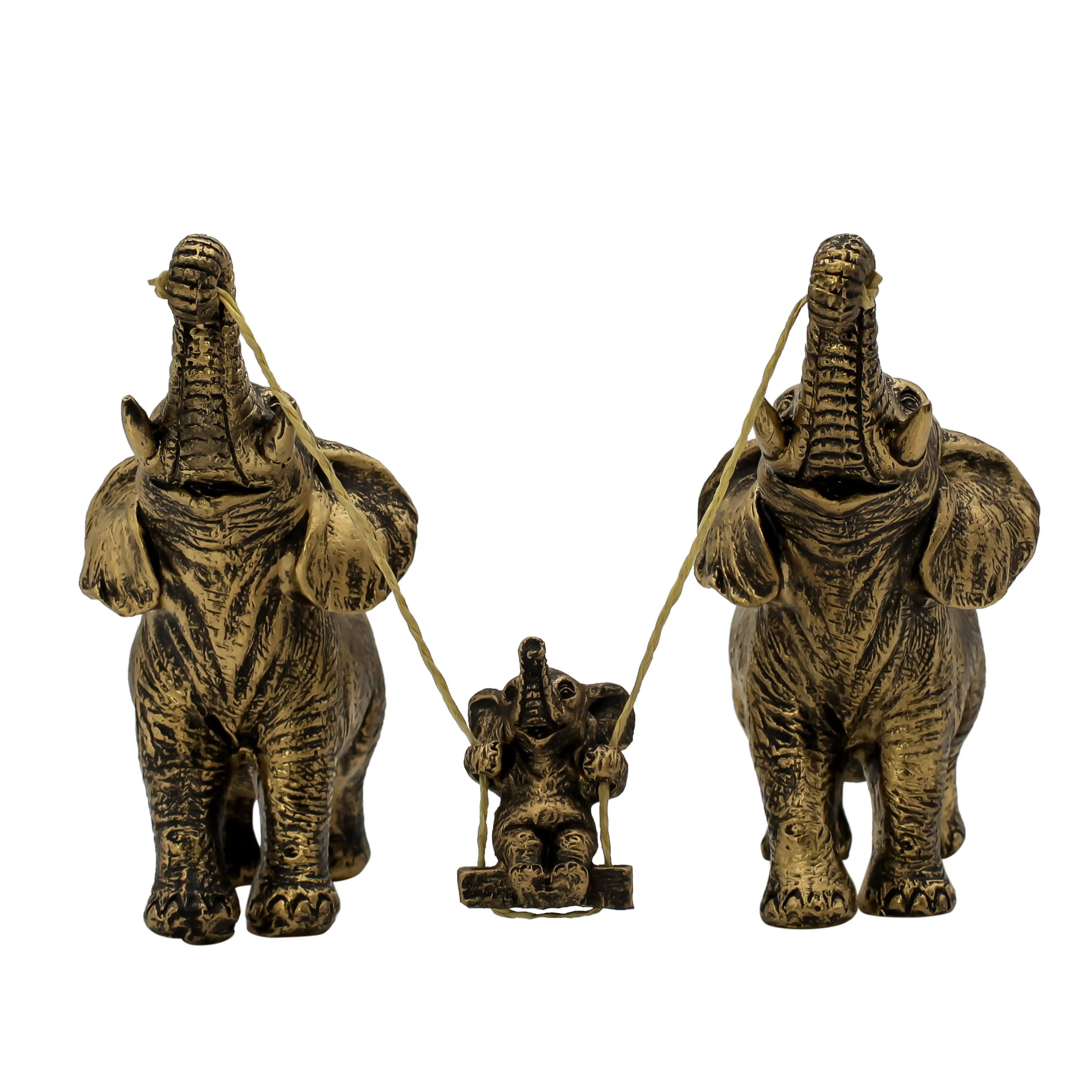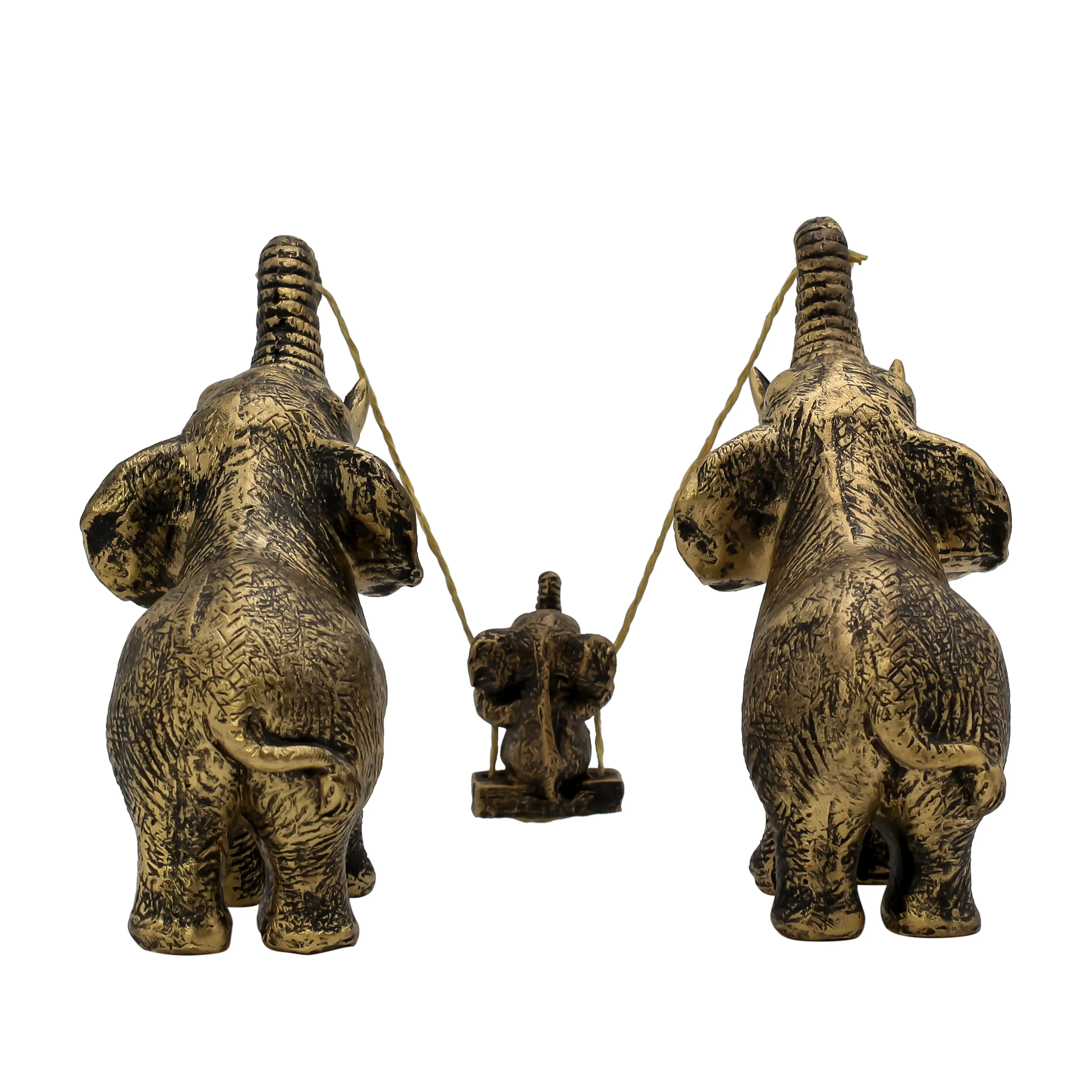 Elephants are famous for their strong family bonds and the way the entire herd cares for the young. Our Antique Gold Parents & Baby Elephant Swinging Statue perfectly encapsulates this spirit. It is a whimsical, artistic, and deeply emotional piece that celebrates the fun side of parenting and family life.