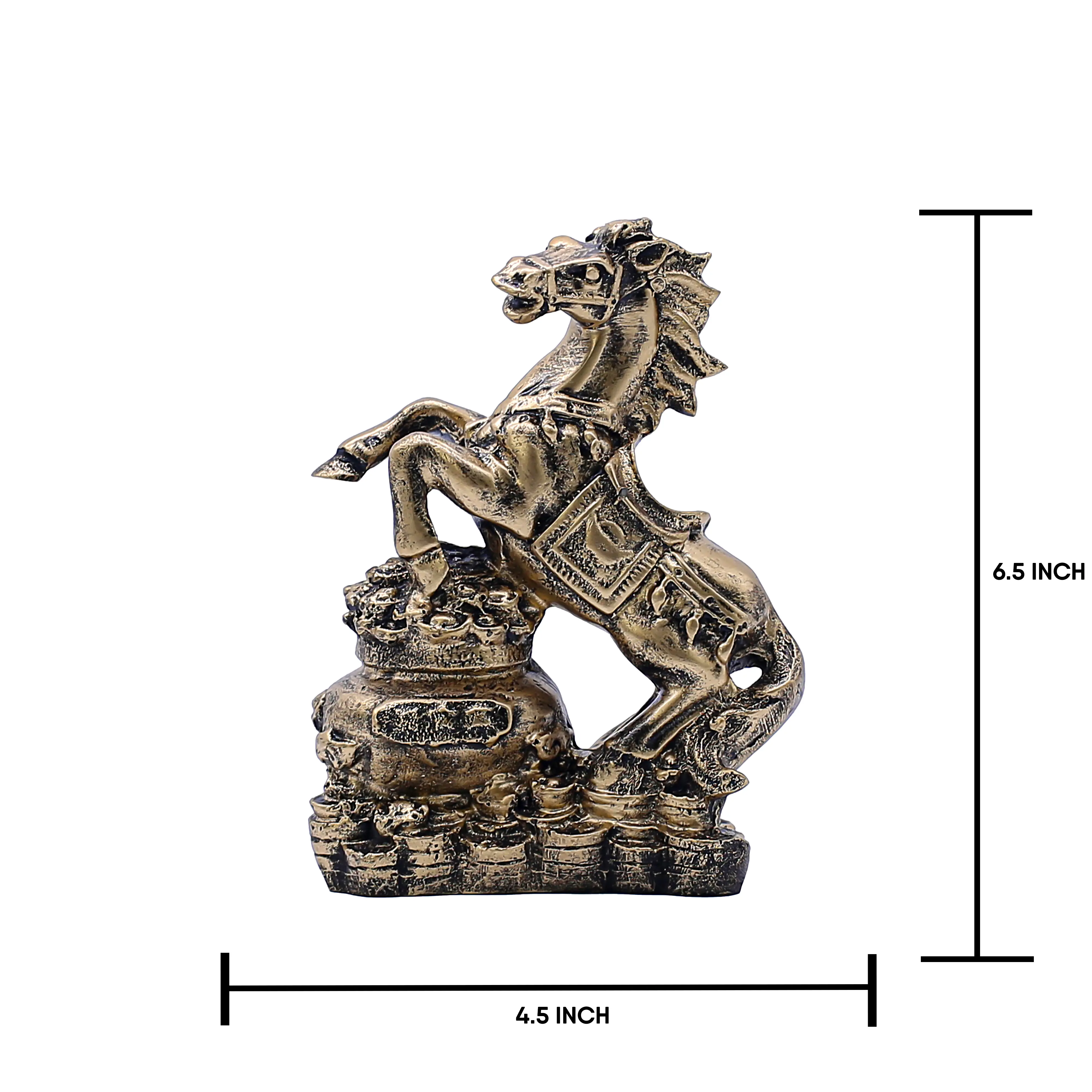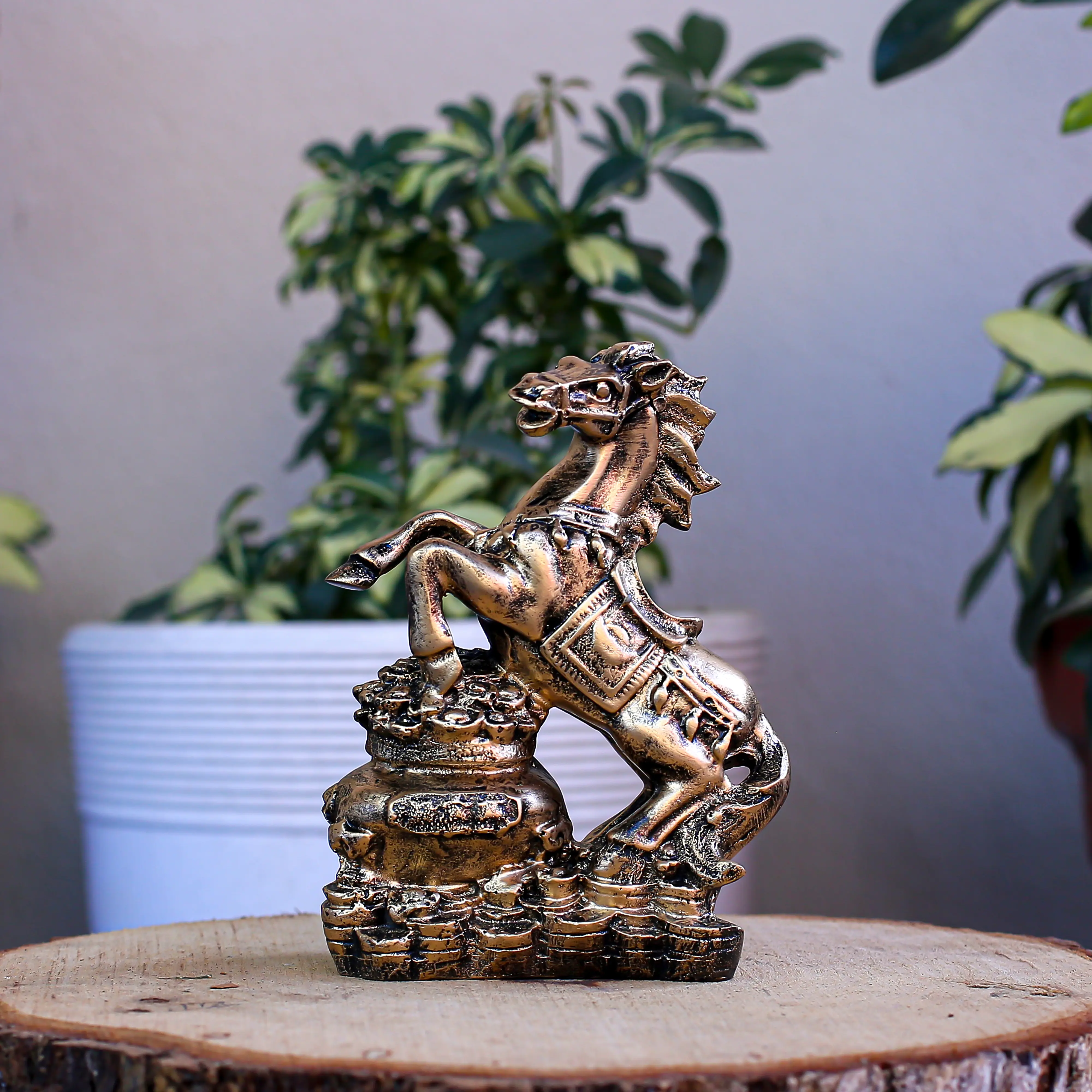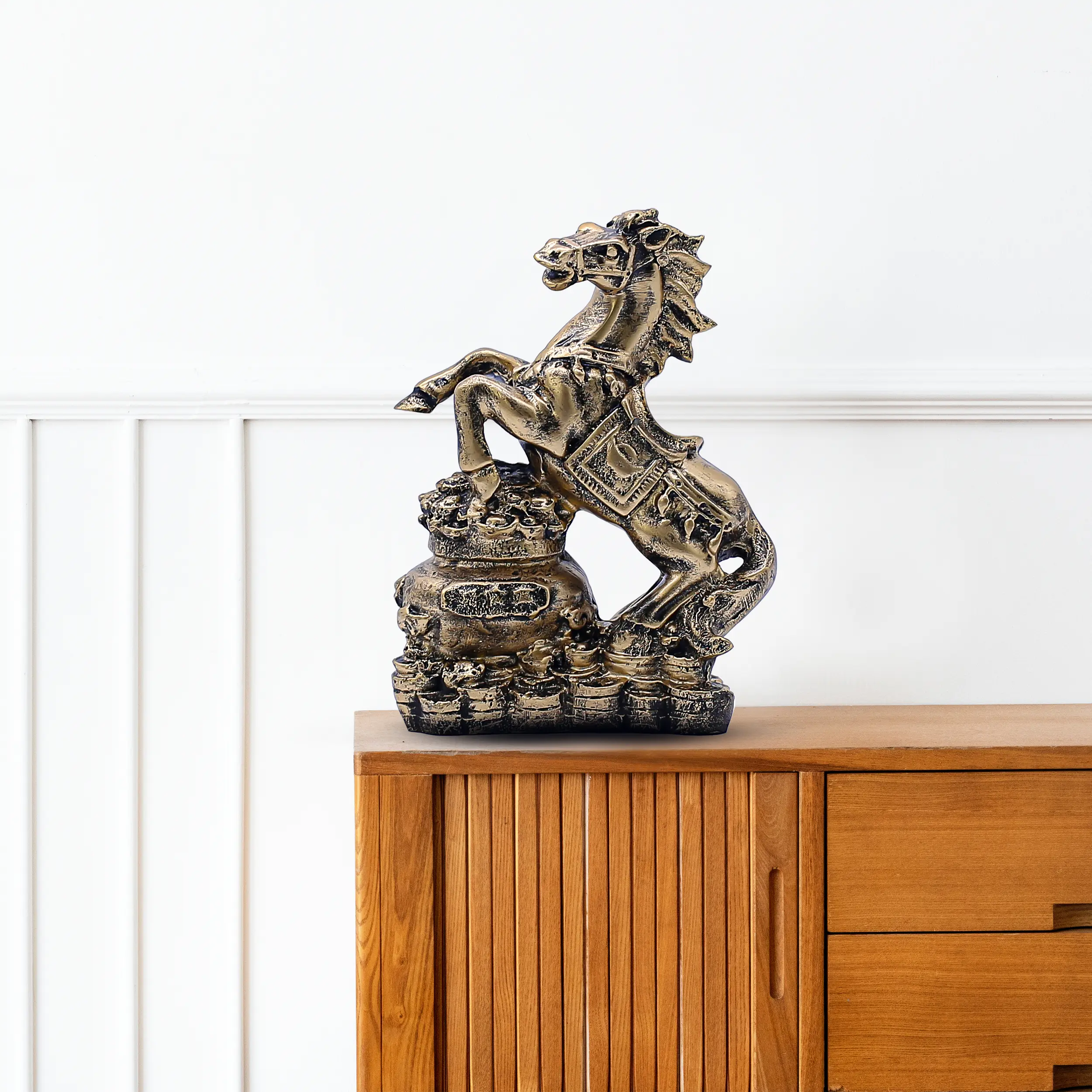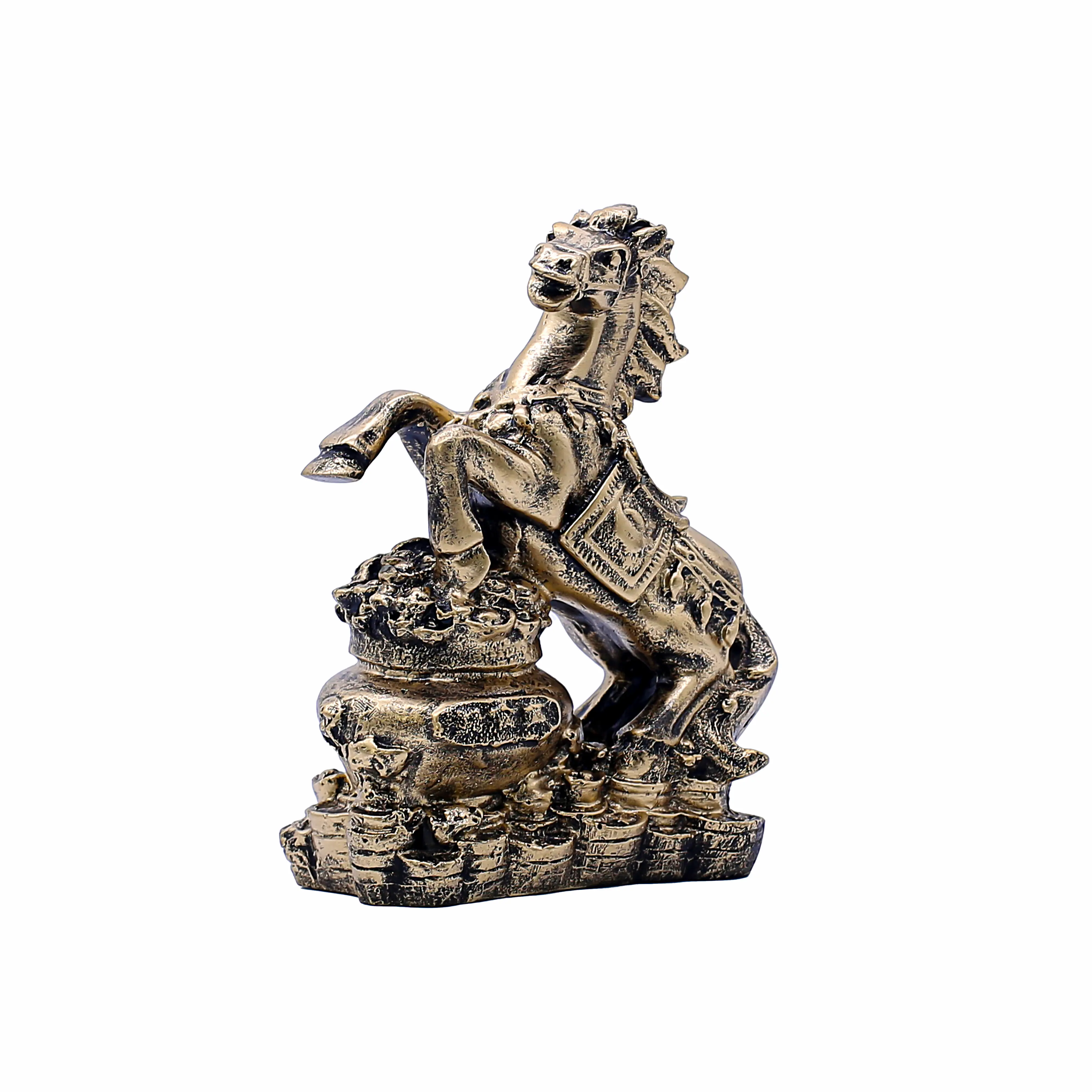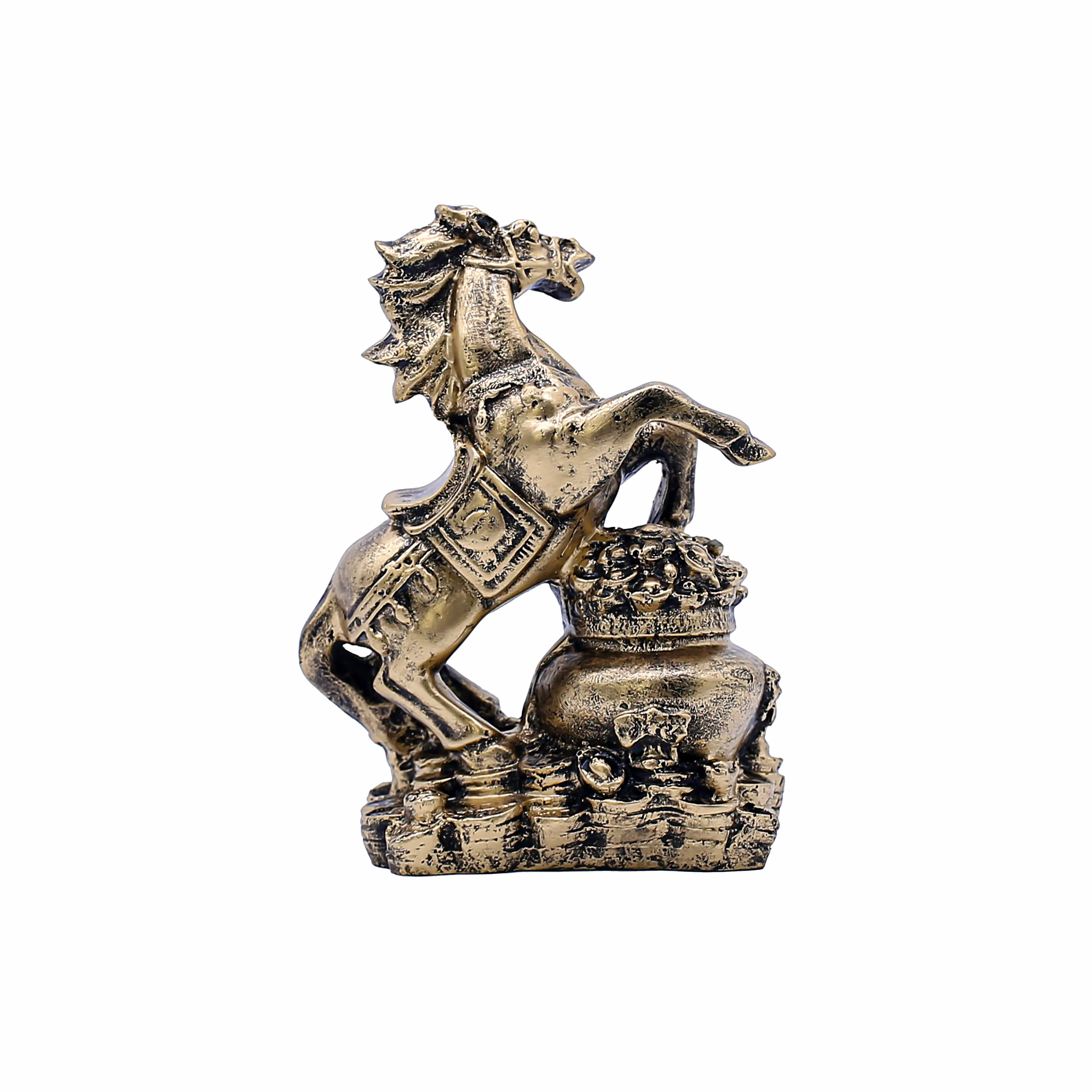 Bring prosperity, strength, and elegance into your space with this Antique Gold Horse with Coin Pot Resin Showpiece. The powerful rearing horse symbolizes speed, confidence, and success, while the coin pot represents wealth, abundance, and financial growth. Crafted from premium-quality resin, this décor piece features an antique gold finish with fine detailing that adds a royal and luxurious charm. Ideal for homes, offices, shops, reception desks, and business spaces, it enhances both aesthetics and positive energy. Widely used as a Vastu and Feng Shui décor item, this showpiece is believed to attract money flow and career growth. It also makes a thoughtful gift for Diwali, housewarming ceremonies, business inaugurations, corporate gifting, and festive occasions. Durable, elegant, and easy to maintain, it’s a perfect blend of style and symbolism.