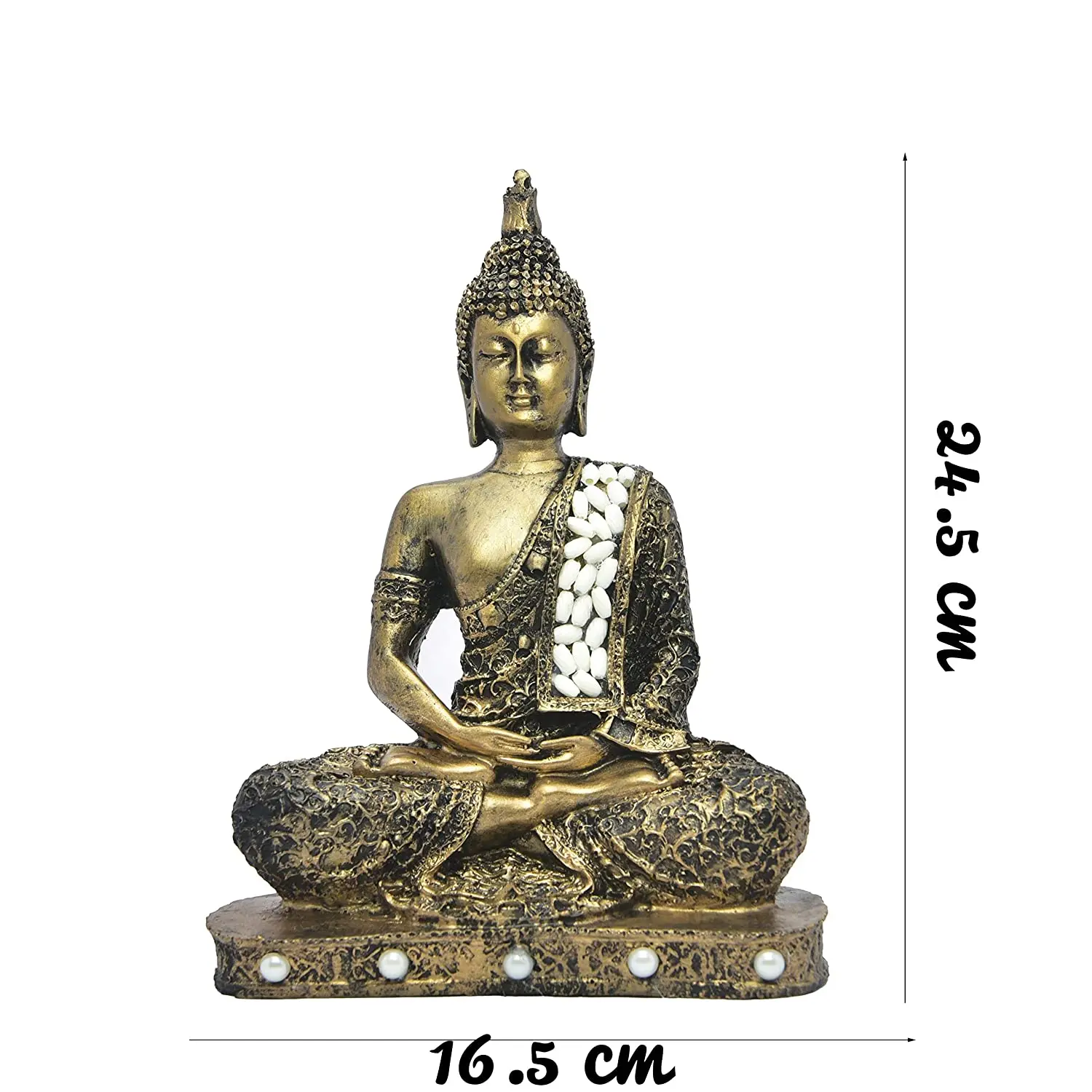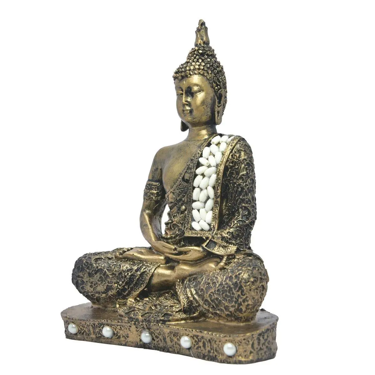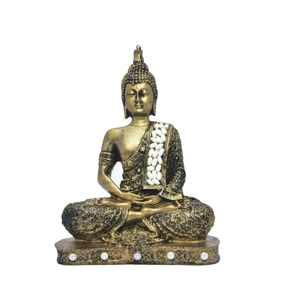 The Embellishments: The design is elevated by unique textures. A sash draped over the Buddha's left shoulder is studded with white, pebble-like stones, symbolizing purity. The base of the statue features a row of white faux pearls, adding a soft, luxurious touch to the rugged gold texture.