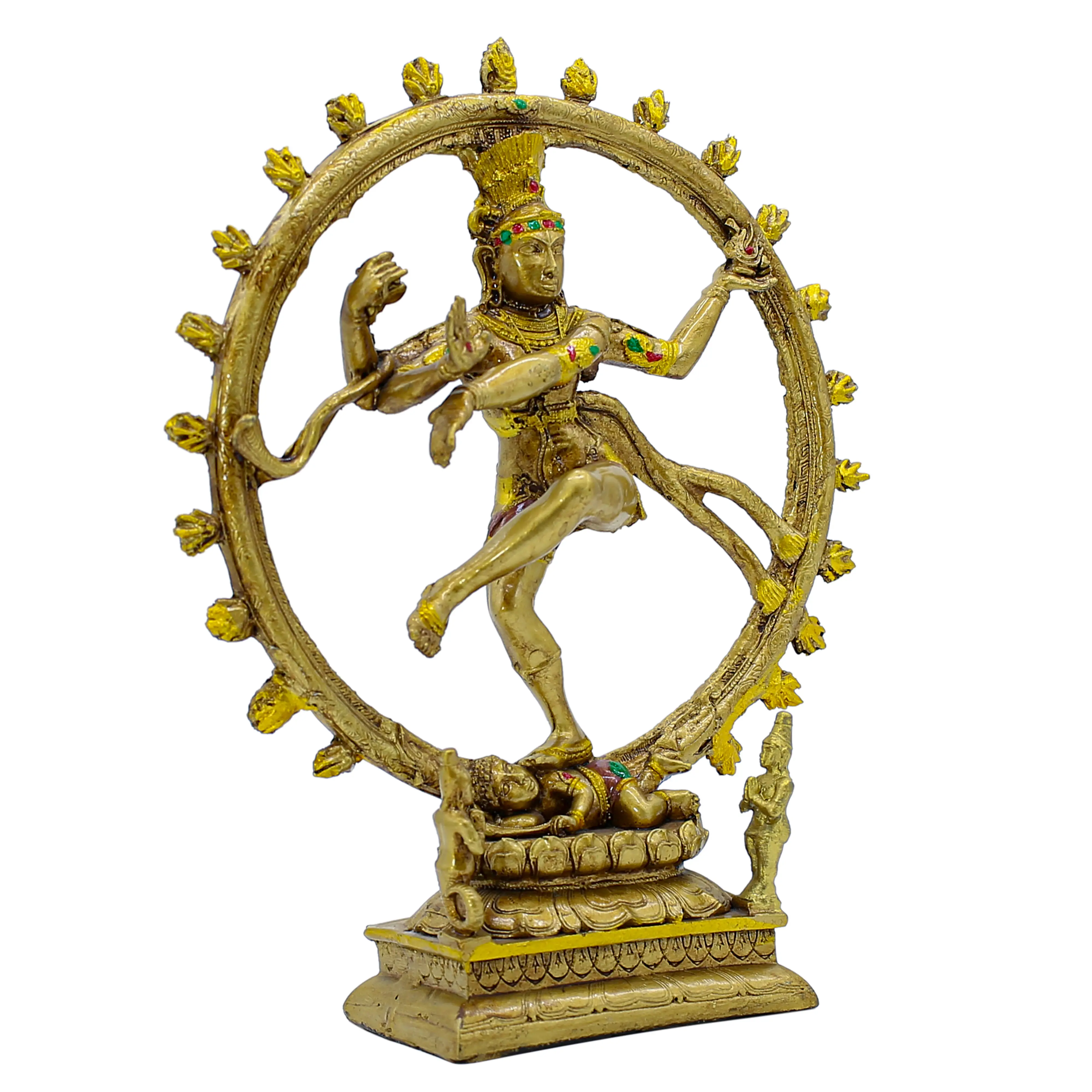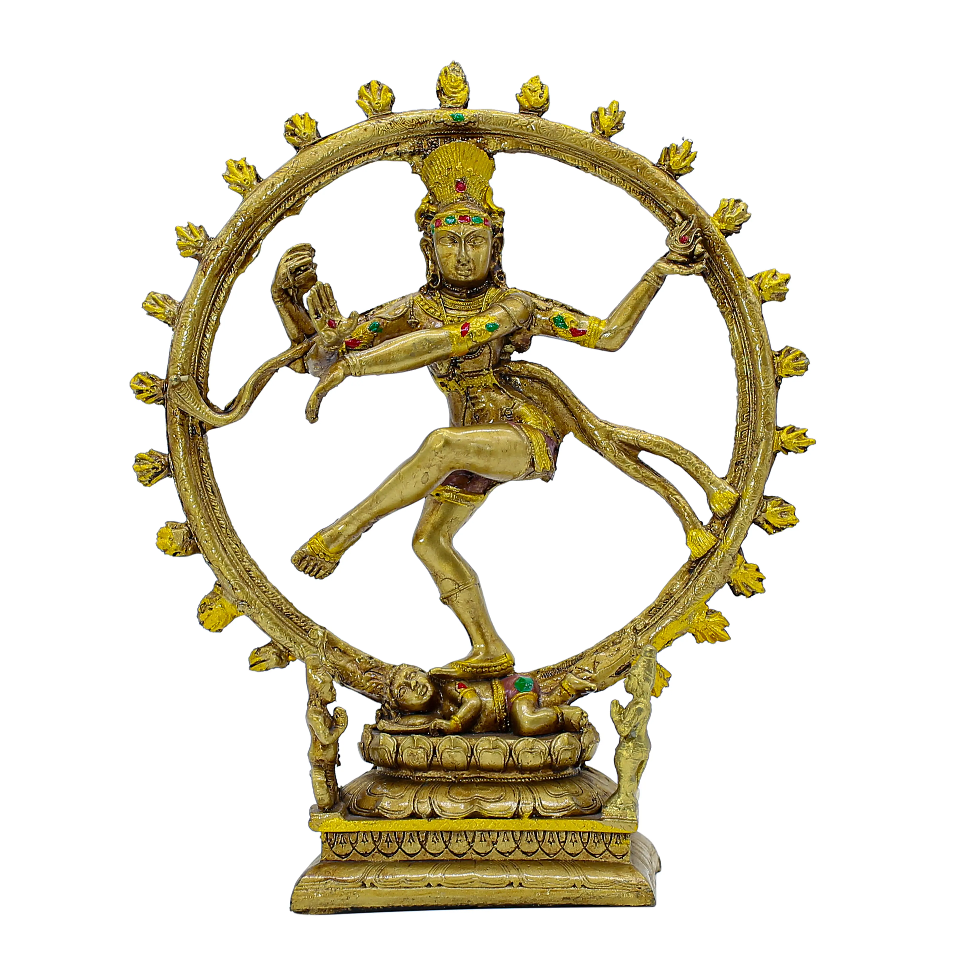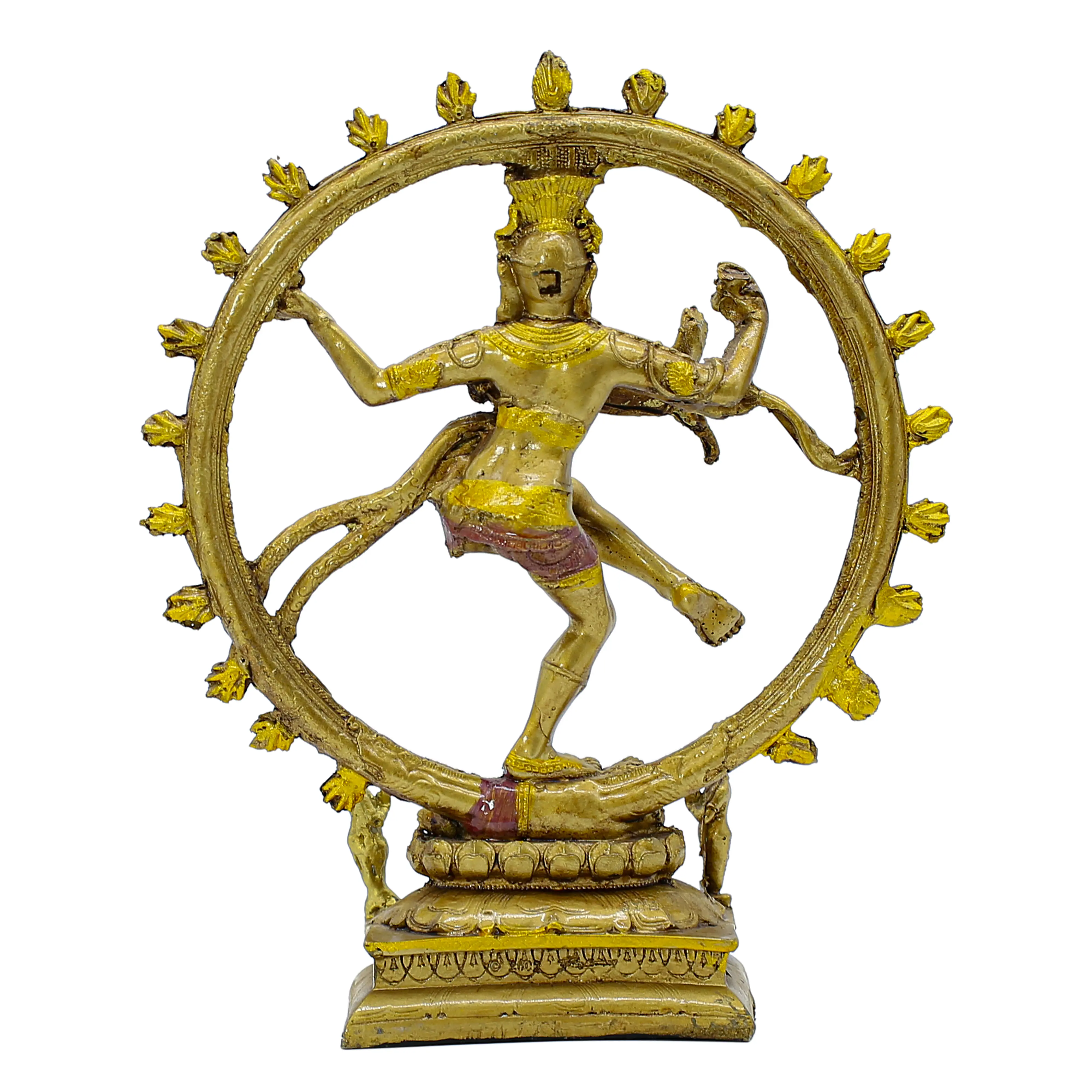 Exquisite Craftsmanship & Design This figurine is designed to replicate the grandeur of ancient Chola bronzes. It features the iconic Prabha Mandala—a ring of flames that encircles Shiva, representing the manifest universe. The deity is poised on one leg atop the dwarf demon Apasmara, symbolizing the suppression of ignorance and ego. The finish is a sophisticated antique gold, which provides a timeless, weathered look while catching the light to reveal the texture of the flames and the deity’s attire. Subtle touches of color on the jewelry add depth and contrast to the metallic sheen.