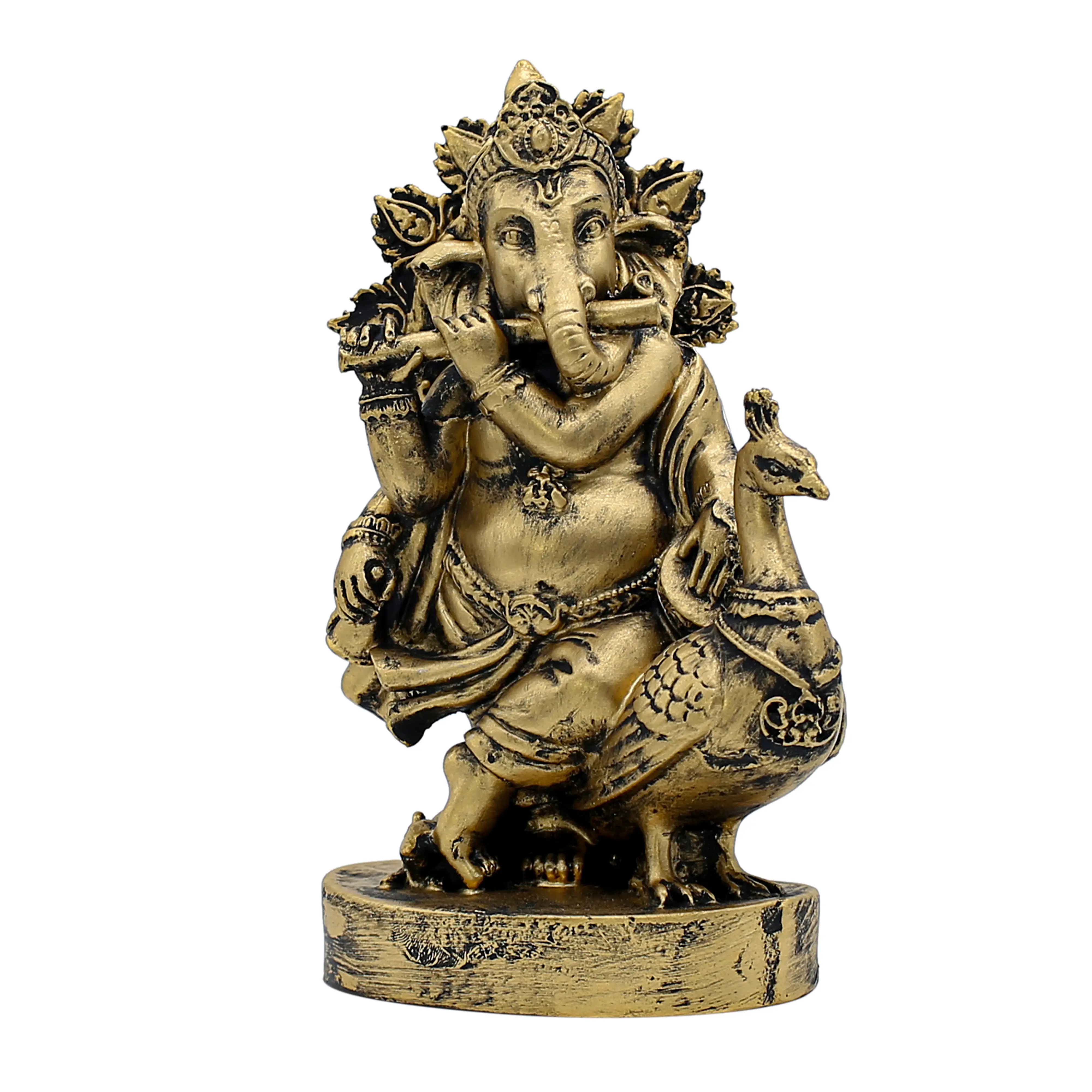 Material & Craftsmanship Crafted from premium quality Polyresin, this statue is designed to last. Resin allows for a level of detail that is difficult to achieve with stone or wood. From the intricate crown (mukut) on Ganesha’s head to the delicate feathers of the peacock standing by his side, every element is molded with precision. The statue is finished in a luxurious antique gold tone, giving it the heavy, opulent look of brass or bronze without the maintenance or weight. The subtle black antique shading adds depth, making the gold pop and giving the idol a timeless, vintage appeal.