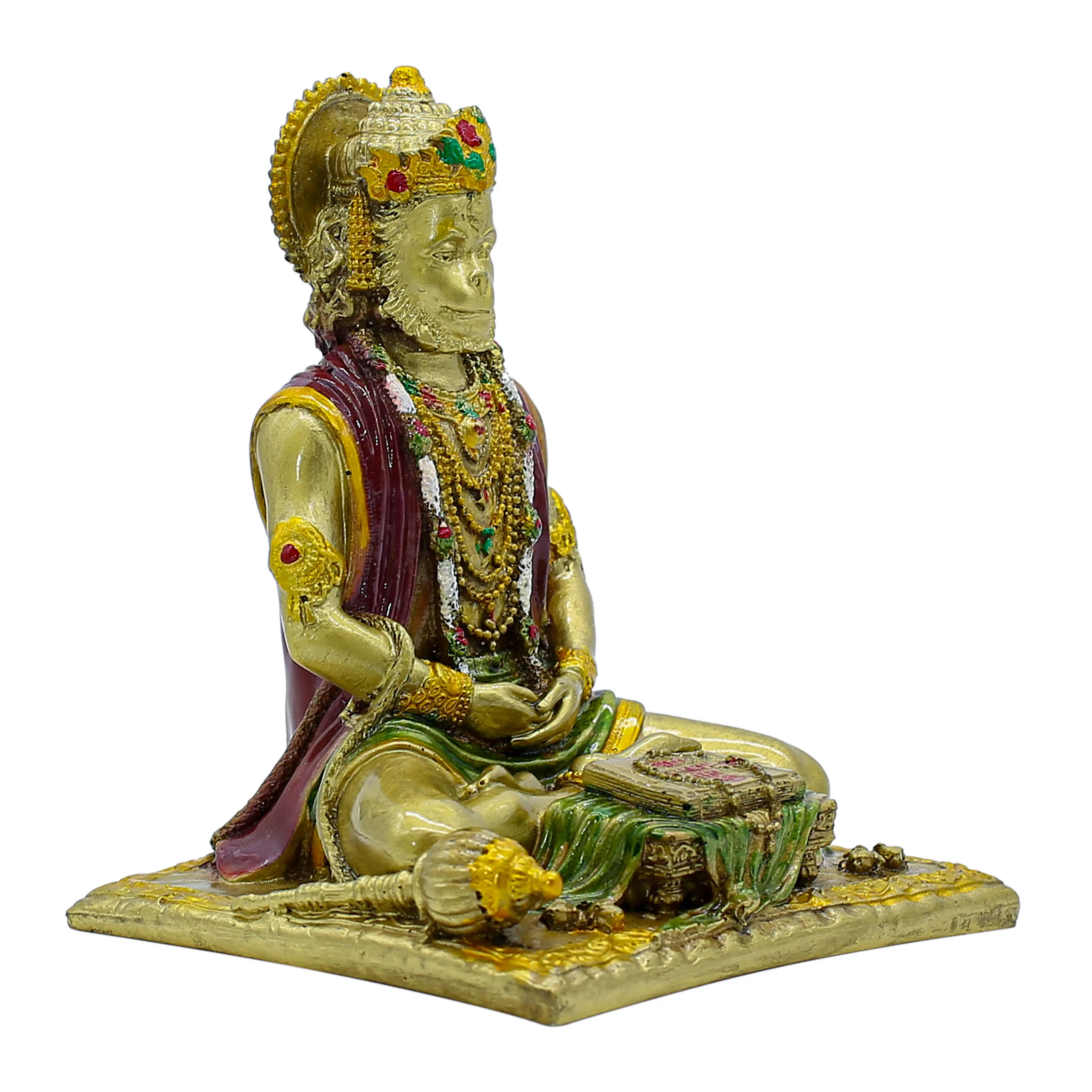 Artistic Excellence & Durability Made from high-grade Polyresin, this idol offers the weight and look of a metal statue without the high cost or risk of tarnishing. The base is finished in a timeless antique gold, which is meticulously hand-painted with vibrant accents. You can see the white floral garland around his neck, the deep red of his upper garment, and the emerald green of his dhoti. The attention to detail extends to the small "chowki" (stool) holding the book and the intricate patterns on the carpet base.