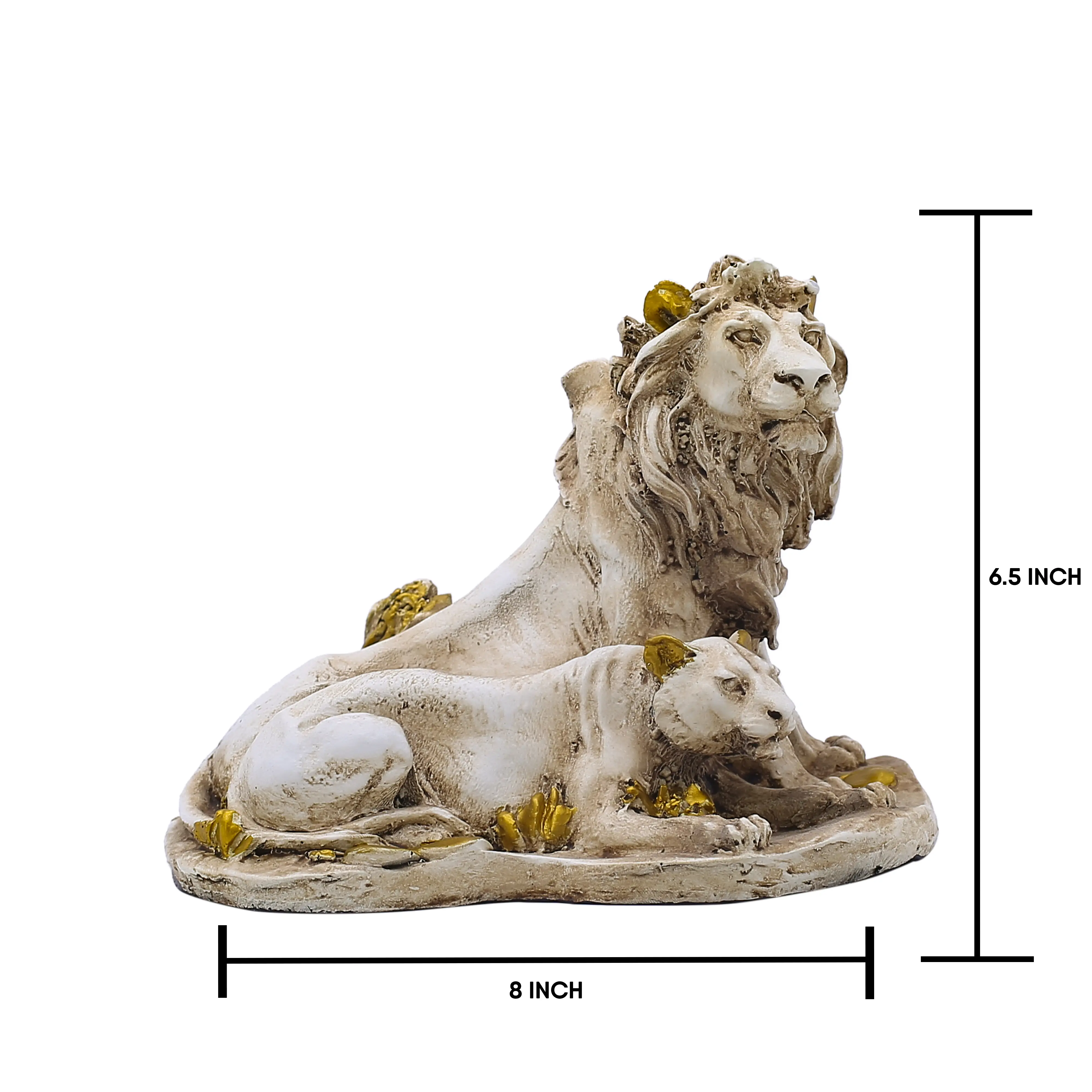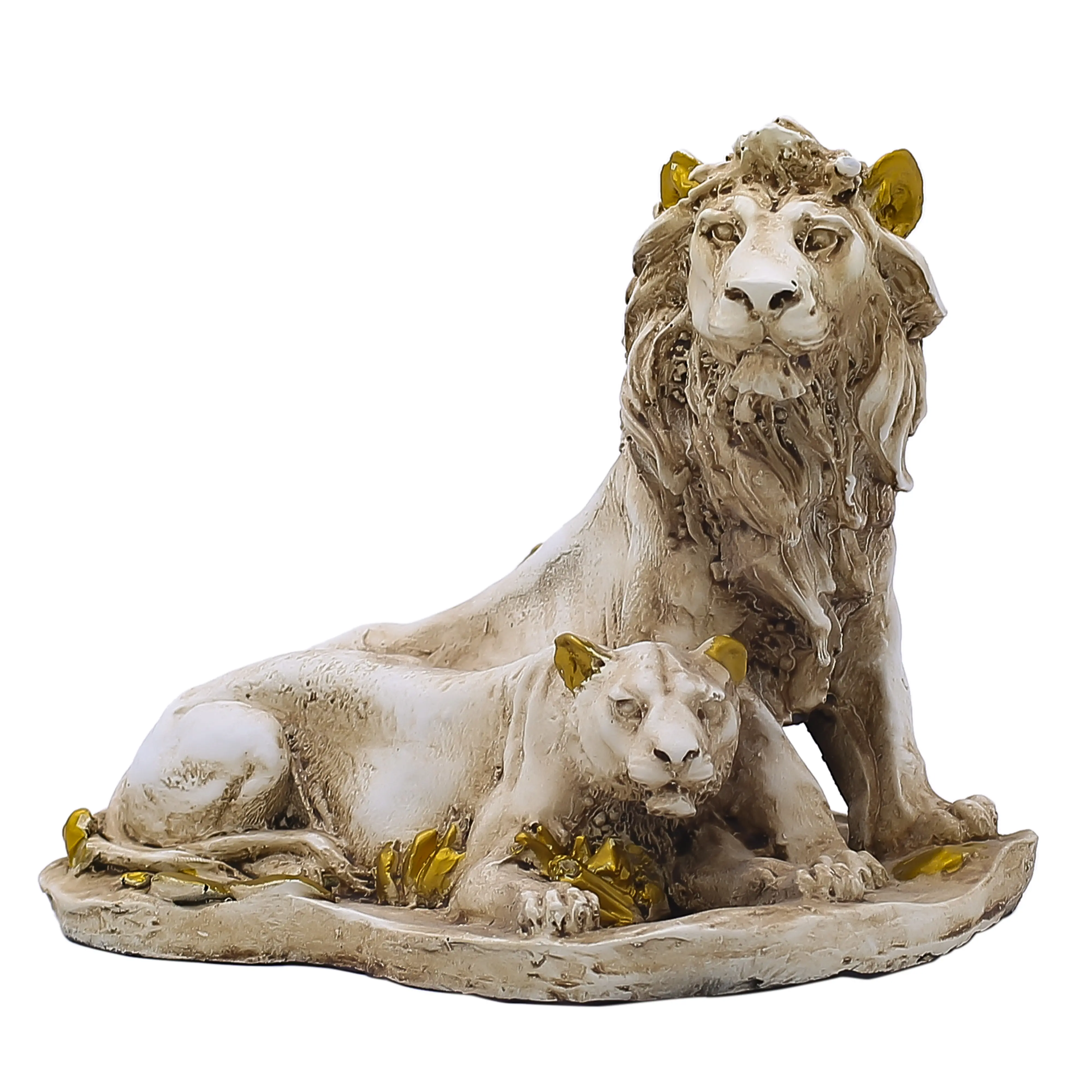 A Tribute to Love, Loyalty, and Royalty. Celebrate the bond you share with your significant other with the Antique White & Gold Lion & Lioness Couple Statue. This breathtaking sculpture captures the quiet intimacy of the jungle's most royal pair. The male lion sits tall and alert, acting as a stoic guardian, while the female lioness lies relaxed in front of him, leaning into his protection. The finish is a sophisticated blend of rustic and glam. The weathered white body gives it a timeless, classic look, while the shimmering gold highlights on the mane and base add a layer of luxury. Whether serving as a centerpiece for your living room or a symbolic accent in your bedroom, this statue is a daily reminder that you are stronger together.
