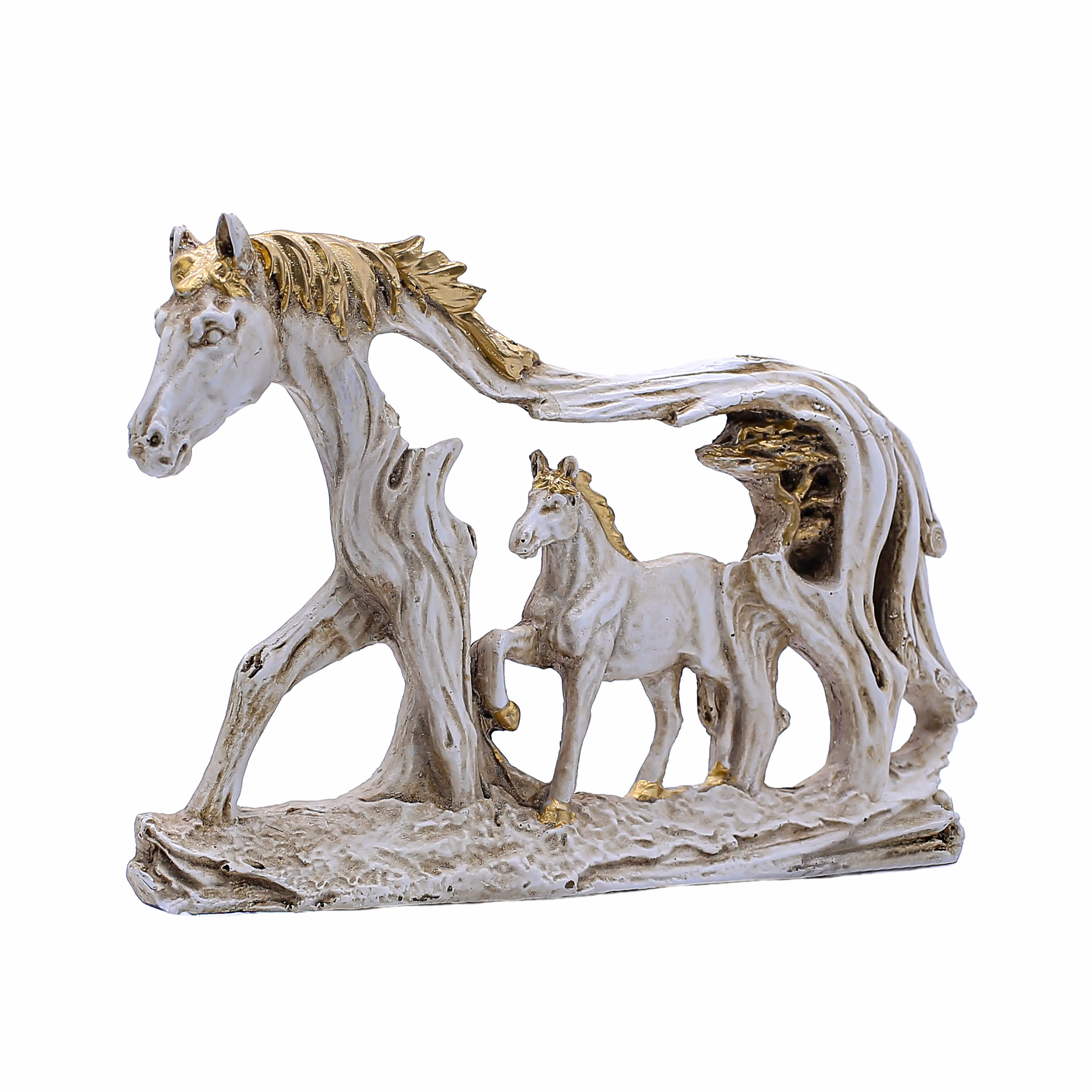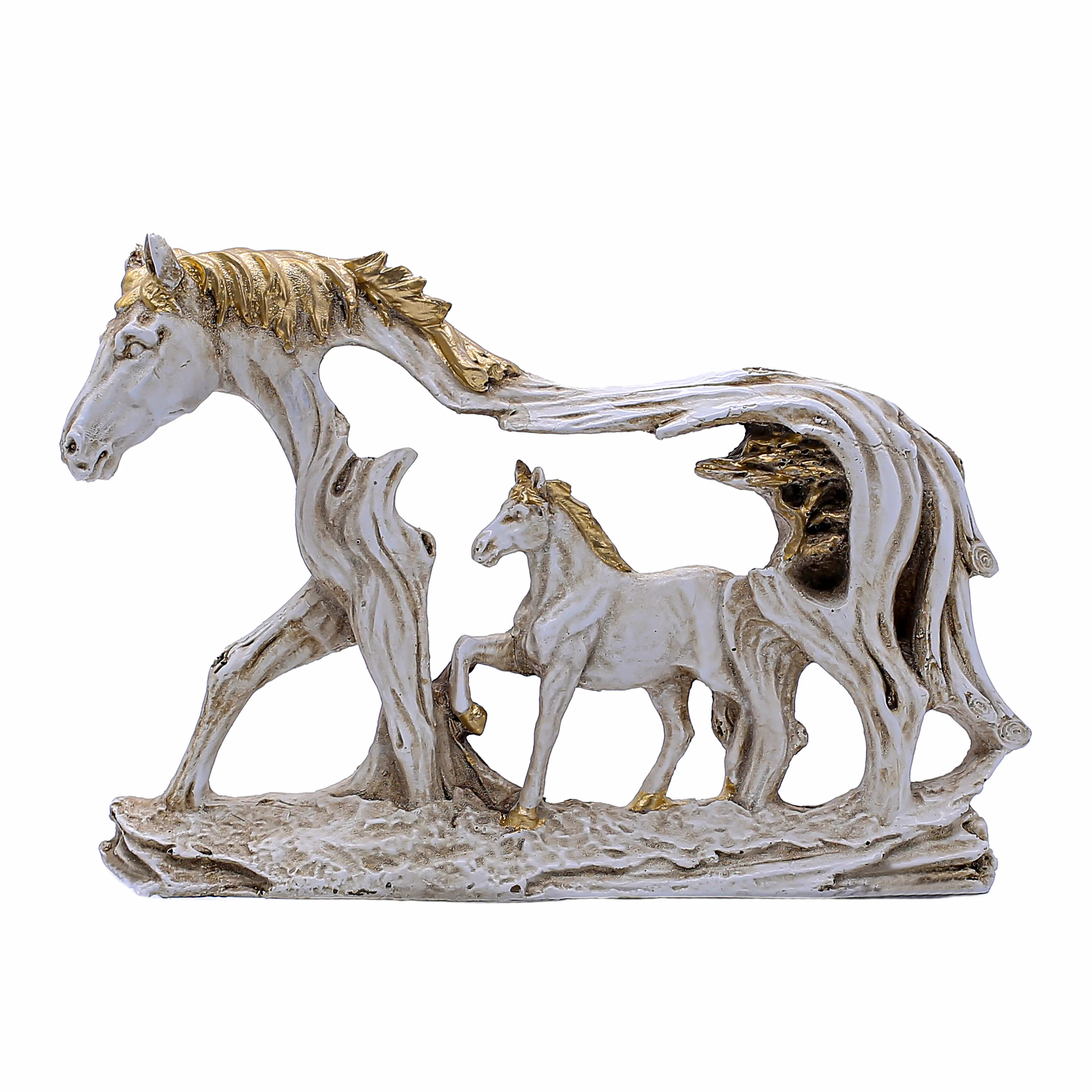 A Masterpiece of Craftsmanship Meticulously cast in high-quality polyresin, this wall décor mimics the look of carved stone or ivory but with the durability of modern resin. The "Antique White" finish provides a soft, matte look that radiates elegance, while the expertly applied gold detailing on the flowing mane and tail highlights the dynamic movement of the horses. The abstract design, where the mother horse’s body curves protectively over the foal, tells a beautiful story of maternal love and guidance.