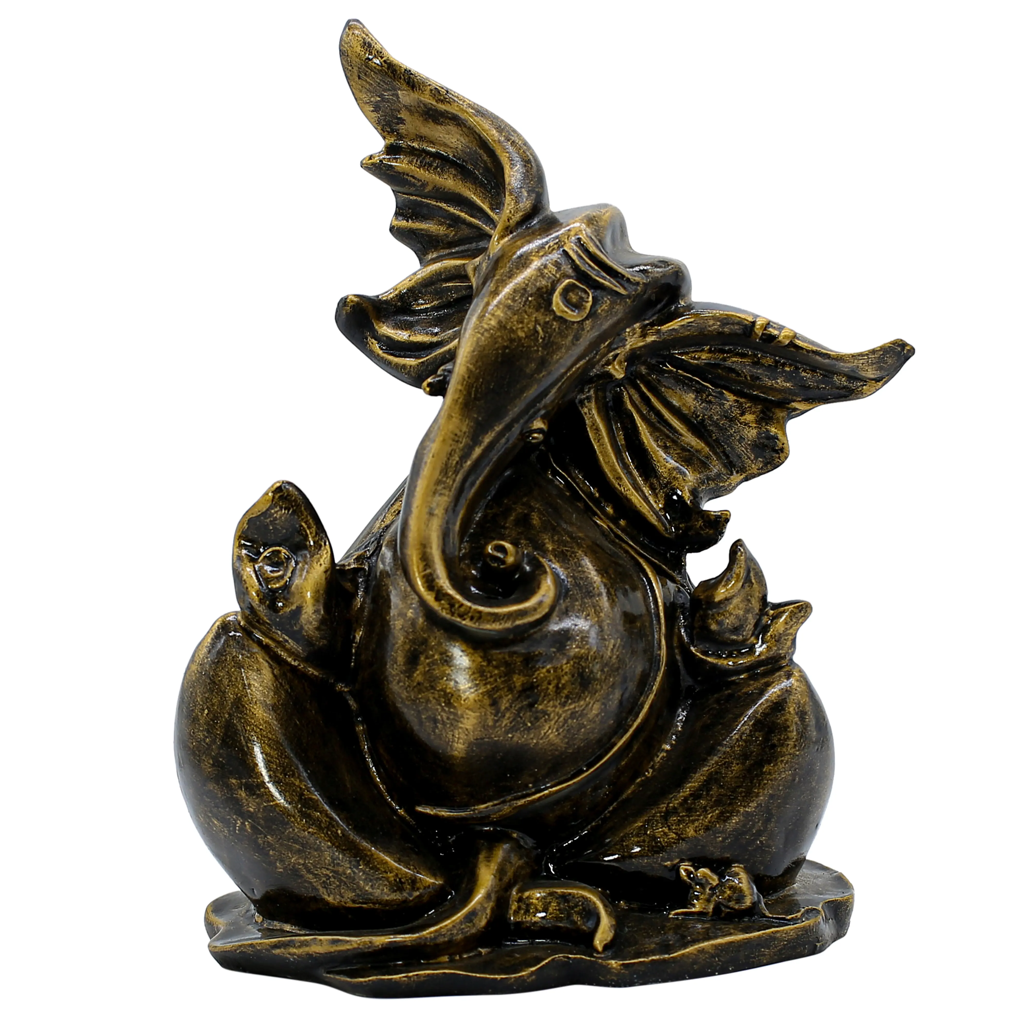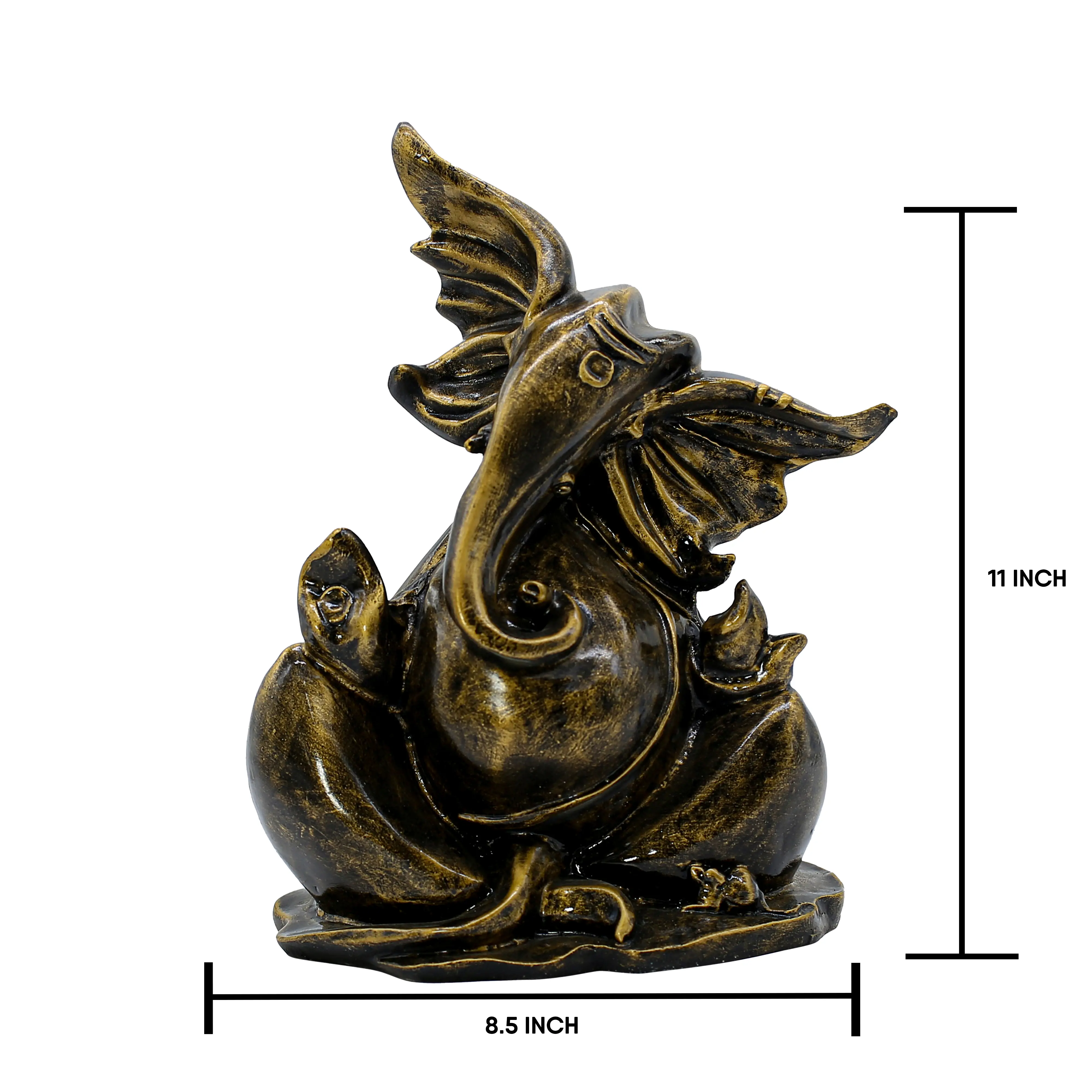 Exquisite Antique Finish The statue mimics the look of heavy, expensive metalwork. The antique bronze body provides a dark, earthy canvas, while the brushed gold accents on the face, trunk, and jewelry add a touch of divine glow. This dual-tone effect gives the piece depth and character, ensuring it looks premium from every angle. Unlike bright, multi-colored idols, this monochromatic scheme exudes a sense of calm and maturity.