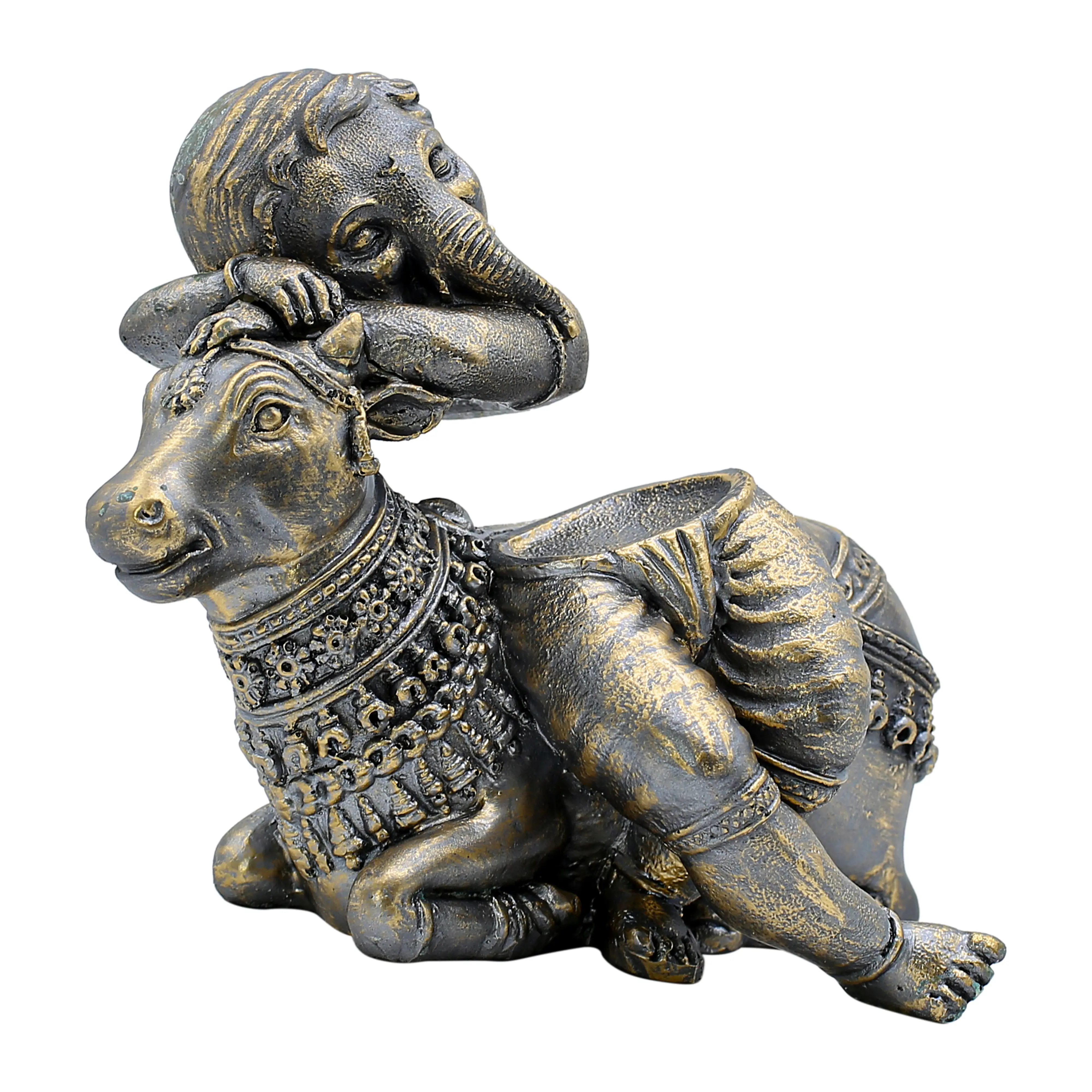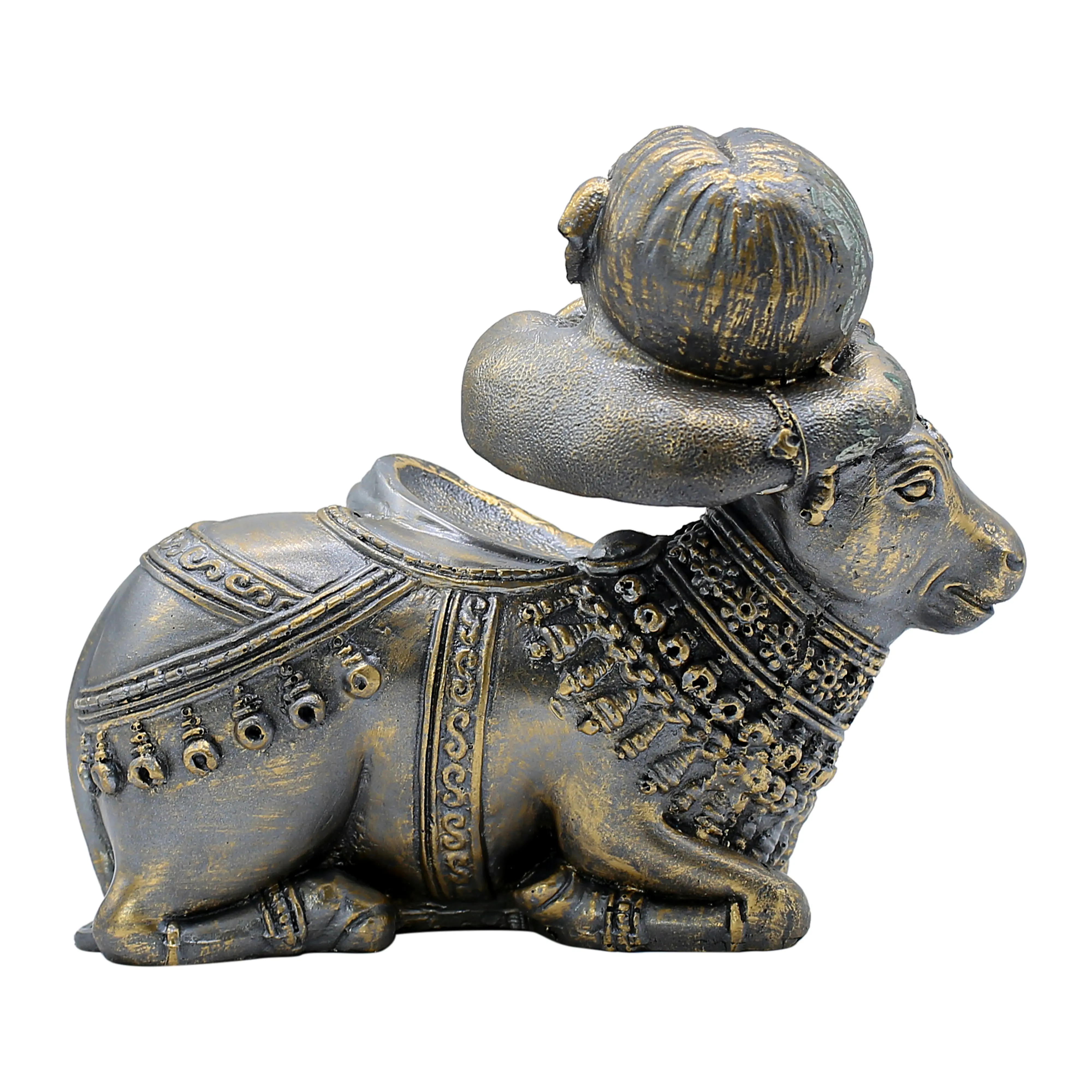 Crafted from premium quality resin, this Ganpati murti offers excellent durability while remaining lightweight and easy to place. Resin material allows intricate detailing, clearly visible in the facial expressions, ornaments, textures, and posture of both Baby Ganesha and Nandi. The antique black and gold finish enhances its traditional yet luxurious look, making it a standout spiritual decor piece.