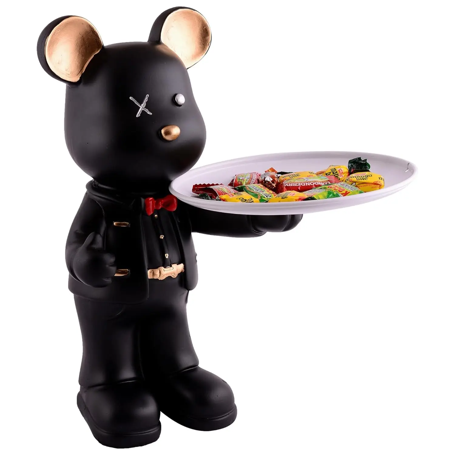 Upgrade your organization game with our Black Bear Butler Statue with Tray. This isn't just a figurine; it's your personal assistant for keeping clutter at bay. The statue depicts a stylish bear character dressed like a gentleman with a Red Bow Tie and gold buttons, standing in a welcoming pose. The design is packed with personality. From the Gold Heart Balloon held in its right hand to the quirky "X" eye detail, it exudes a modern, artistic flair that appeals to fans of pop culture and urban art. The White Serving Tray is perfectly positioned to hold your valuables—as seen in the image, it easily accommodates a wristwatch and accessories. Whether you place it in your foyer to catch keys or on your desk to hold office supplies, this bear brings a smile and a sense of order to your daily routine.