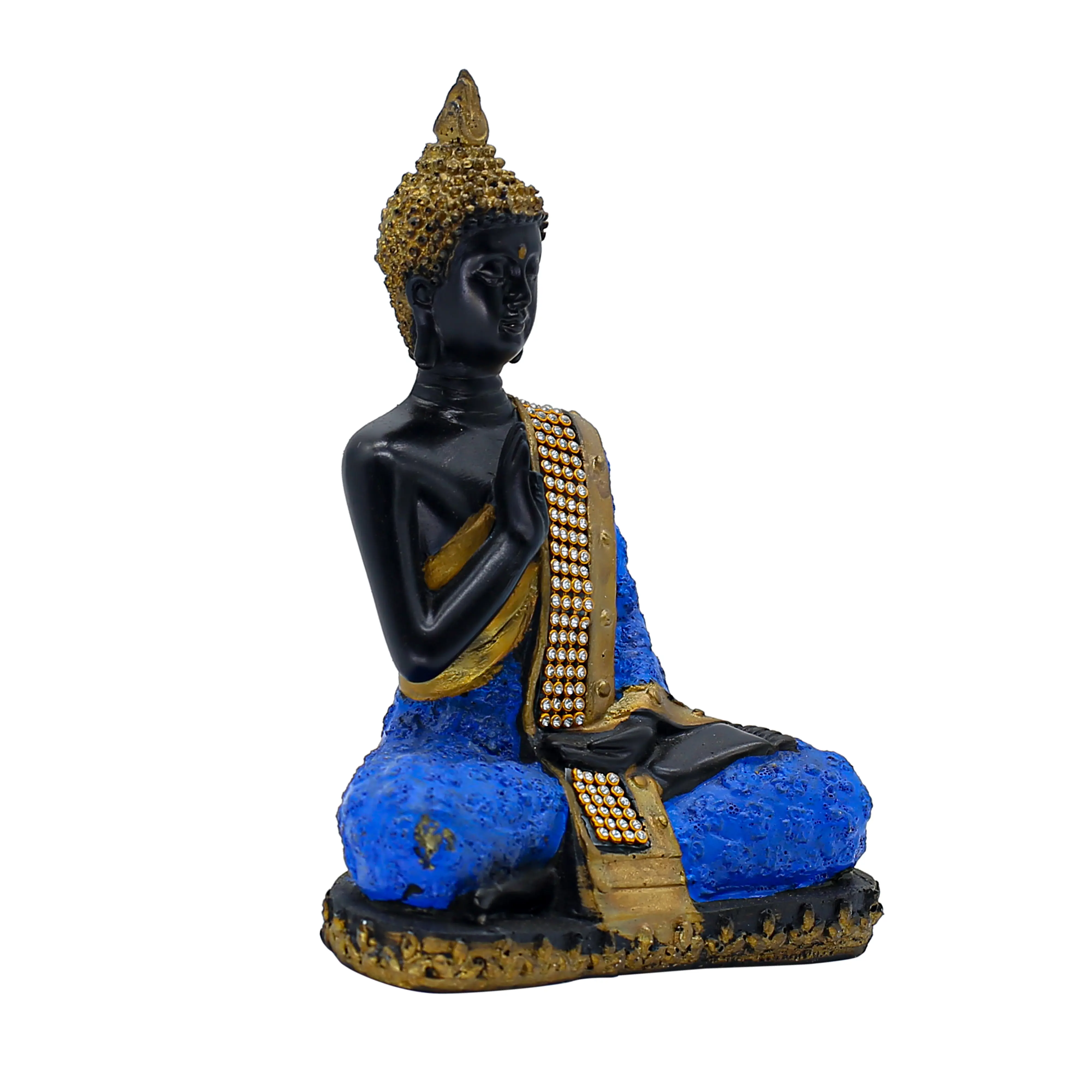 Add serenity and elegance to your interiors with this Black & Blue Meditating Buddha Resin Statue. Beautifully handcrafted, this Buddha idol features a calm meditative posture symbolizing peace, mindfulness, and positive energy. The striking combination of deep black with royal blue and gold detailing creates a modern yet spiritual appeal. Made from premium-quality resin, this statue is lightweight, durable, and easy to maintain. It is perfect for home décor, office desks, meditation rooms, yoga studios, temples, and reception areas. As per Vastu and Feng Shui beliefs, a meditating Buddha statue helps reduce stress and attract harmony and positivity. An excellent choice for housewarming, Diwali, weddings, anniversaries, and spiritual gifting, this Buddha showpiece blends devotion with contemporary design, making it a timeless décor piece. ✔ Premium Resin Material – Durable, lightweight & long-lasting ✔ Elegant Black & Blue Finish with gold accents ✔ Meditating Buddha Posture symbolizing peace & enlightenment ✔ Ideal for Home, Office, Temple, Yoga & Meditation Rooms ✔ Suitable for Vastu & Feng Shui Décor Placement ✔ Perfect Gift for Diwali, Housewarming & Spiritual Occasions ✔ Handcrafted with detailed artistic workmanship ✔ Easy to clean & low maintenance ✔ Enhances modern, luxury & traditional interiors