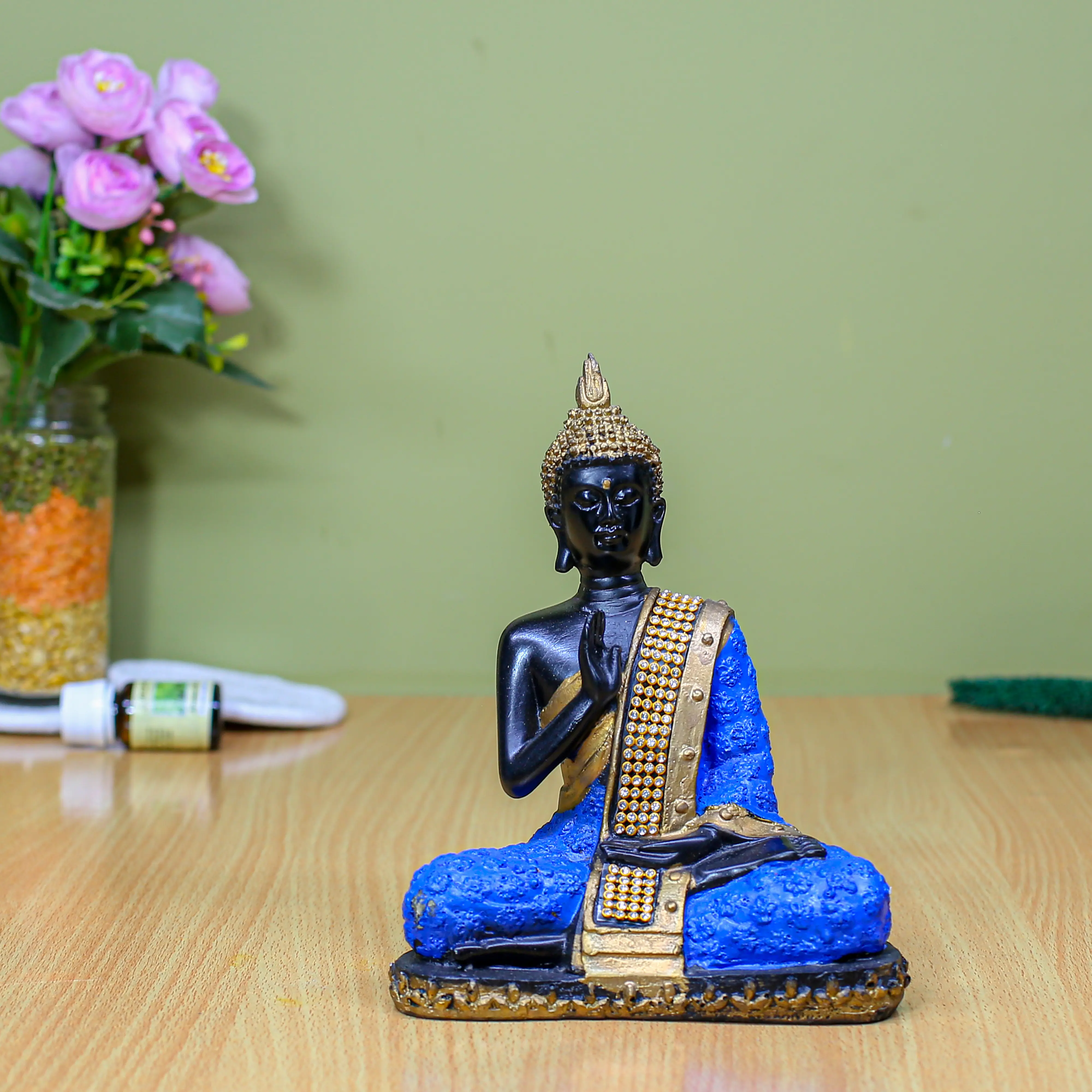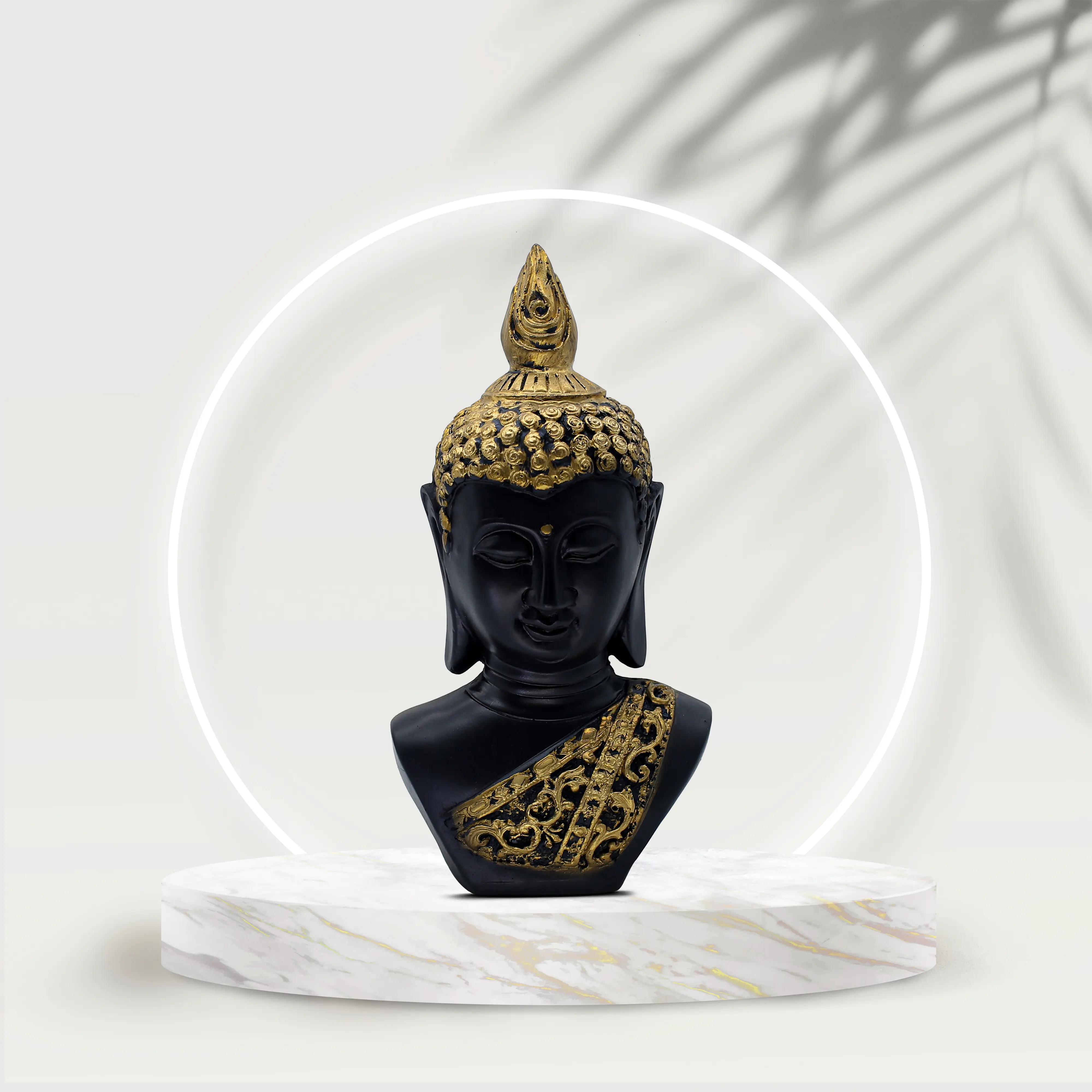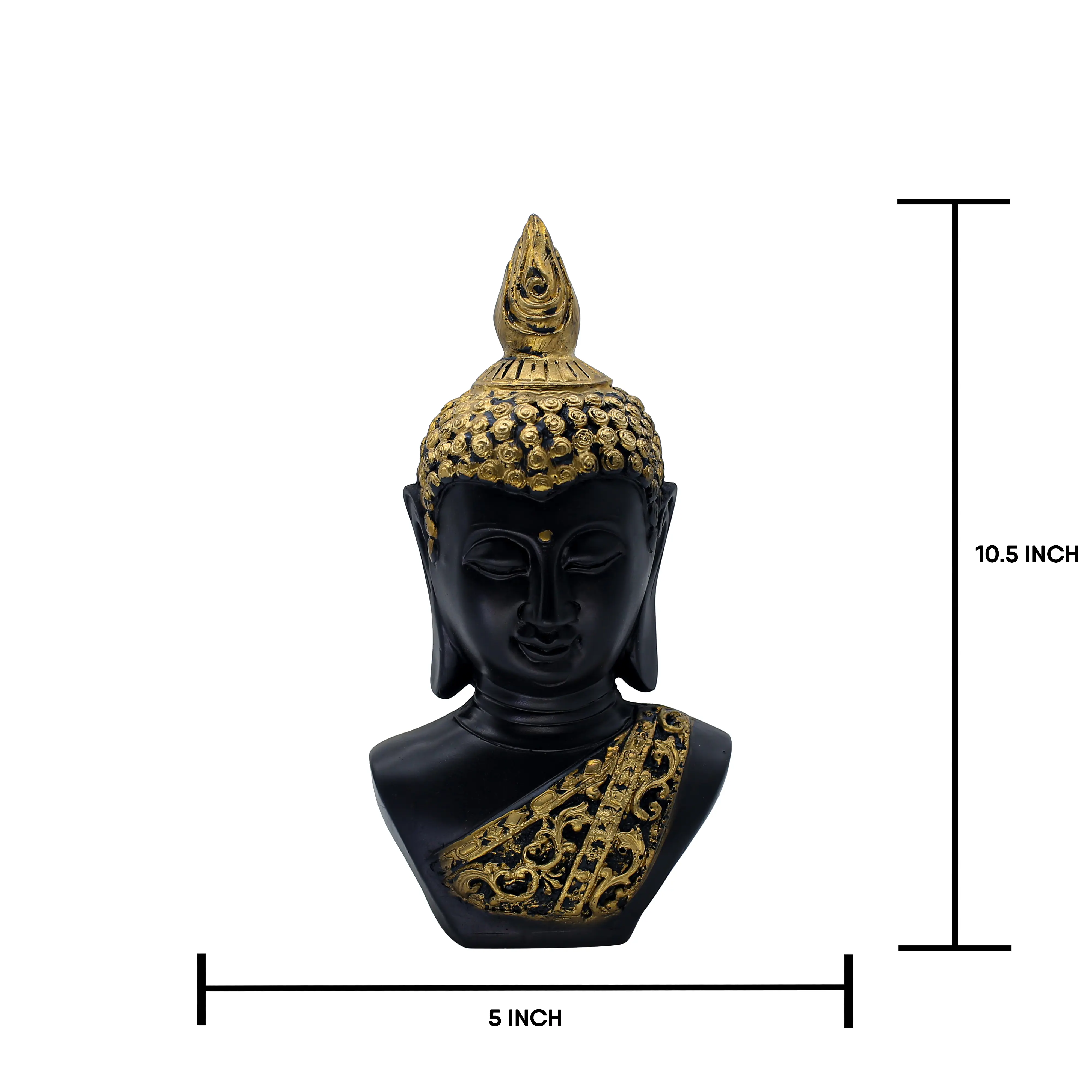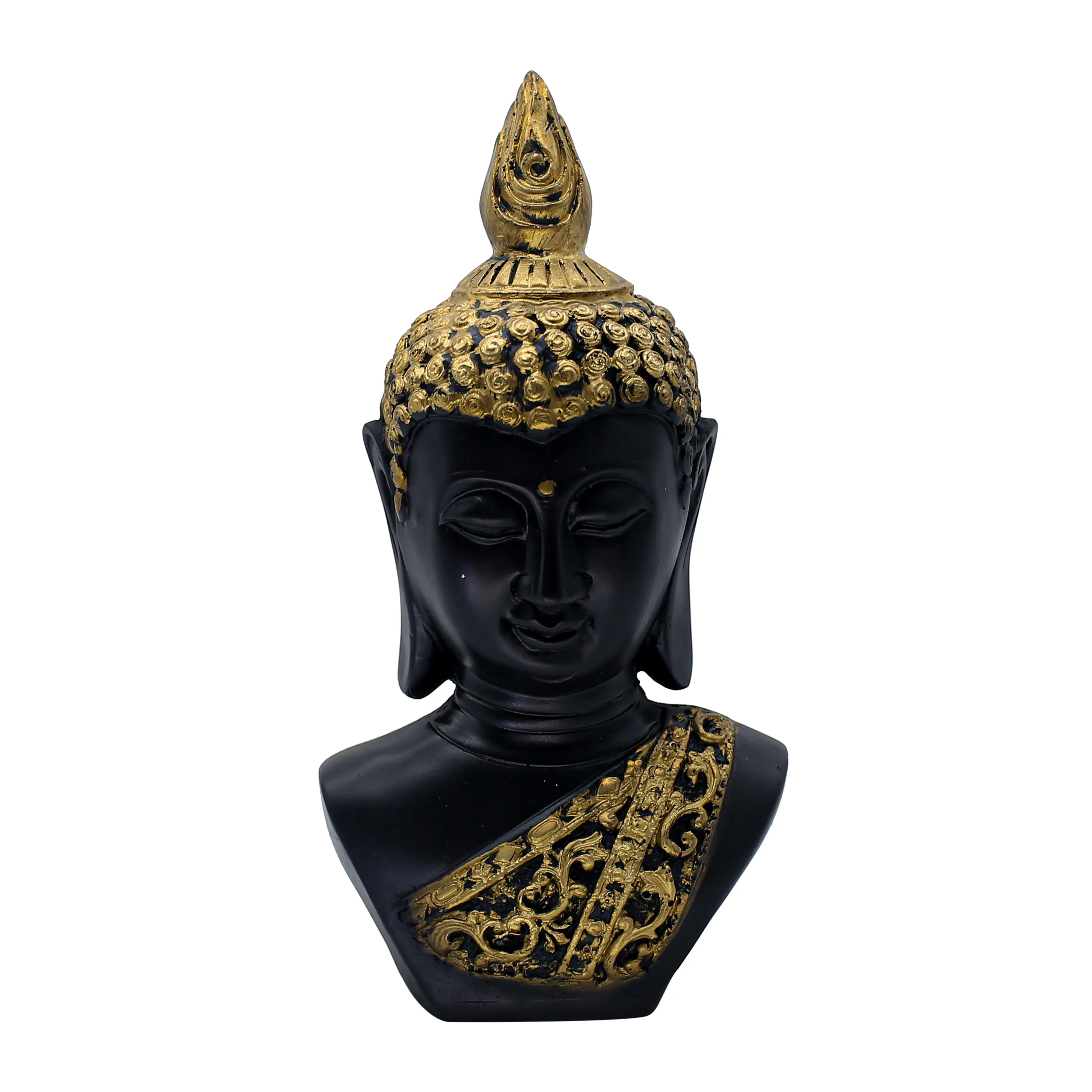 Bring a sense of calm sophistication to your environment with the Black & Gold Buddha Head Bust. This stunning sculpture captures the essence of Zen philosophy through its serene facial expression and meditative closed eyes. It serves as a gentle daily reminder to breathe, pause, and find balance amidst the chaos of life. The design is a masterful blend of spiritual tradition and contemporary aesthetics. The deep matte black skin tone exudes mystery and grounding, while the antique gold accents on the hair and the intricately carved shoulder sash add a layer of regal elegance. Whether placed in a minimalist living room, a busy office, or a quiet yoga corner, this Buddha bust commands attention while radiating tranquility. It is the perfect centerpiece for anyone seeking to create a mindful and stylish sanctuary.