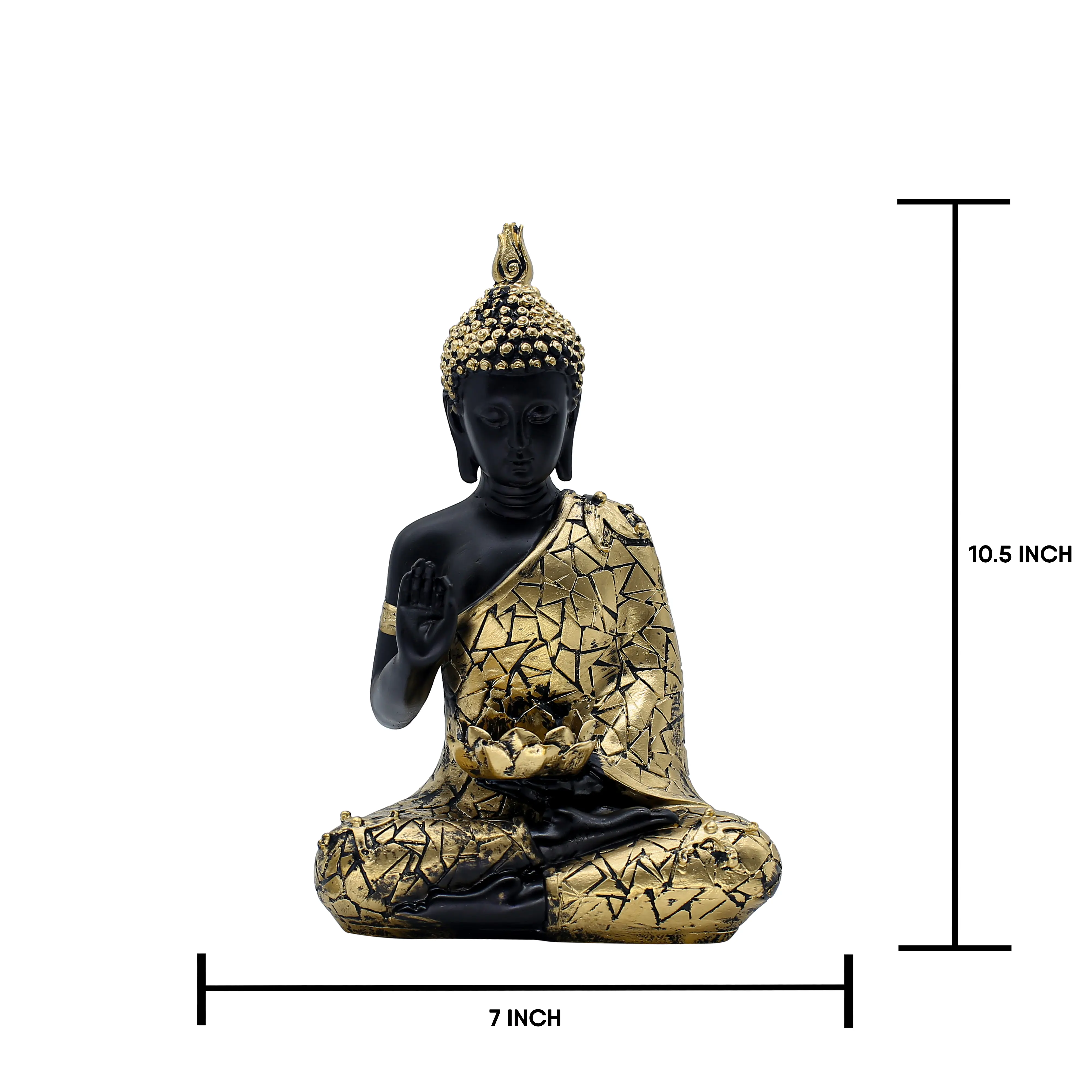 The statue depicts Lord Buddha in a calm meditative posture, symbolizing enlightenment, protection, and positivity. The raised hand gesture represents reassurance and peace, while the integrated tealight holder adds a soothing glow, perfect for meditation, prayer, or relaxation. The deep black base color signifies strength and stillness, beautifully contrasted with rich gold mosaic detailing that enhances its premium aesthetic.