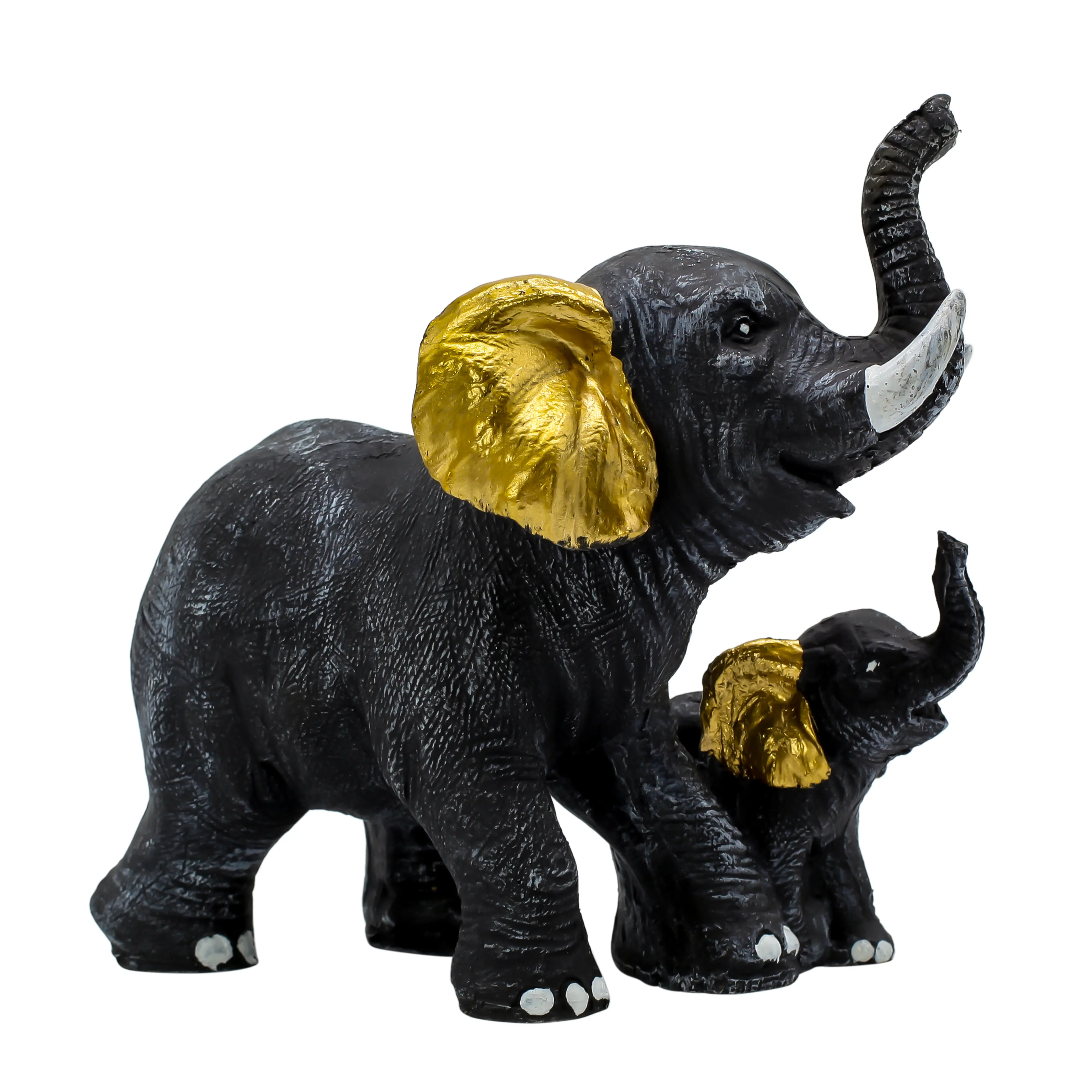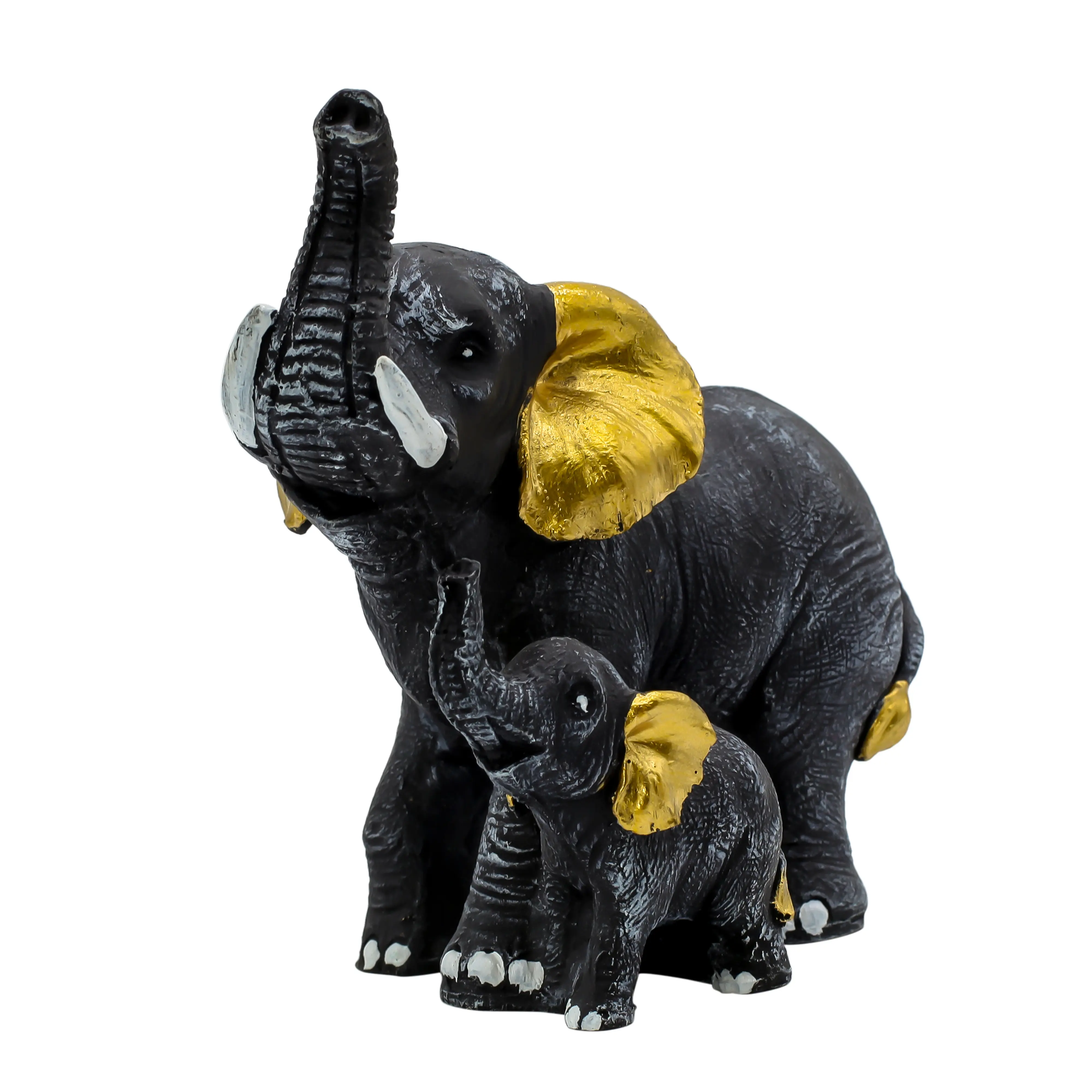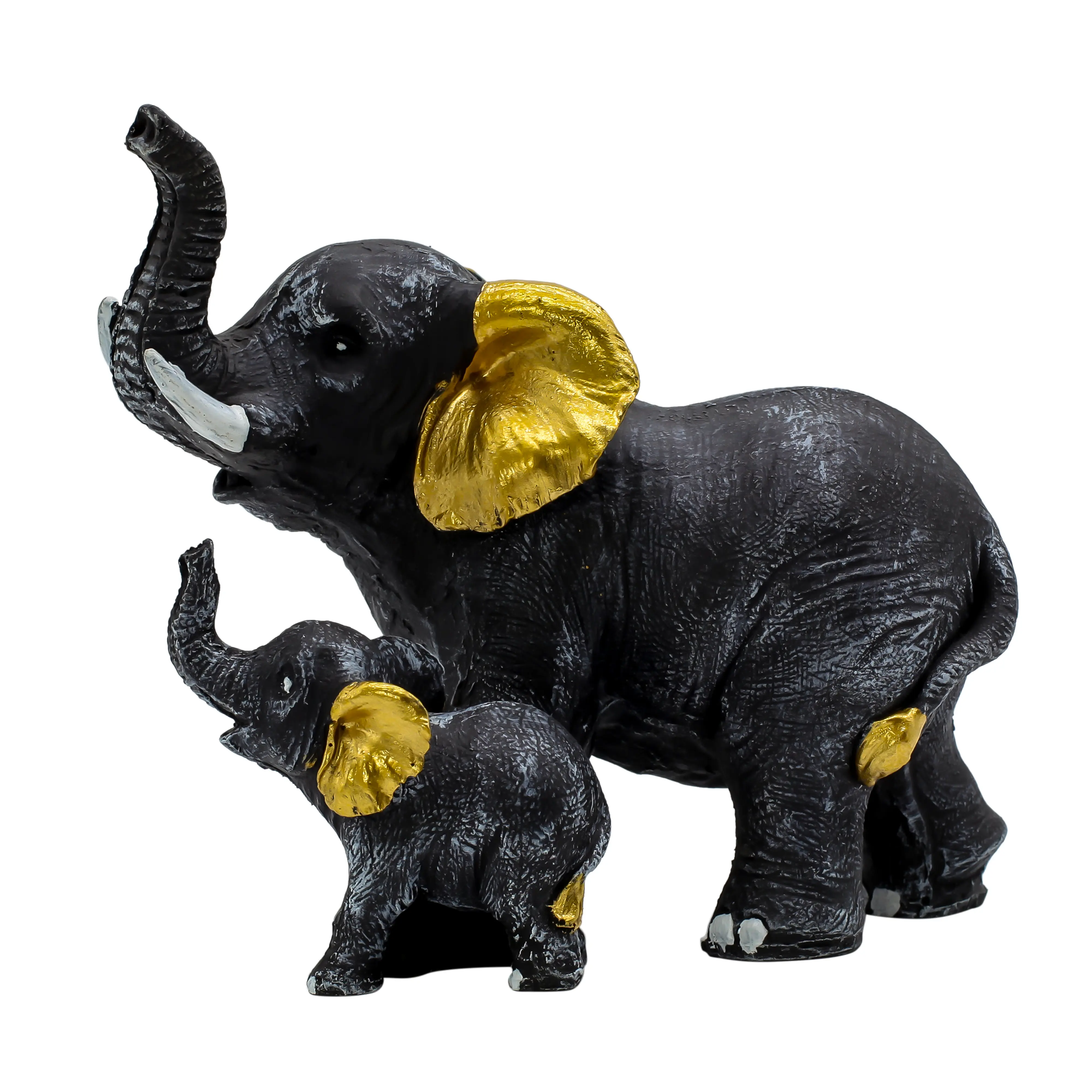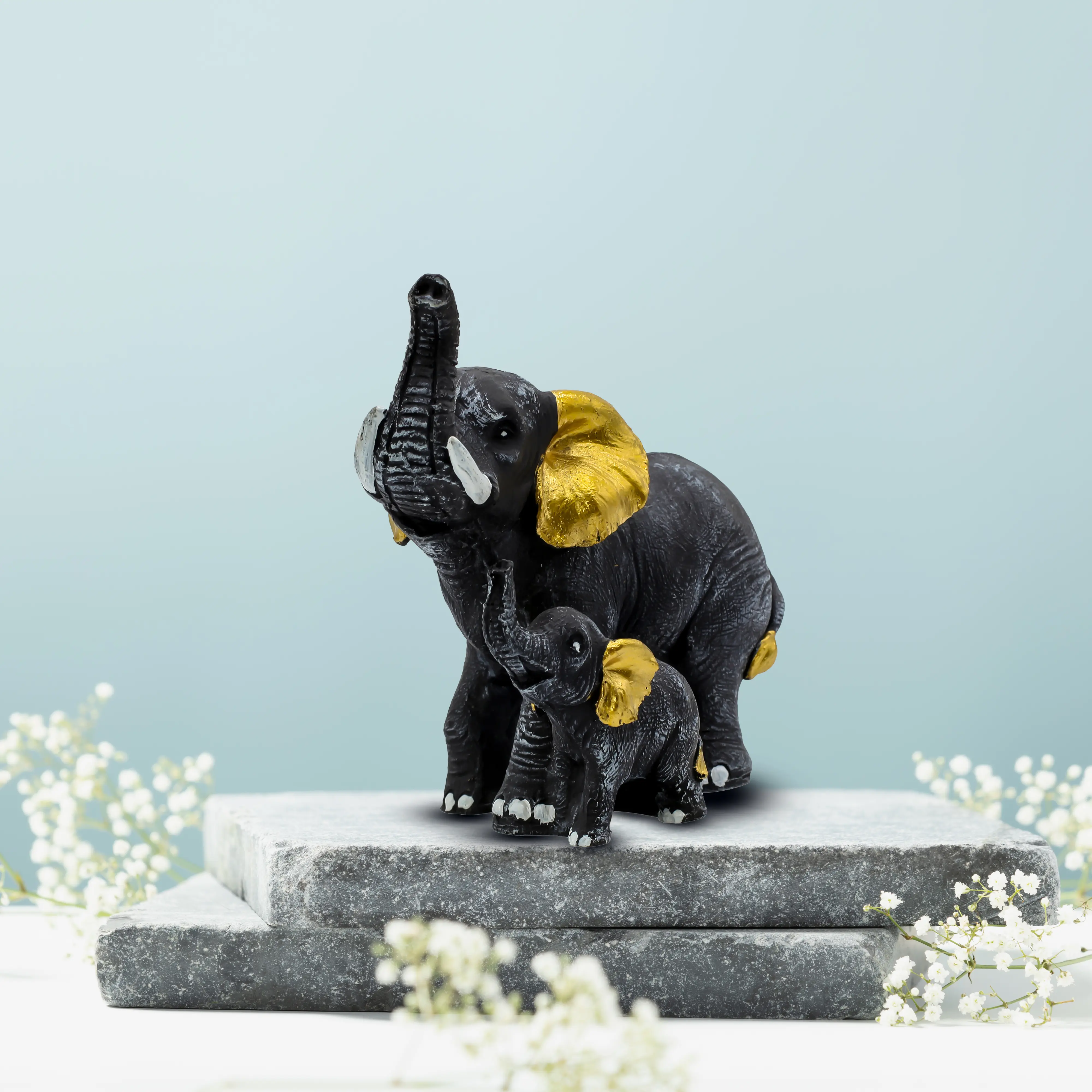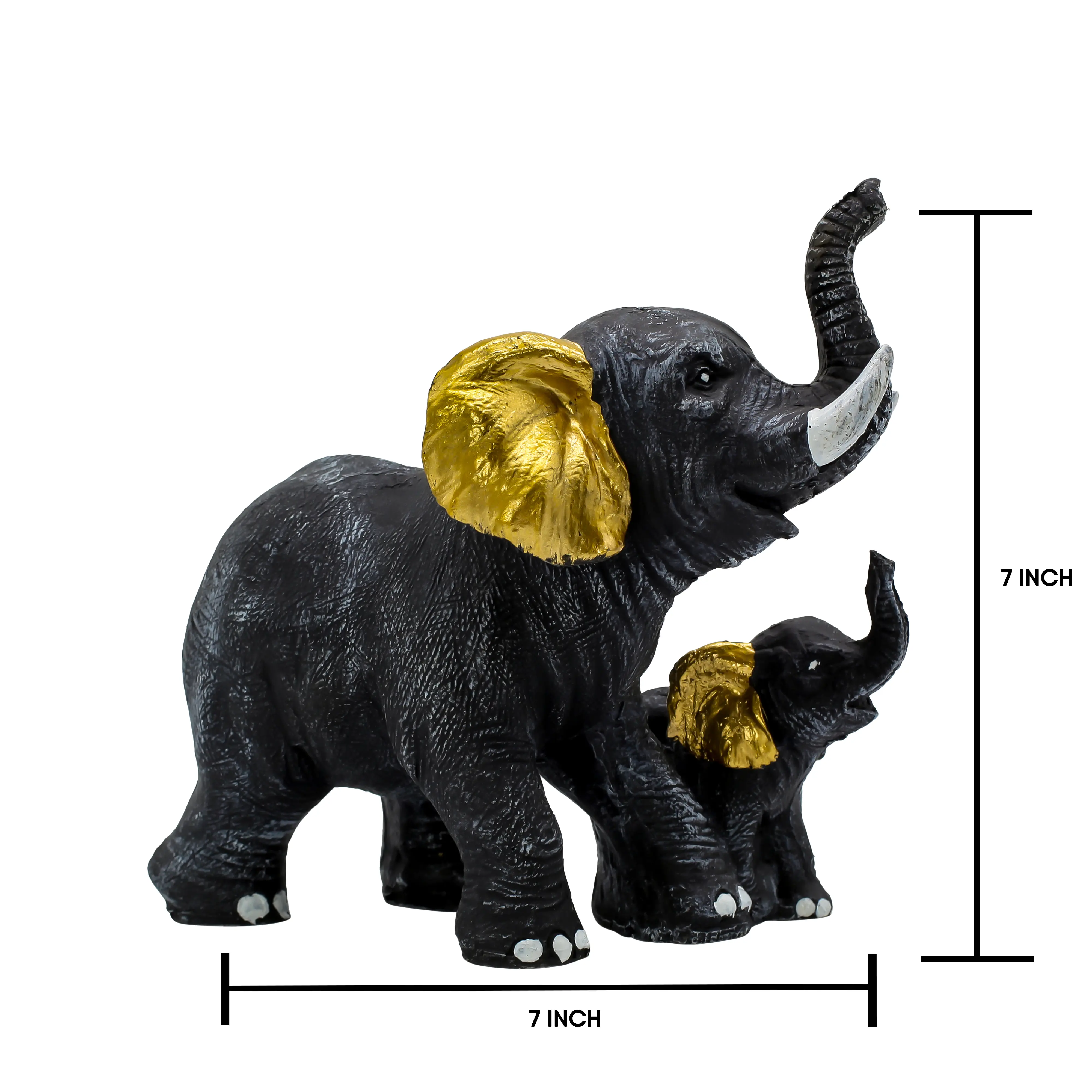 Bring positivity and elegance into your home with this Black & Gold Elephant with Baby Resin Showpiece. Symbolizing strength, protection, love, and prosperity, this beautifully designed elephant family statue reflects warmth and emotional bonding. Crafted from premium-quality polyresin, it features a rich black finish with elegant gold accents, adding a luxurious touch to any interior. The raised trunk represents good luck and success, making it ideal for Vastu and Feng Shui placement. Perfect for living rooms, offices, pooja rooms, shelves, and console tables, this decorative piece blends modern aesthetics with traditional symbolism. A thoughtful choice for housewarming, Diwali, weddings, baby showers, and corporate gifting, this elephant showpiece is durable, easy to maintain, and visually captivating.