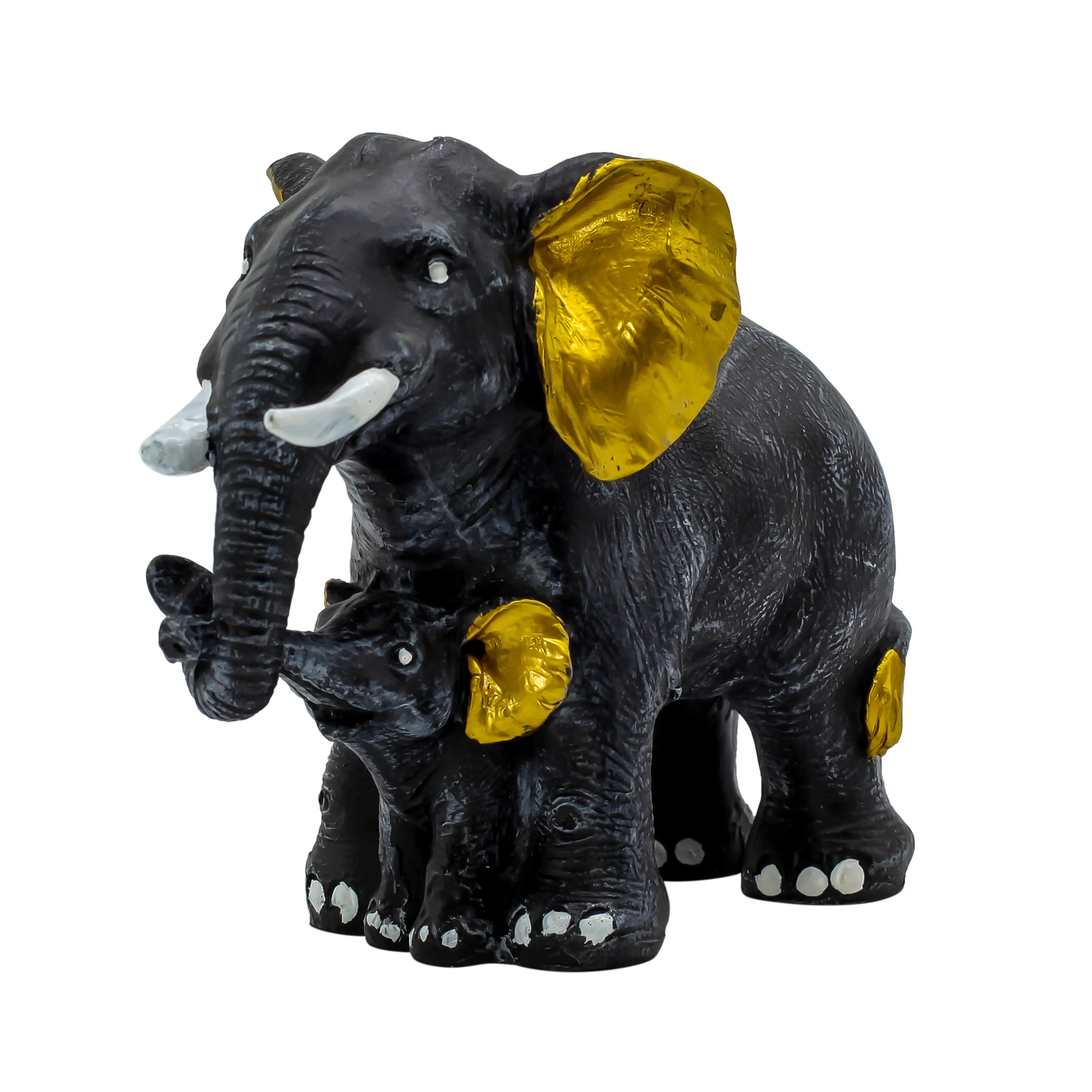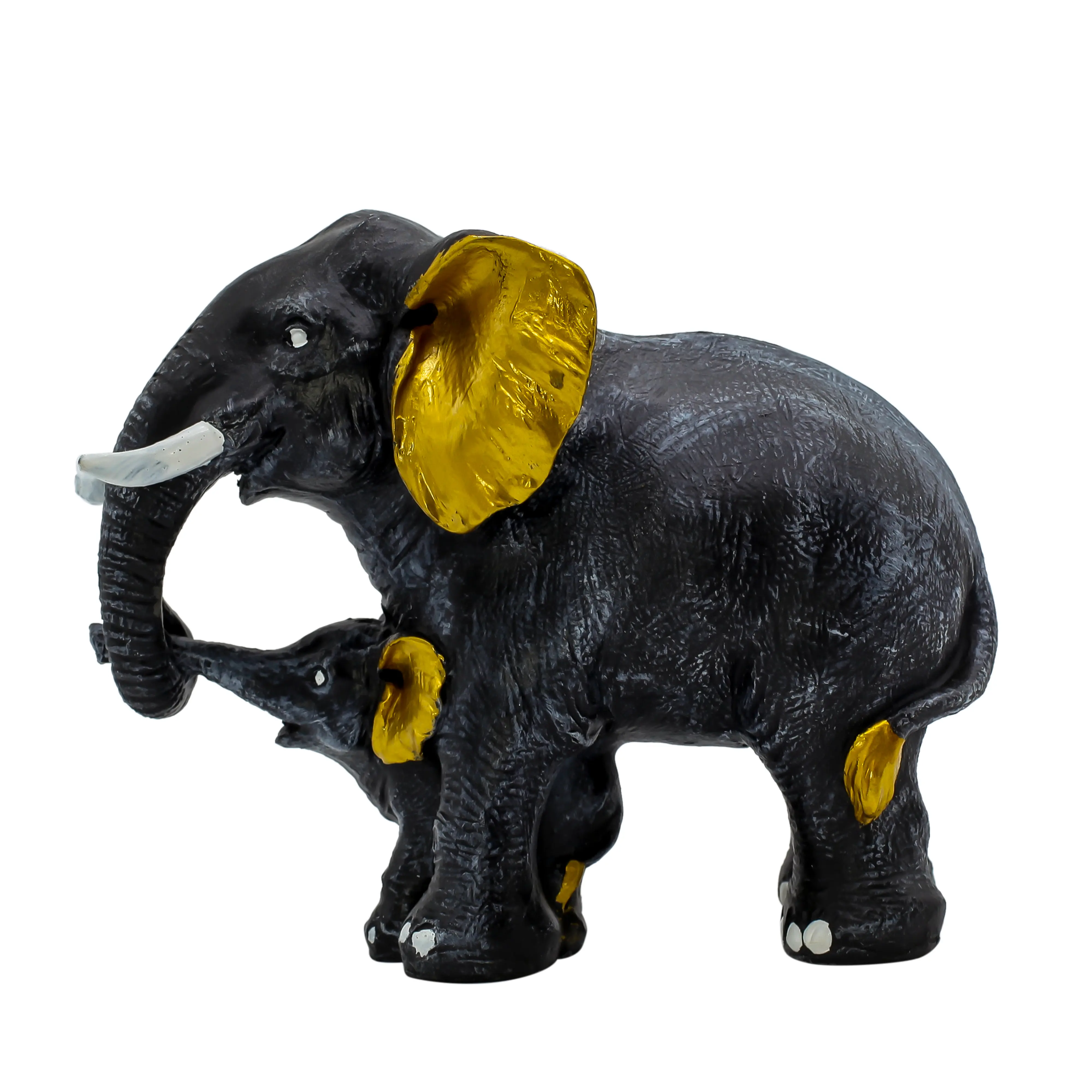 This elegant showpiece is crafted from premium-quality polyresin, ensuring durability and long-lasting beauty. The detailed textured black body combined with rich gold accents on the ears and subtle highlights gives the statue a luxurious and sophisticated finish. The raised trunk signifies good fortune and success, while the baby elephant walking alongside reflects care, bonding, and family unity.