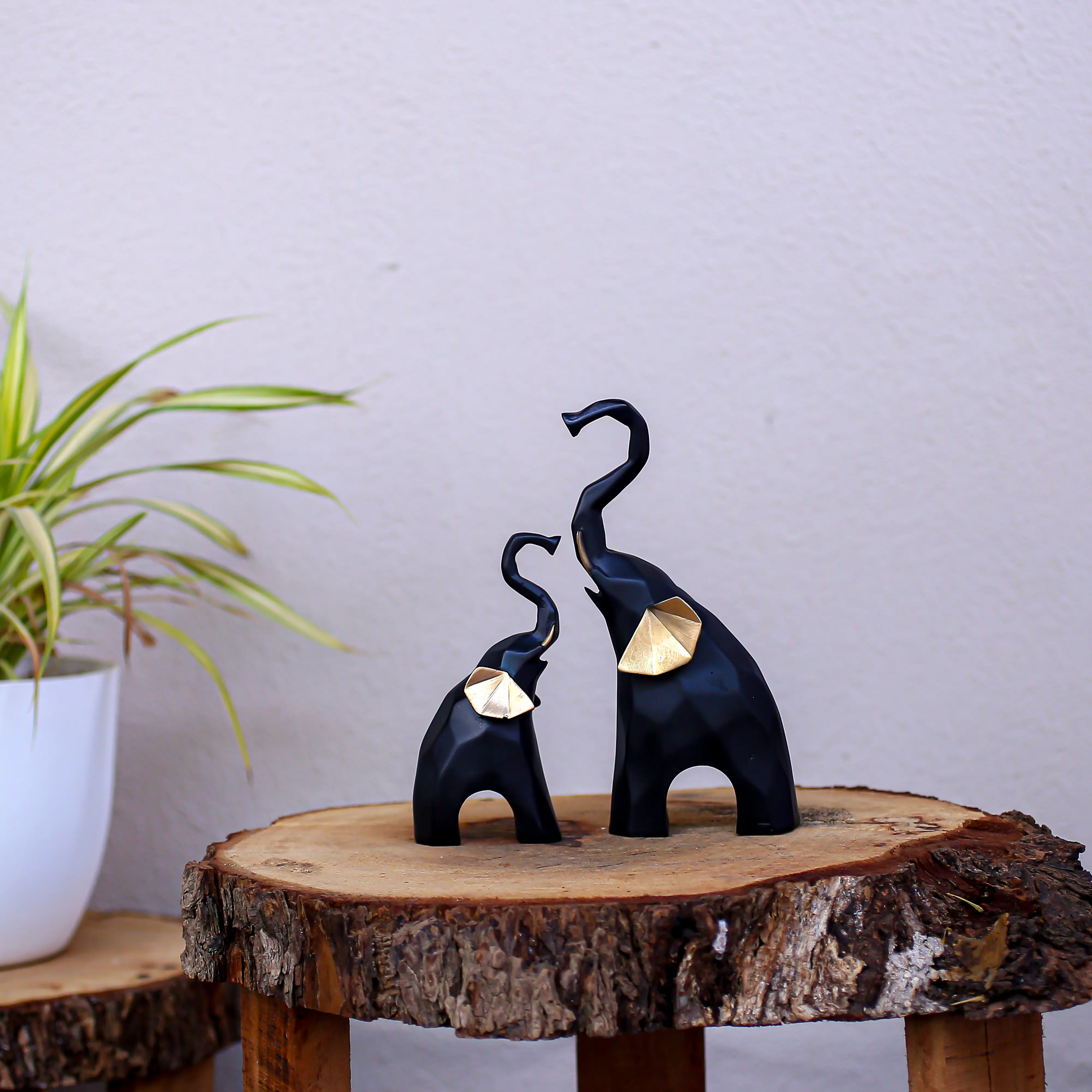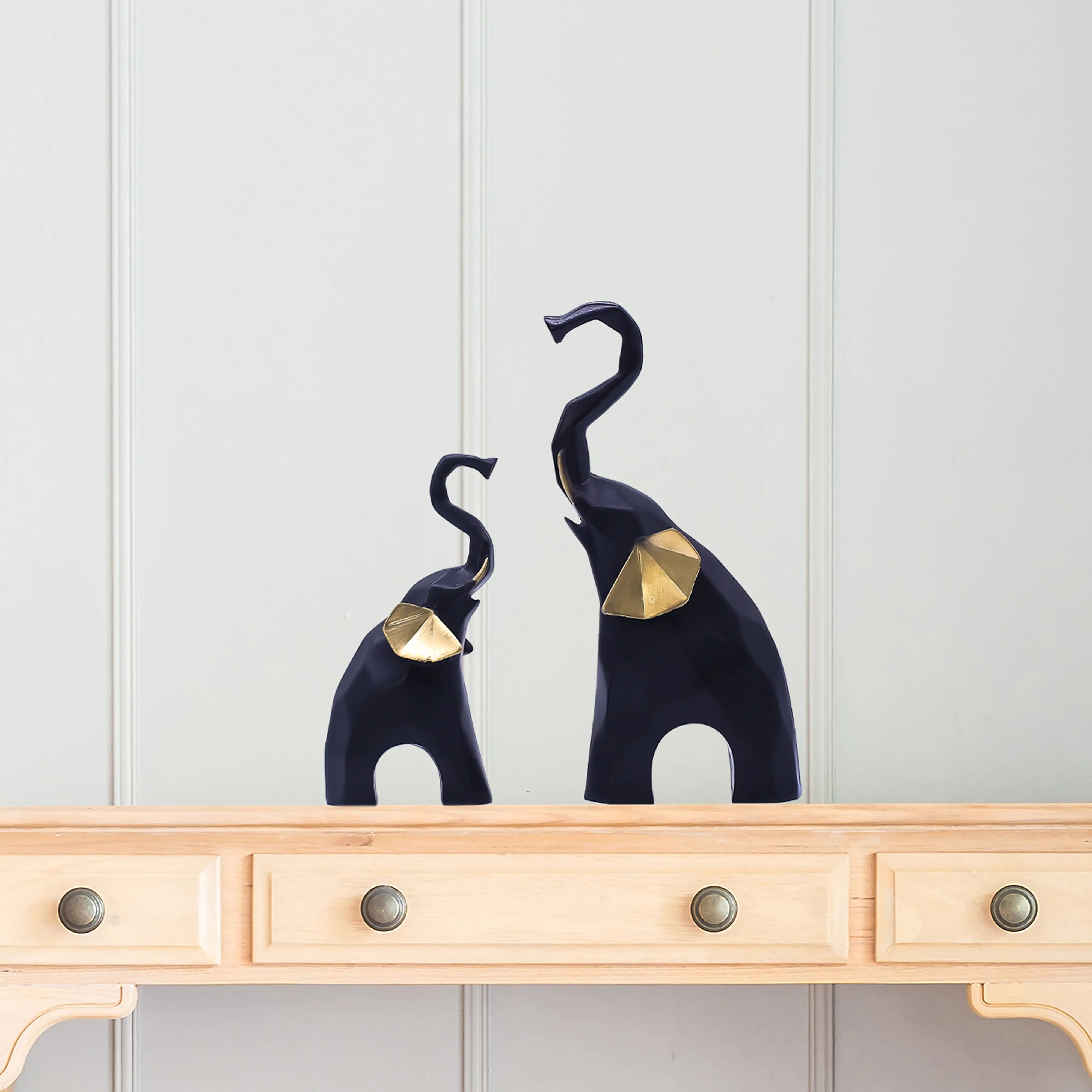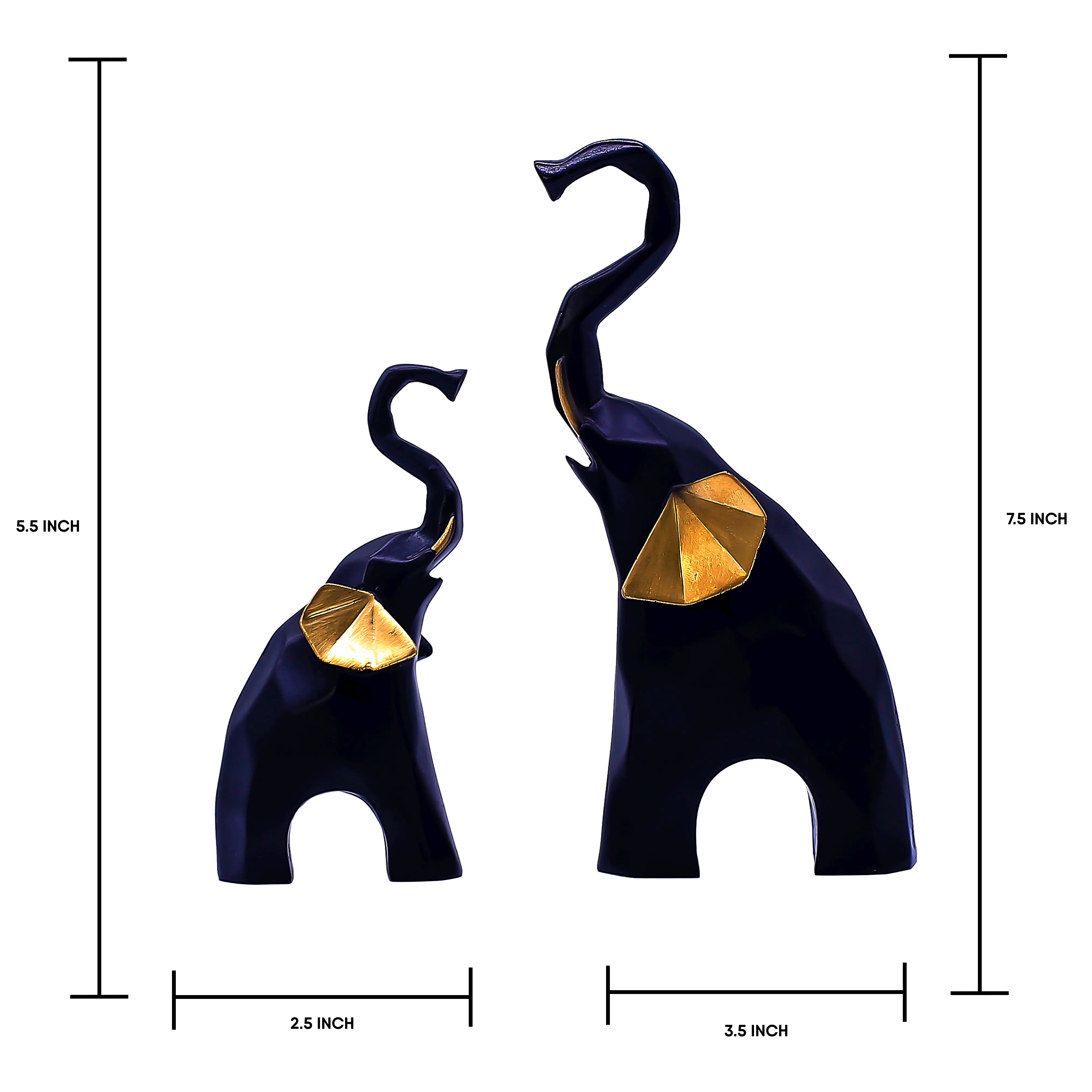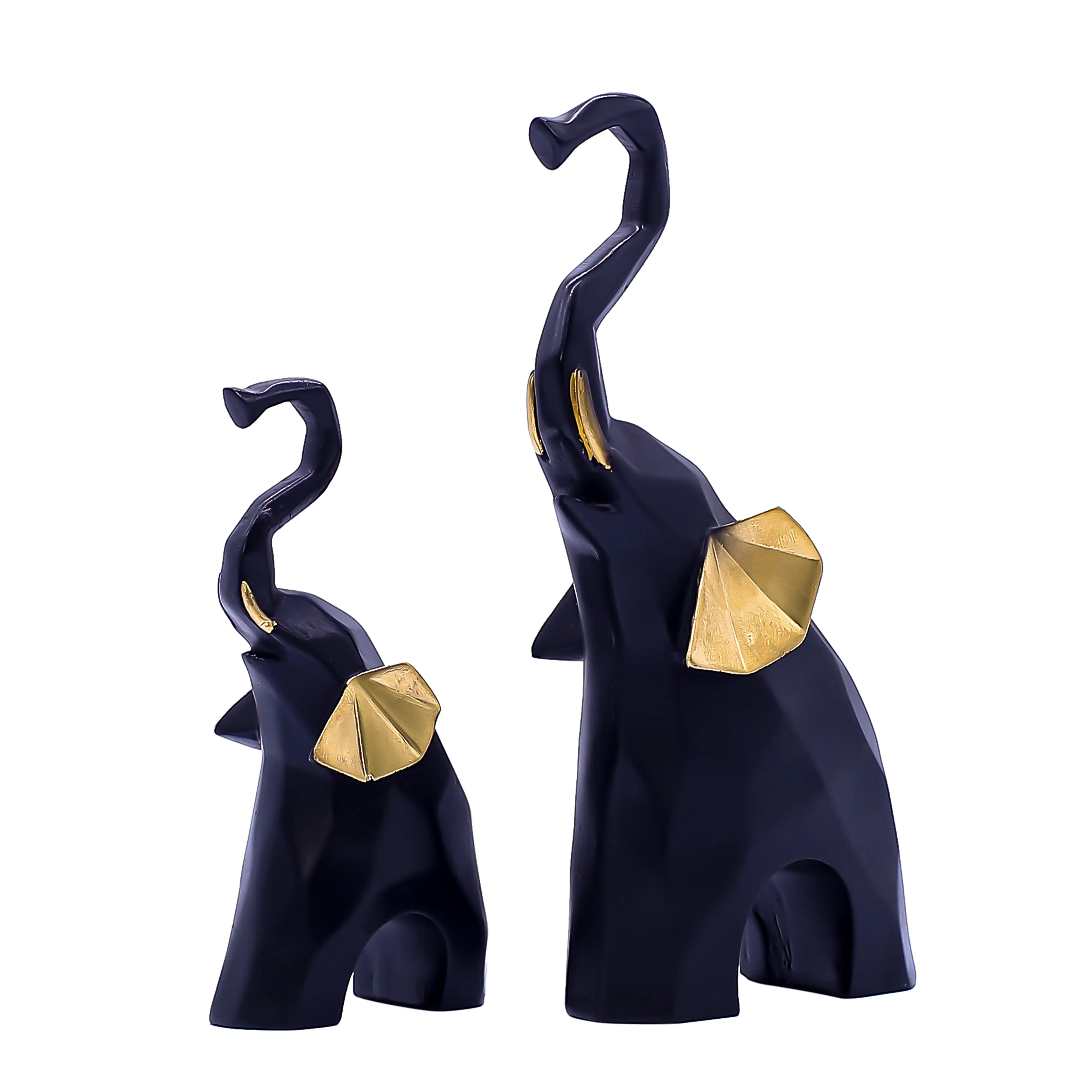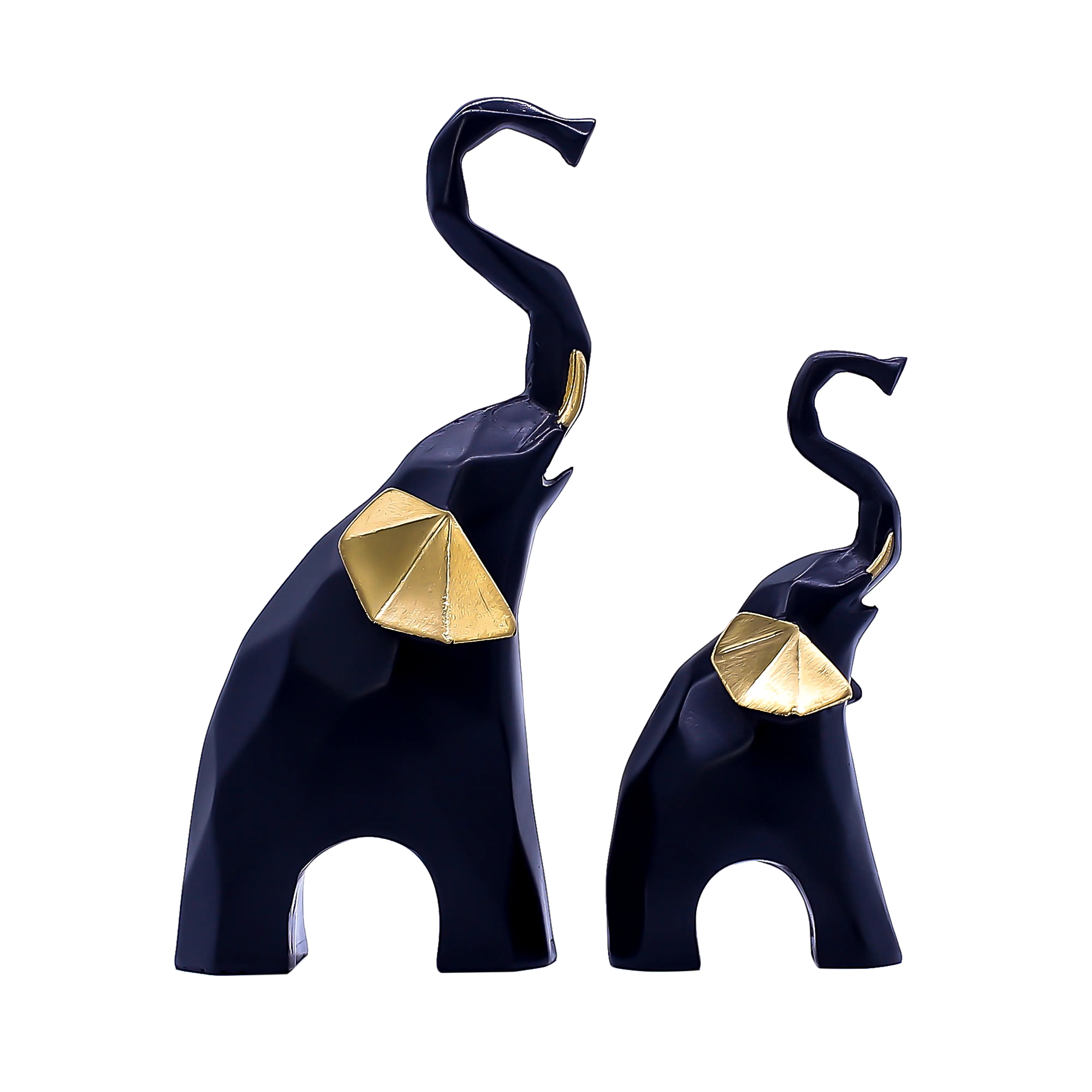 A Modern Twist on a Symbol of Fortune. Elevate your home decor with the Black & Gold Geometric Elephant Statue Set. This striking pair combines ancient symbolism with modern artistry. The elephants, depicted with their trunks raised high in a gesture of joy and luck, are designed with a unique faceted, origami-like structure that adds visual depth and sophistication to any room. The bold color palette sets this duo apart. The smooth matte black body exudes power and elegance, while the shimmering gold ears add a luxurious pop of warmth. Whether you place them side-by-side to represent family bonding or separate them across a shelf for balance, these resin sculptures are a stylish way to welcome prosperity into your life.