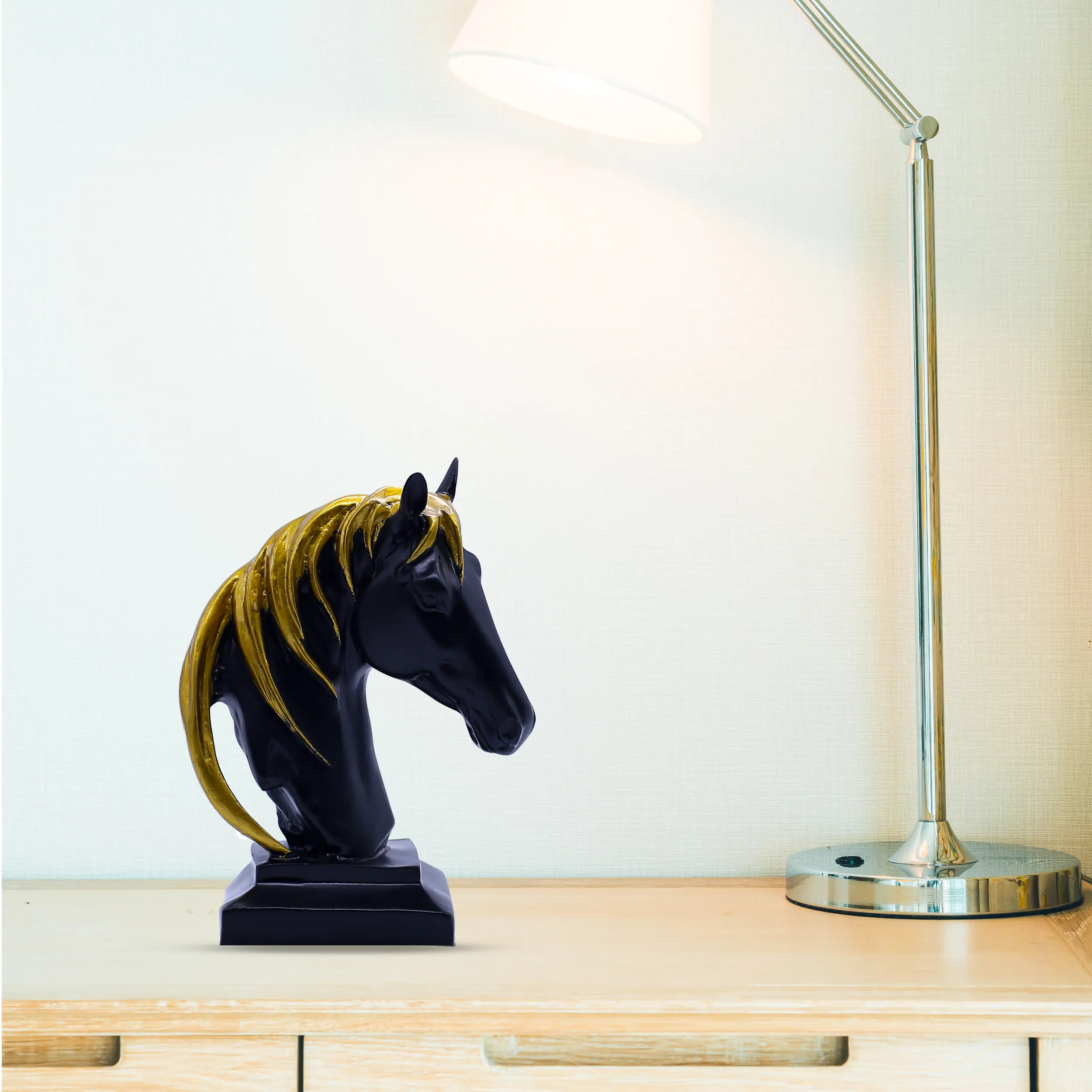 Maintenance is simple—just wipe with a soft dry cloth to retain its shine and finish. Durable, lightweight, and visually striking, this Black & Gold Horse Head Resin Showpiece is a timeless décor piece that represents power, elegance, and refined taste.