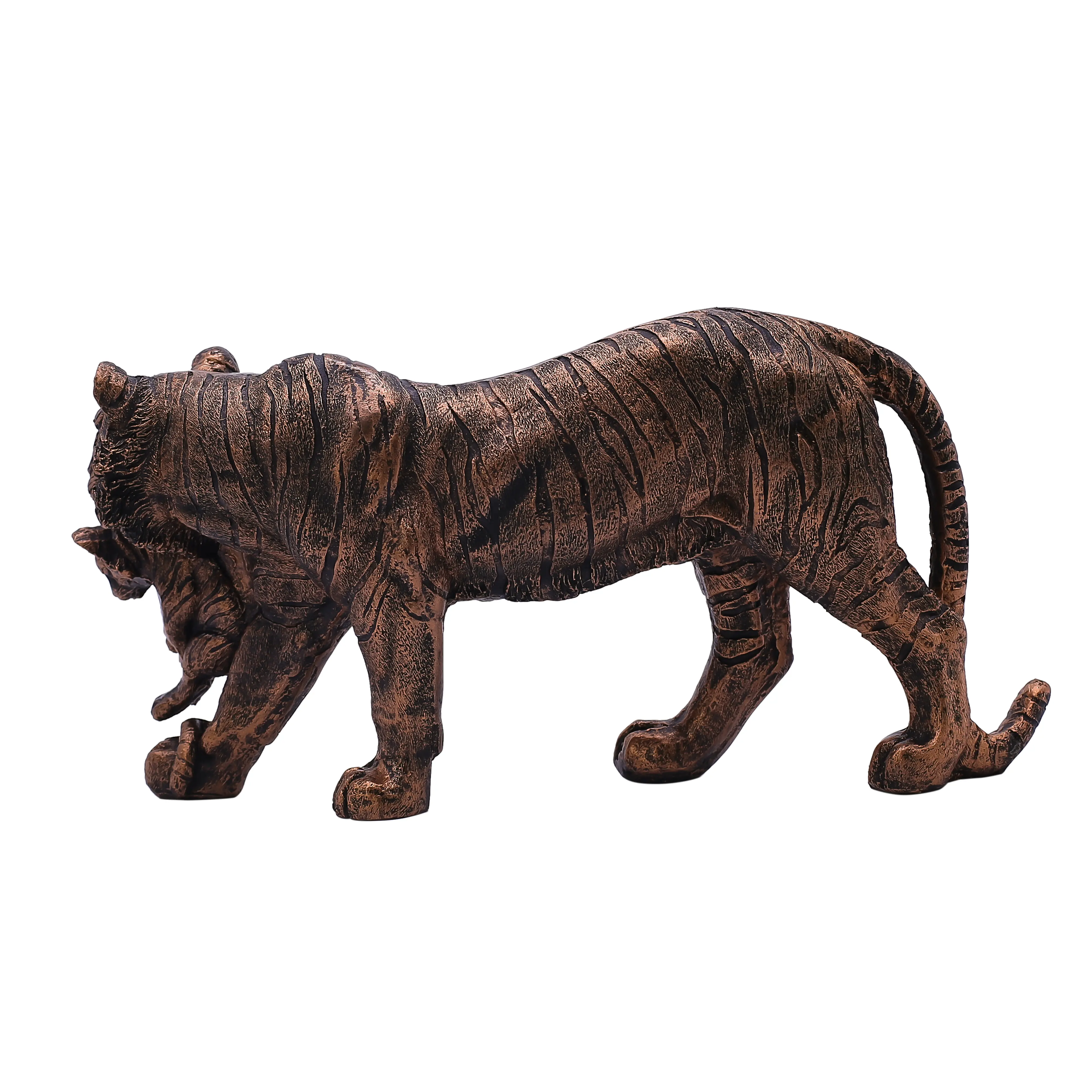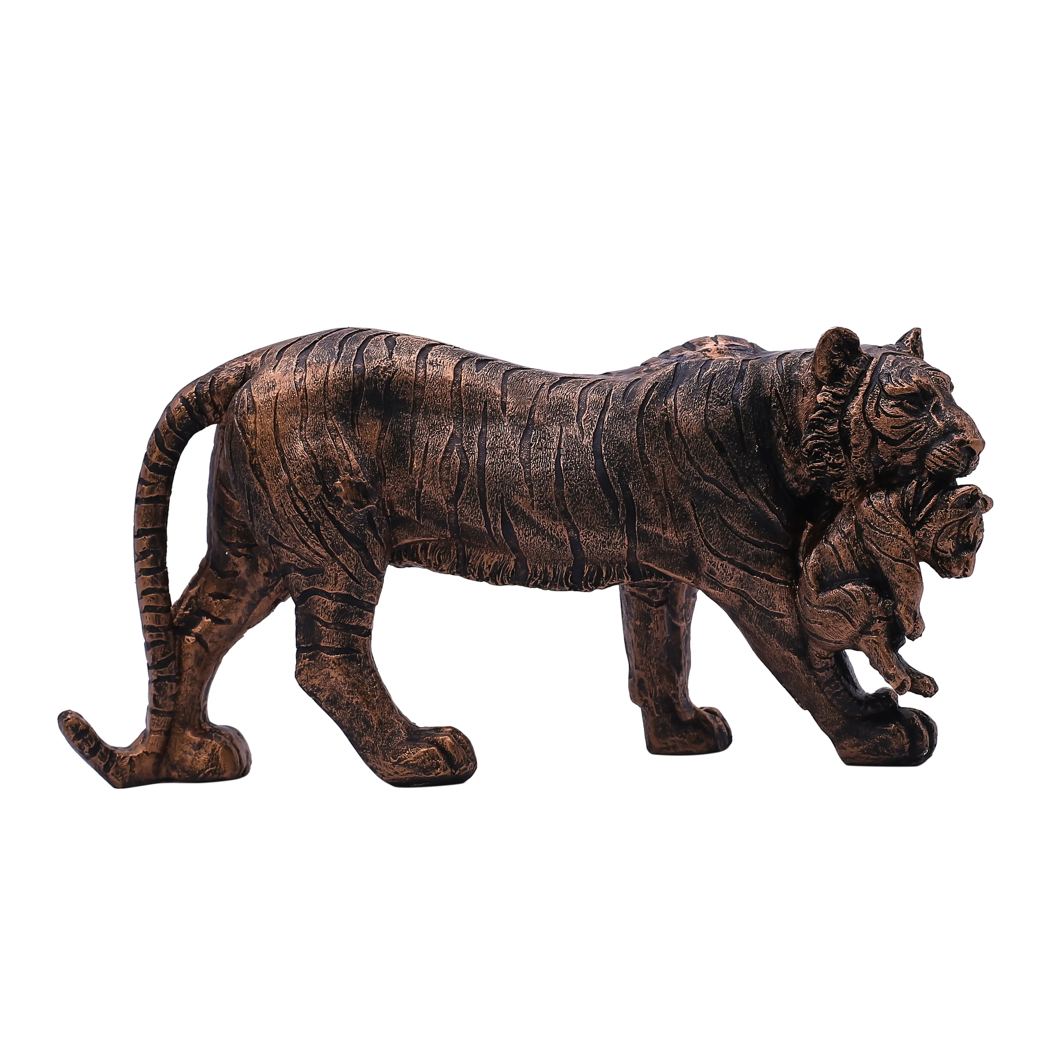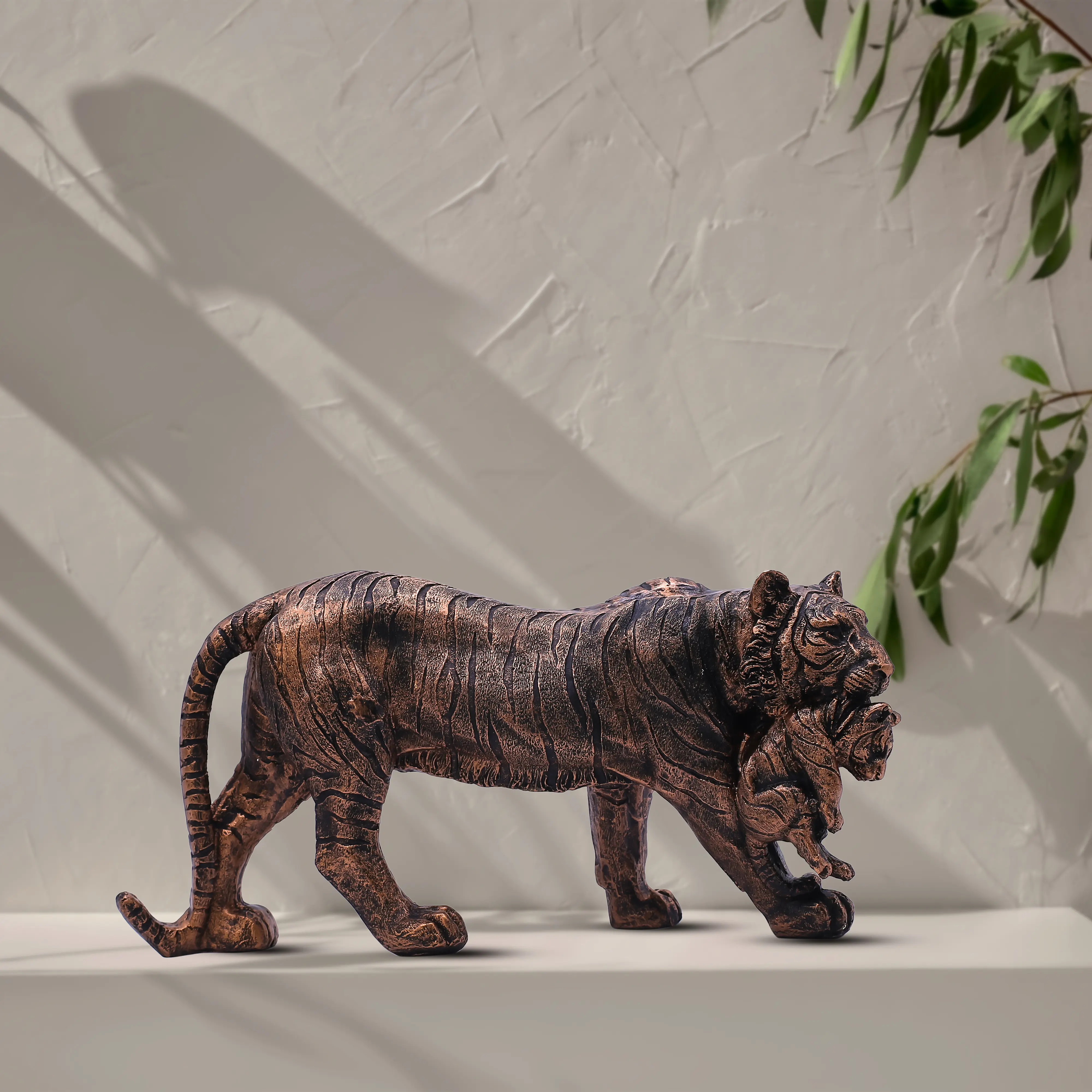The Strength to Protect. The Gentleness to Nurture. Bring the majestic beauty of the jungle into your home with the Antique Bronze Tiger Carrying Cub Statue. This exquisite figurine captures one of nature's most touching interactions—a mother tiger transporting her young. The sculpture shows the adult tiger in mid-stride, holding her cub securely and gently in her jaws, a universal symbol of maternal devotion and safety. Finished in a lustrous antique bronze with deep copper highlights, this piece radiates warmth and luxury. The dark detailing brings out the intricate fur texture and the powerful stripes of the animal, creating a stunning visual contrast. Whether placed in a living room to watch over the family or in an office to symbolize strong leadership, this tiger statue is a timeless tribute to the power of love.