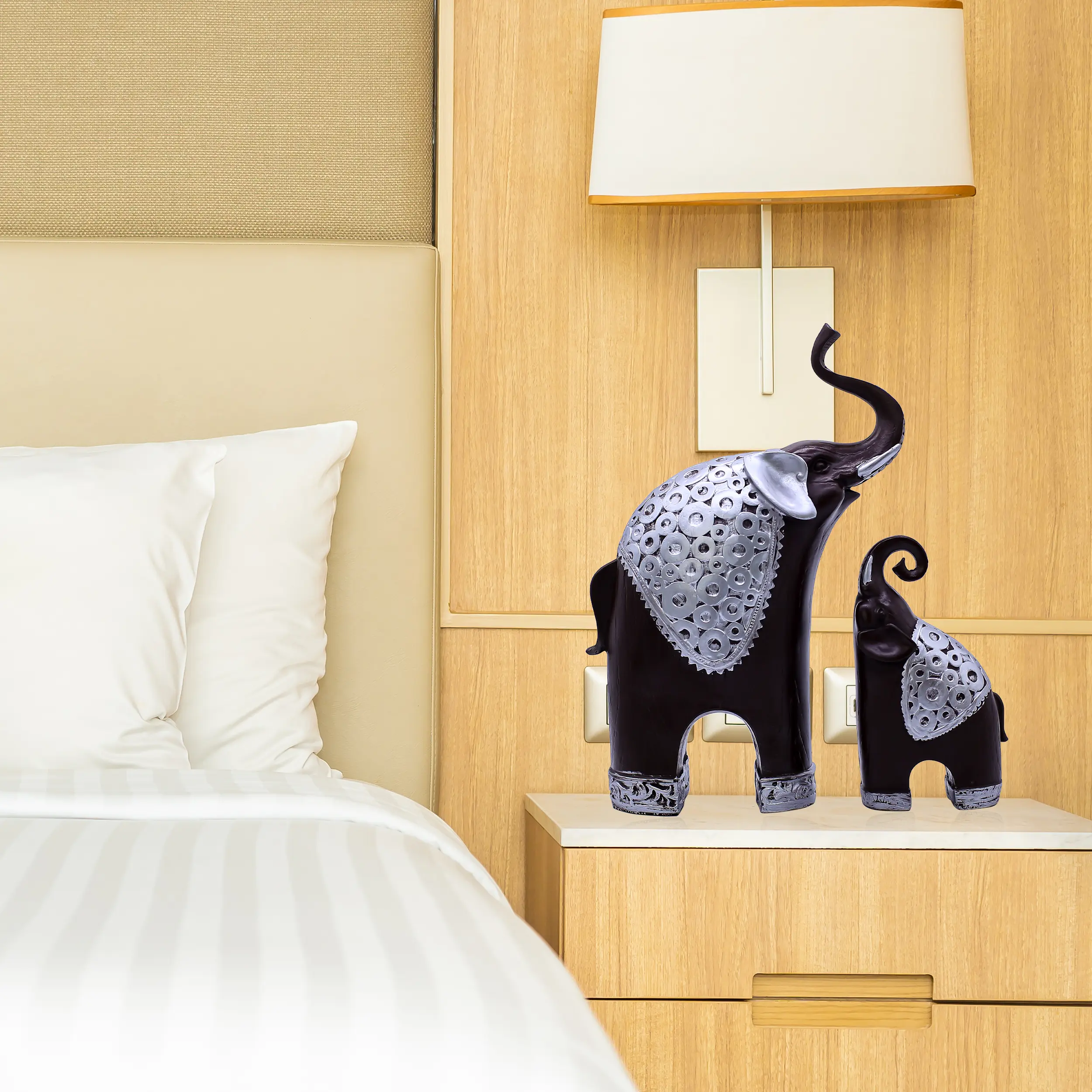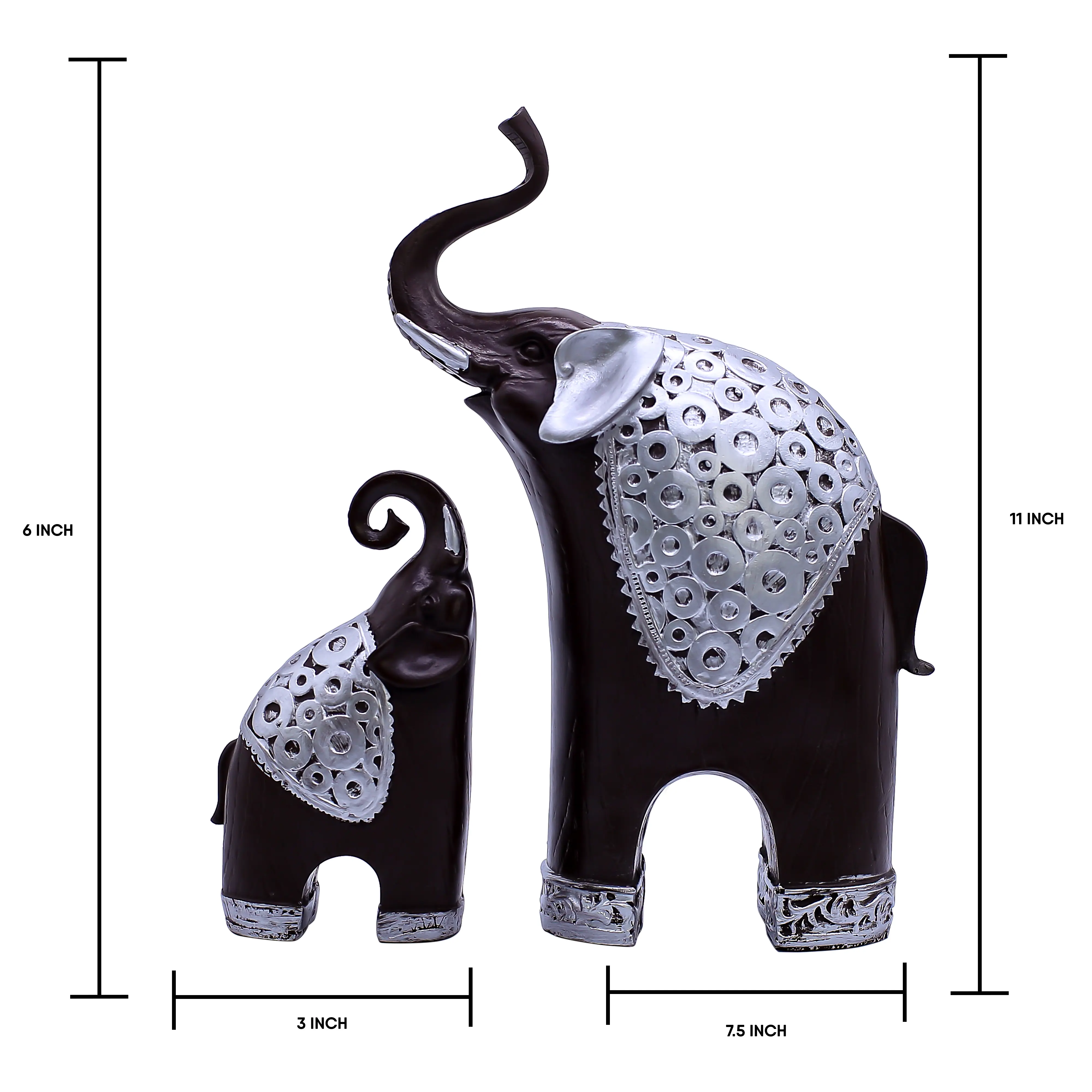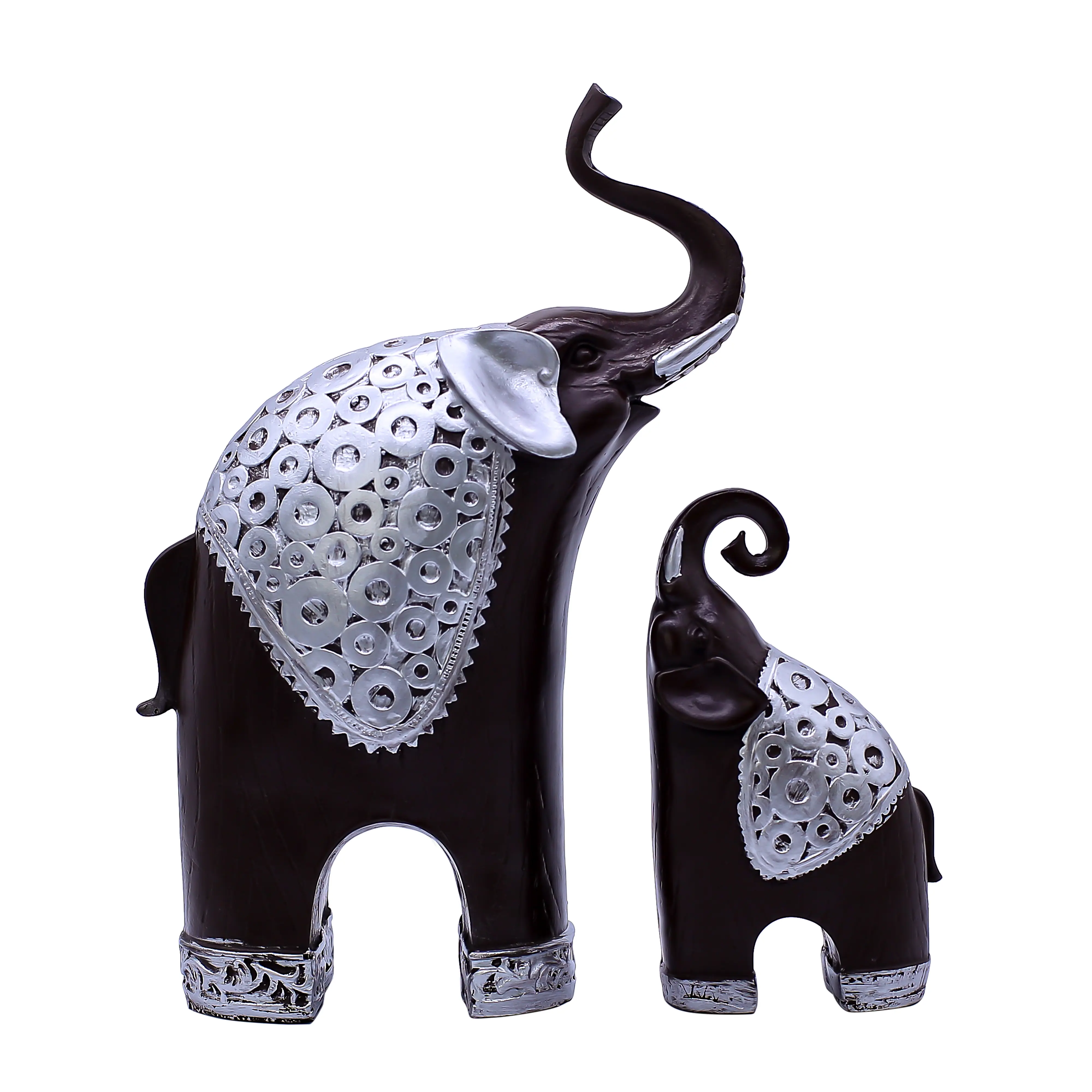 The Accents: The standout feature is the silver ornamentation. Both the large and small elephants are draped in ceremonial blankets featuring a relief pattern of coins and circles—symbols often associated with wealth and infinity. Silver cuffs on their feet add a final touch of royalty.