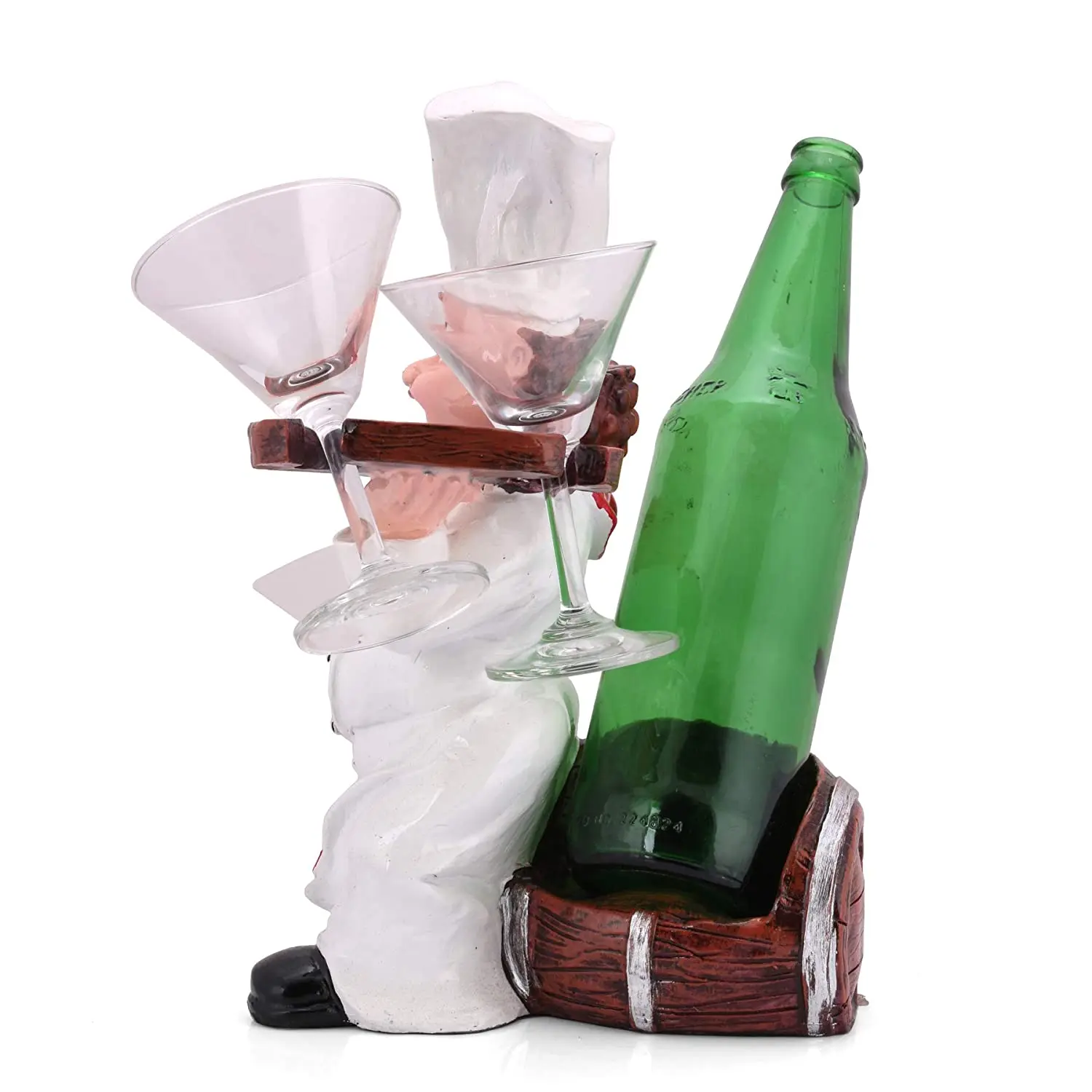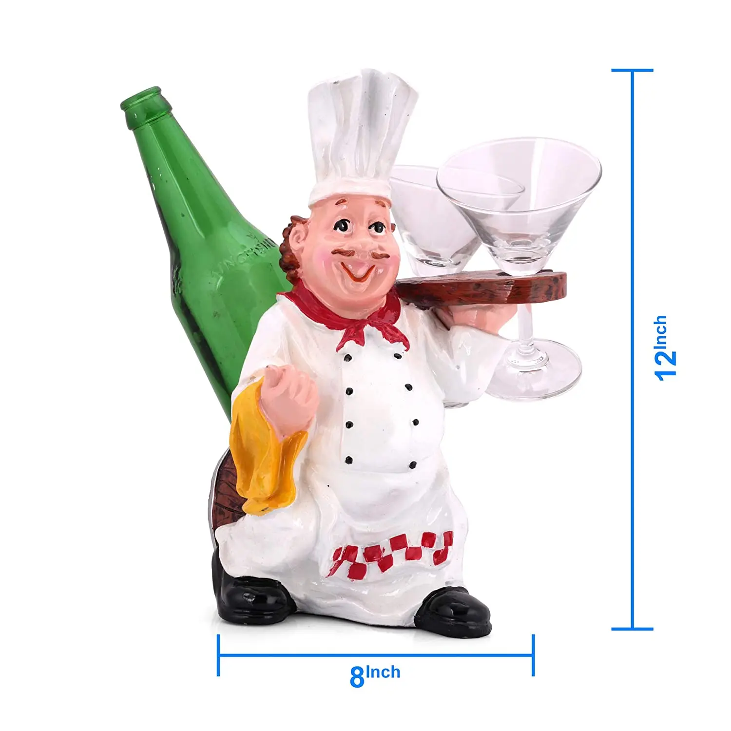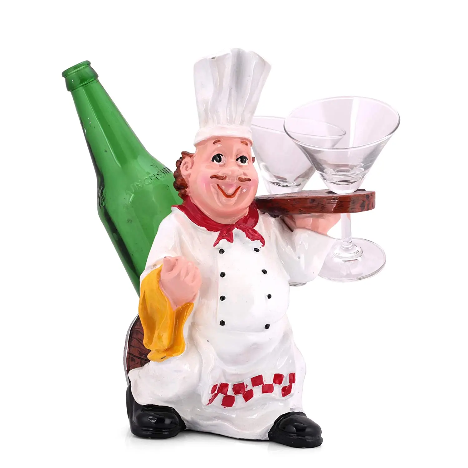 Whimsical & Functional Design Gone are the days of boring metal wine racks. This figurine brings personality to your space. It features a cheerful, rotund chef with a beaming smile and a curled mustache, inviting you to enjoy a drink. He is dressed in impeccable chef attire: a crisp white double-breasted jacket, a tall toque, and a red-and-white checkered apron that adds a pop of color. Functionally, it is a master of organization. The design cleverly integrates a holder for a standard 750ml wine or liquor bottle behind the chef, while his left hand presents a wooden-textured rack designed to slot in two wine glasses or martini glasses inverted for safekeeping.