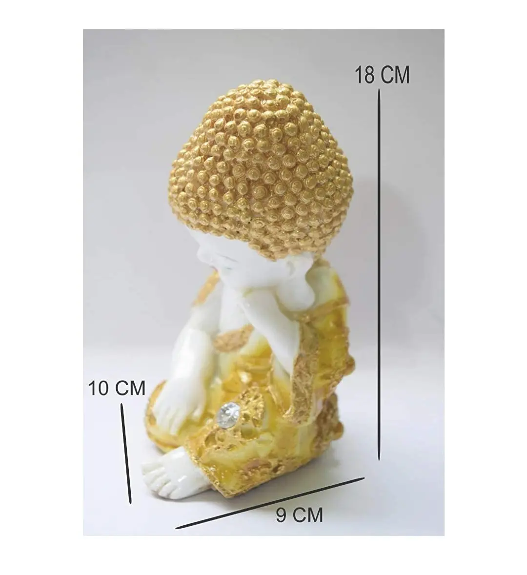 The Texture: The head features the iconic "snail shell" curls, textured and painted in gold to signify spiritual wisdom. The robe also features embossed patterns and a small crystal/gem detail that catches the light.