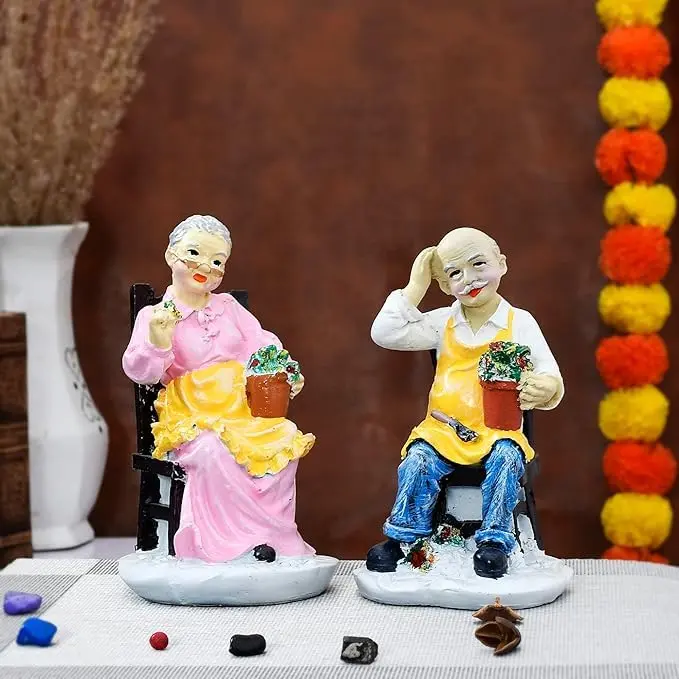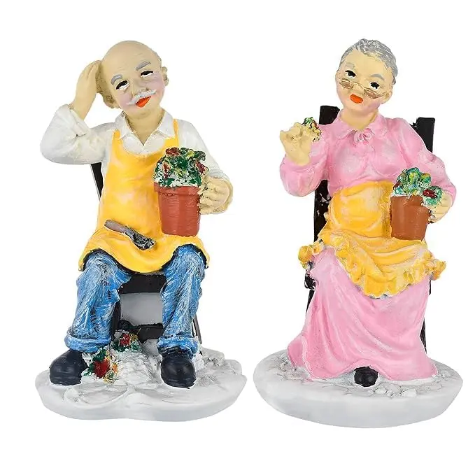 Celebrate the timeless bond of love and companionship with our Elderly Gardening Couple Statue. This heartwarming showpiece is a tribute to the promise of "growing old together." The set features two distinct figures: a Grandpa and a Grandma, both seated and ready for a day of planting. The design is full of whimsy and color. The Grandpa, dressed in his blue jeans and yellow apron, holds a flower pot and scratches his head, perhaps wondering where to plant it next. The Grandma, elegant in her pink dress and matching apron, holds her own pot with grace. Their relaxed postures and colorful attire make them a standout addition to any shelf, windowsill, or cake topper display. It is more than just a decoration; it is a reminder that true love, like a garden, grows more beautiful with time.
