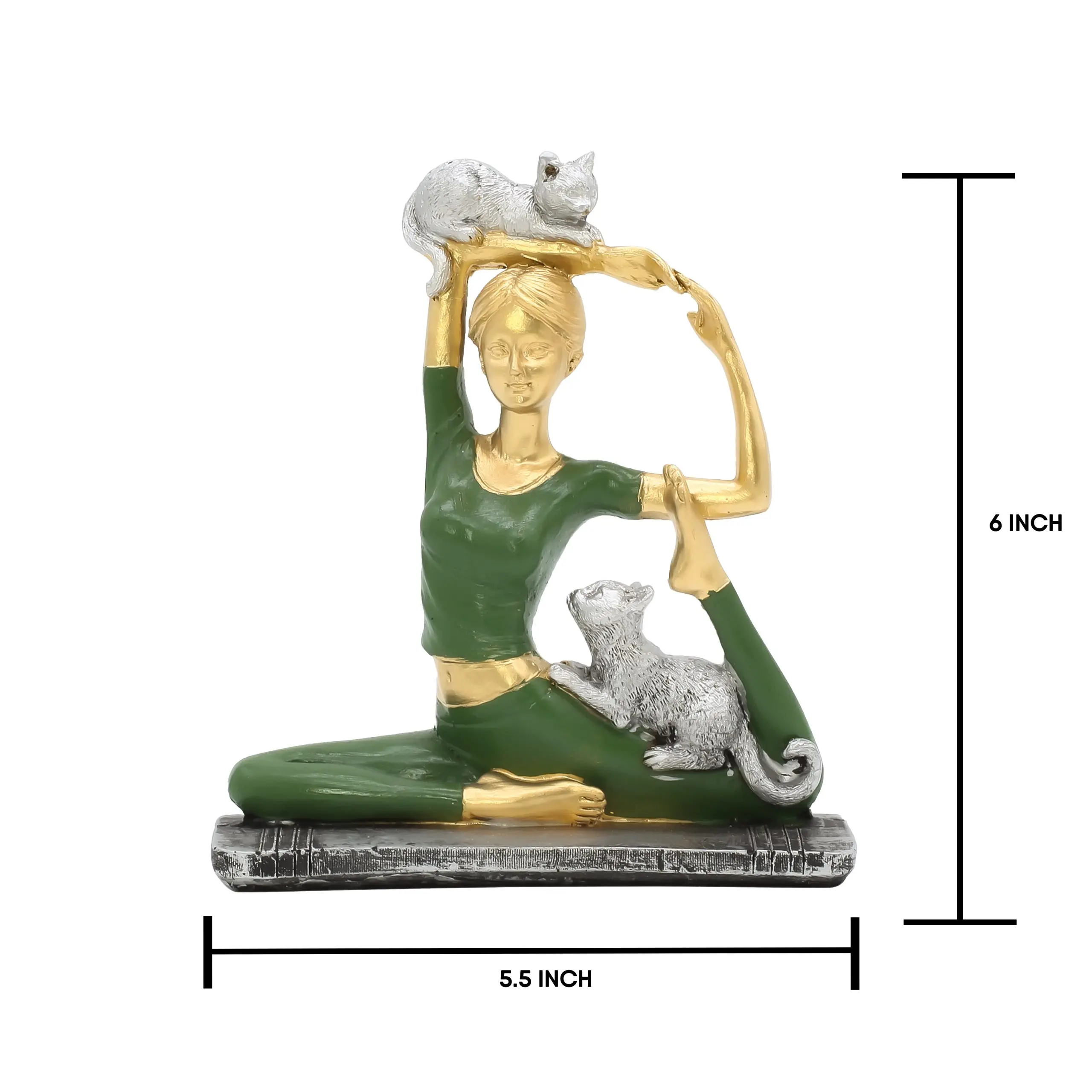 Artistic Design & Detailing The figurine showcases a woman in a deep, graceful backbend, highlighting the beauty of the human form in motion. Her skin is finished in a luxurious metallic gold, contrasting beautifully against her textured emerald green yoga outfit. The true stars of this piece, however, are the two metallic silver cats. Their inclusion adds a whimsical narrative to the piece—representing the playful distractions and comforting presence pets bring to our yoga practice. The contrast of the gold, green, and silver creates a modern yet timeless aesthetic that fits various interior styles, from Bohemian to Contemporary.