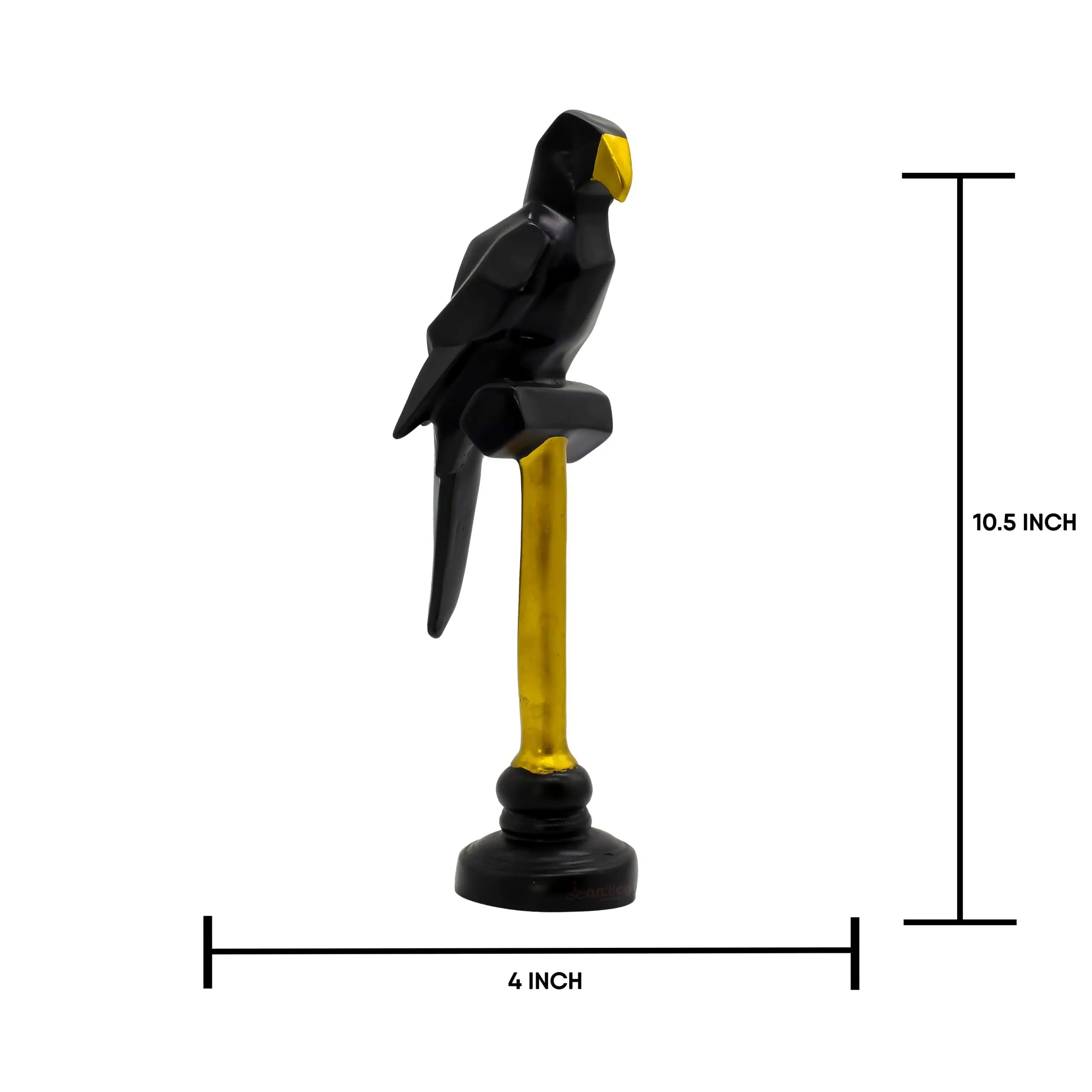 Make a bold style statement with our Geometric Black & Gold Resin Parrot Statue. Stepping away from traditional realistic styling, this piece embraces the modern "Low Poly" art trend, characterizing the bird with sharp, faceted angles that catch the light in a unique way. The statue features a sleek matte black finish that exudes mystery and sophistication, perfectly highlighted by a luxurious gold beak and matching gold perch. Crafted from durable polyresin, this figurine is designed to stand out. It is the perfect size to sit atop a stack of books, as shown in the image, or to guard your workspace on an office desk. Whether you are aiming for an Industrial, Nordic, or Minimalist aesthetic, this abstract bird adds a touch of artistic intelligence and high-contrast elegance to your home decor without overwhelming the space.