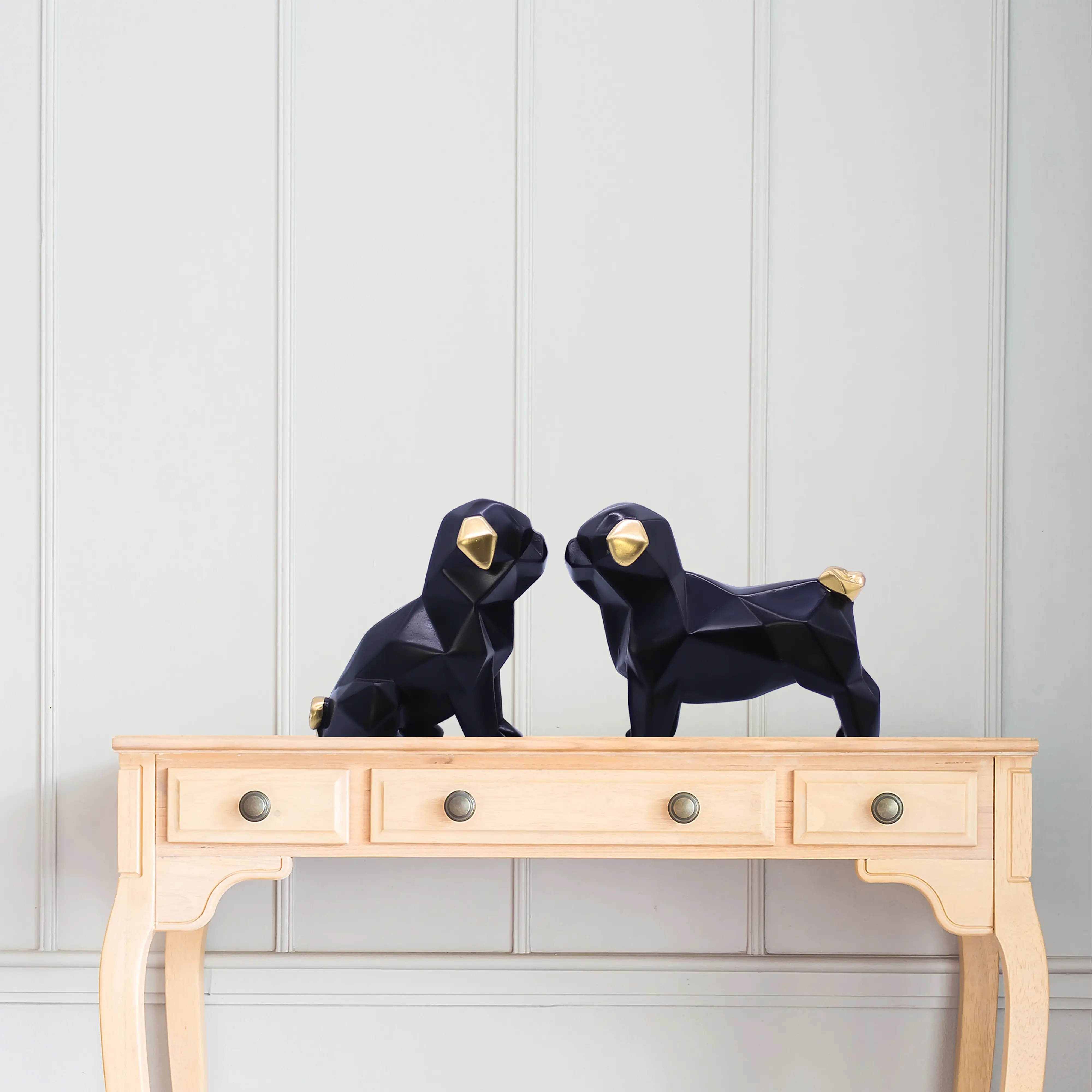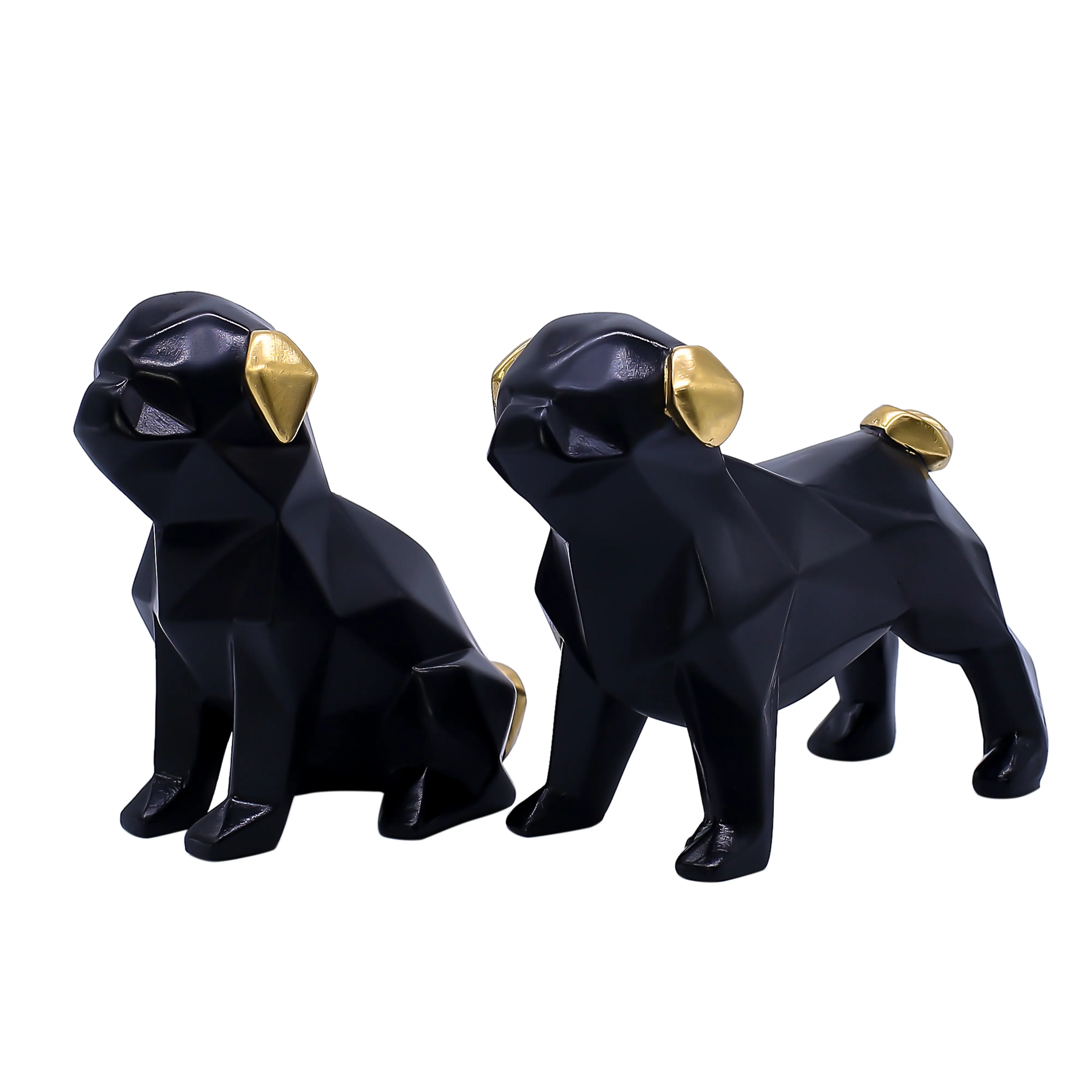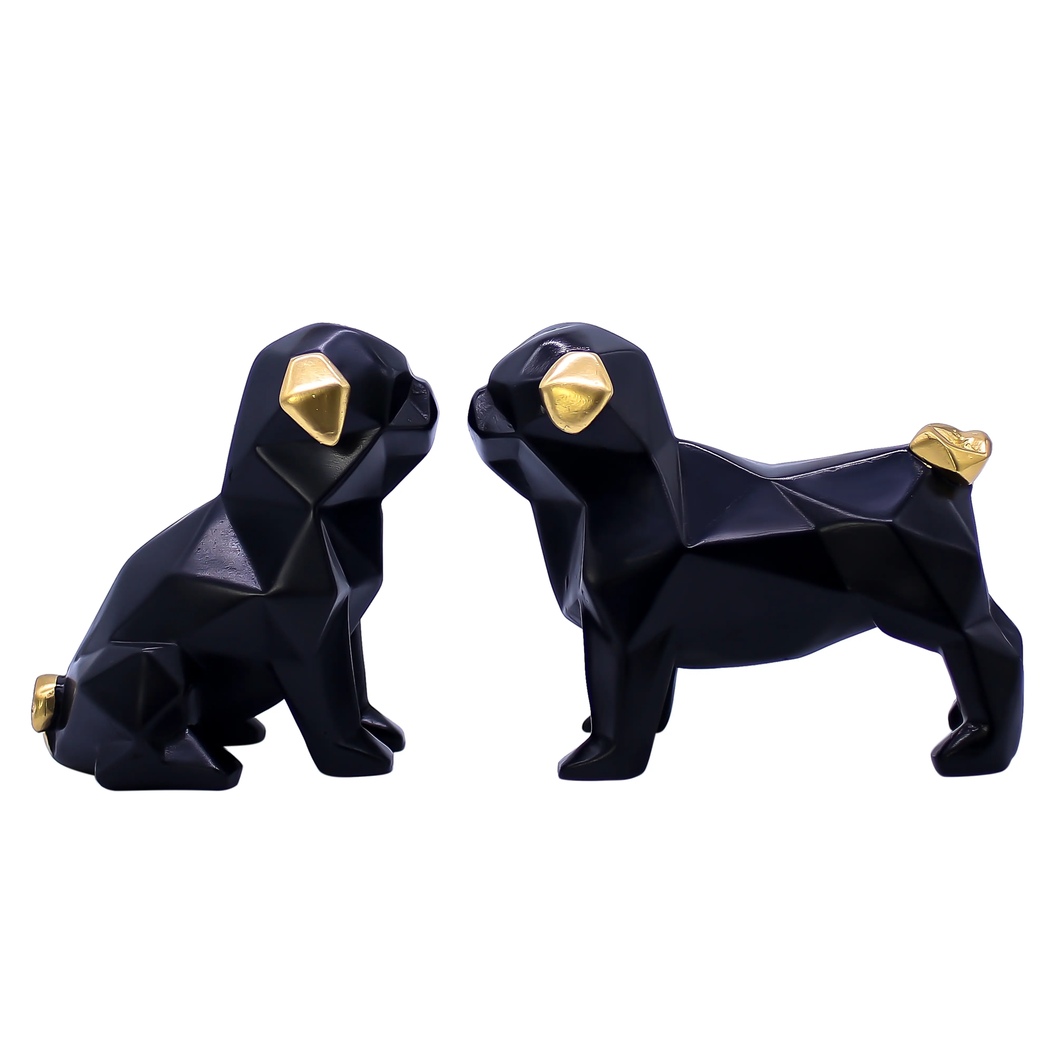 A Modern Tribute to Man’s Best Friend If you love dogs and modern design, this Geometric Black Pug/Bulldog Set is the perfect addition to your home collection. Moving away from traditional, realistic animal figurines, this set embraces the "Low Poly" art trend, where forms are created using geometric shapes and angular facets. This abstract style allows the statues to blend seamlessly into modern, industrial, and Scandinavian decor themes without looking cluttered or "old-fashioned."