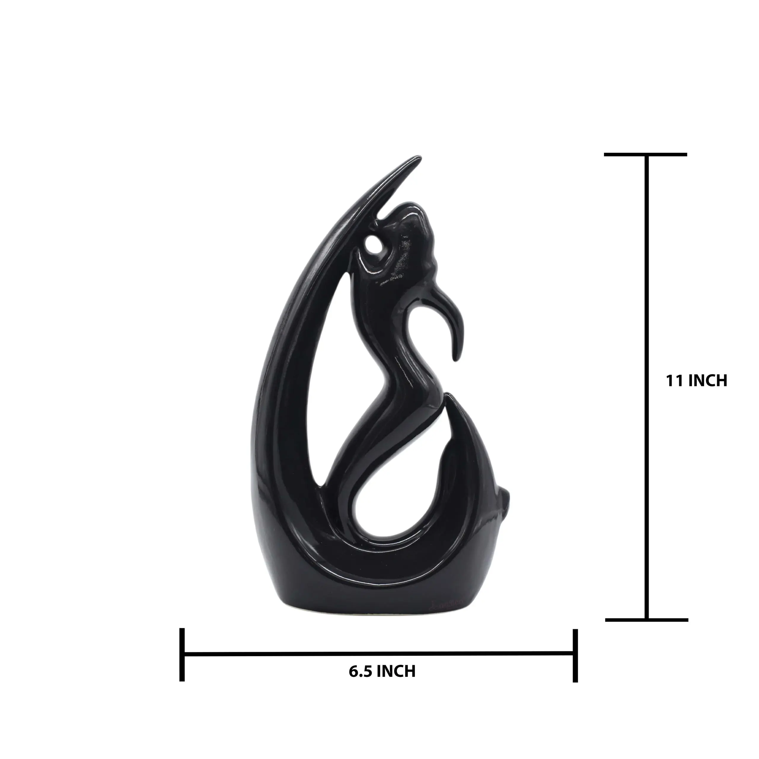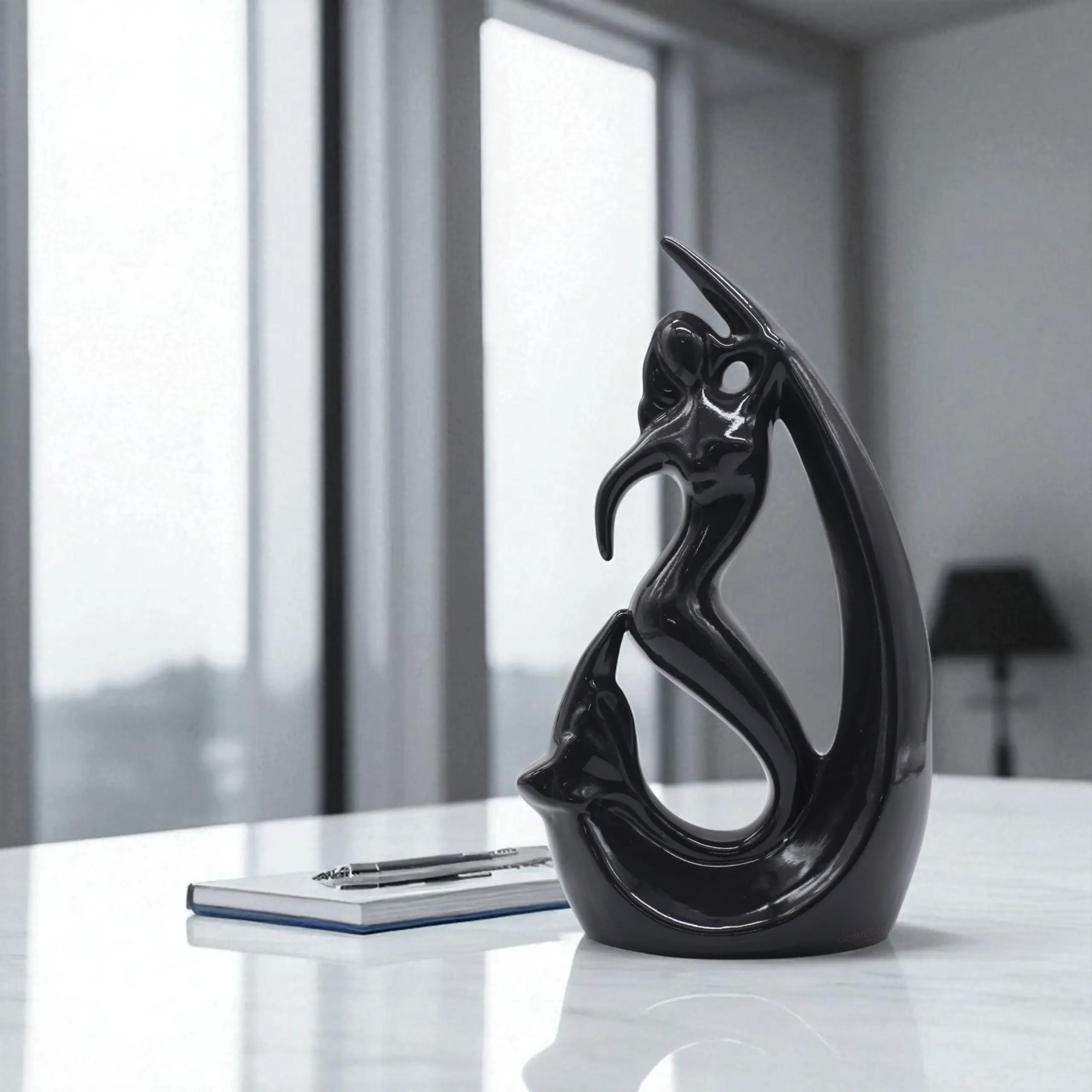 Exquisite Ceramic Craftsmanship This figurine is not a mass-produced resin item; it is a solid piece of ceramic art. The defining feature is the Mirror-Like Black Glaze. As seen in the images, the surface is incredibly reflective, mimicking the look of polished obsidian or black lacquer. This finish gives the statue a liquid-like quality, emphasizing the seamless flow of the arched back and extended limbs.