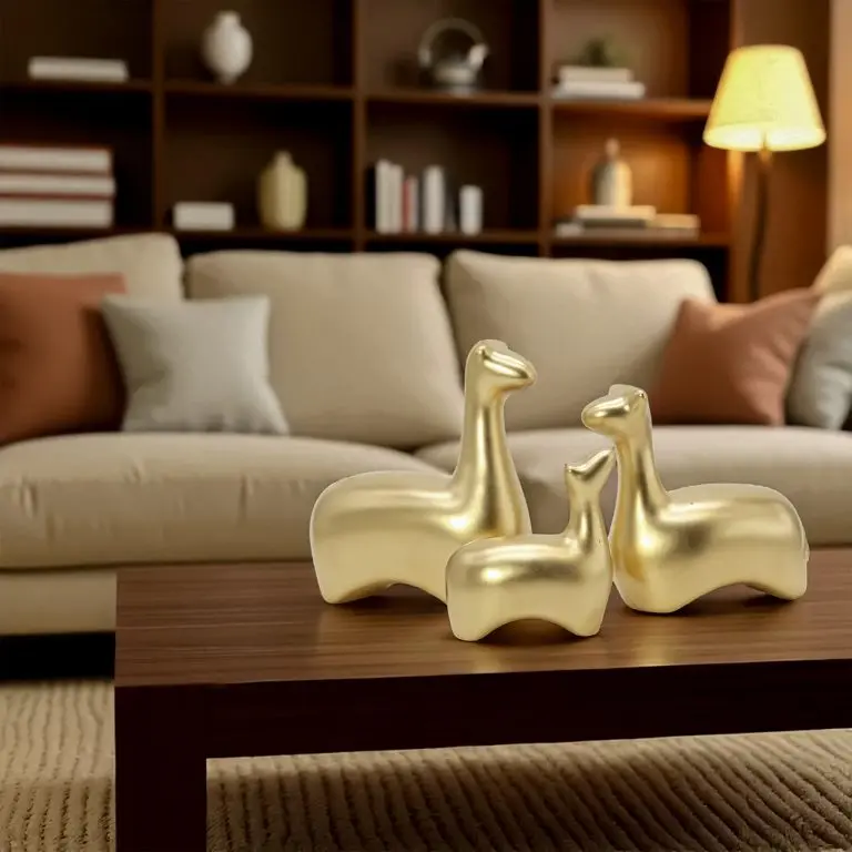 Add a touch of opulent glamour to your interior with this striking set of three ceramic llama or alpaca sculptures. Finished in a dazzling, matte metallic gold, these abstract figures feature smooth, rounded forms that exude modern luxury. The set beautifully symbolizes family connection and abundance. Ideal for adding a sophisticated, rich accent to a monochrome or contemporary space, serving as a powerful and elegant statement piece for your shelf or desk.