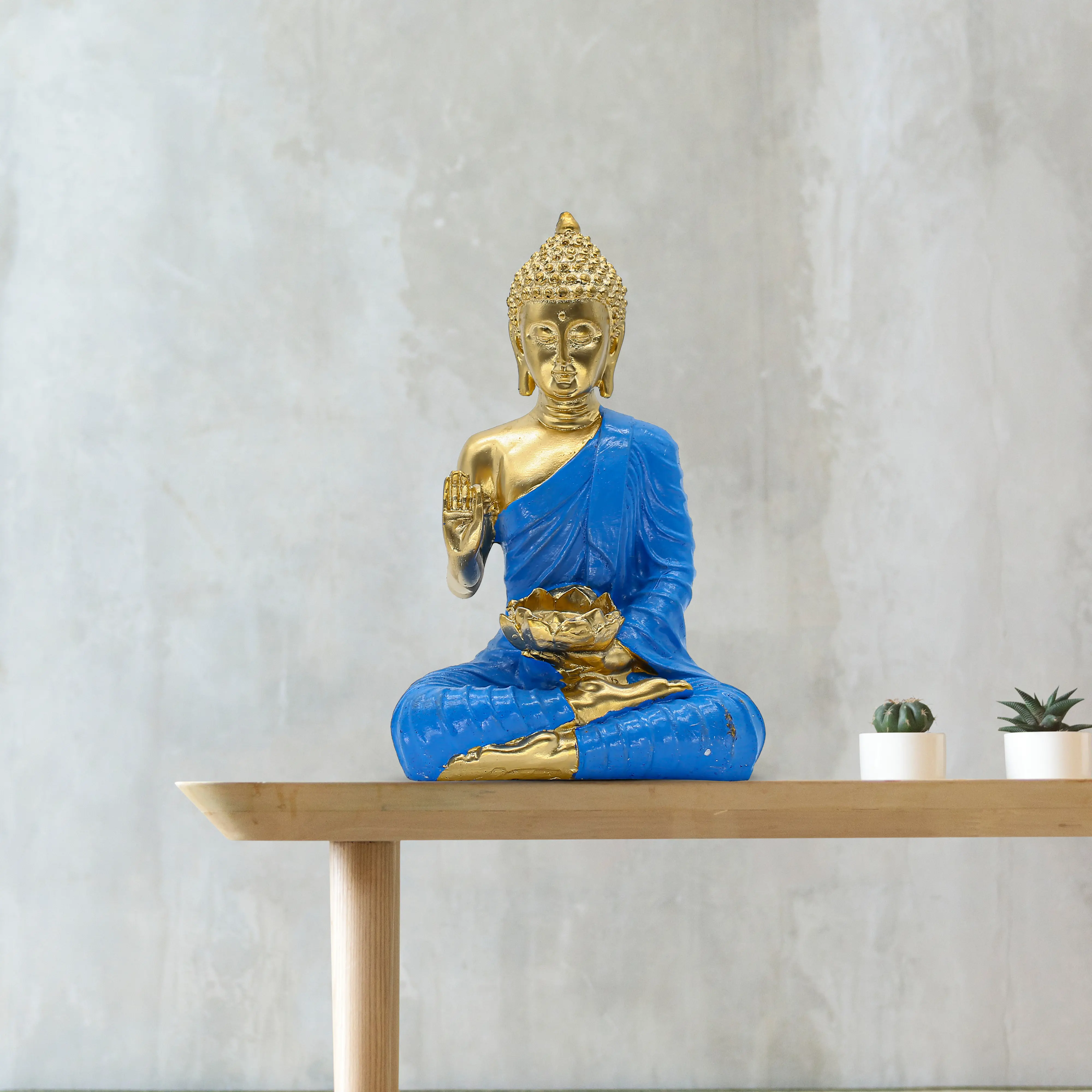Enhance your home with peace and positivity using this Golden & Blue Meditating Buddha Resin Statue with Candle Holder. Designed in a calm meditative posture, this Buddha idol symbolizes serenity, mindfulness, and spiritual harmony. The elegant golden finish paired with a royal blue robe creates a luxurious and modern look that blends effortlessly with both traditional and contemporary interiors. Crafted from premium-quality resin, this statue is lightweight, durable, and finely detailed. The built-in candle holder adds a soothing glow, making it perfect for meditation rooms, living rooms, offices, yoga studios, temples, and reception areas. As per Vastu and Feng Shui, placing a meditating Buddha helps attract positive energy, calmness, and mental clarity. This Buddha showpiece is also an excellent gift choice for Diwali, housewarming, weddings, anniversaries, and spiritual occasions, making it a meaningful décor piece for every space. ✔ Premium Resin Material – Durable & lightweight ✔ Elegant Golden & Blue Color Combination ✔ Meditating Buddha Pose with blessing hand gesture ✔ Built-in Candle / Tealight Holder for calming ambiance ✔ Ideal for Home, Office, Meditation & Yoga Rooms ✔ Suitable for Vastu & Feng Shui Decor ✔ Perfect for Diwali, Housewarming & Spiritual Gifting ✔ Handcrafted look with fine detailing ✔ Easy to clean and maintain ✔ Enhances luxury, modern & traditional interiors