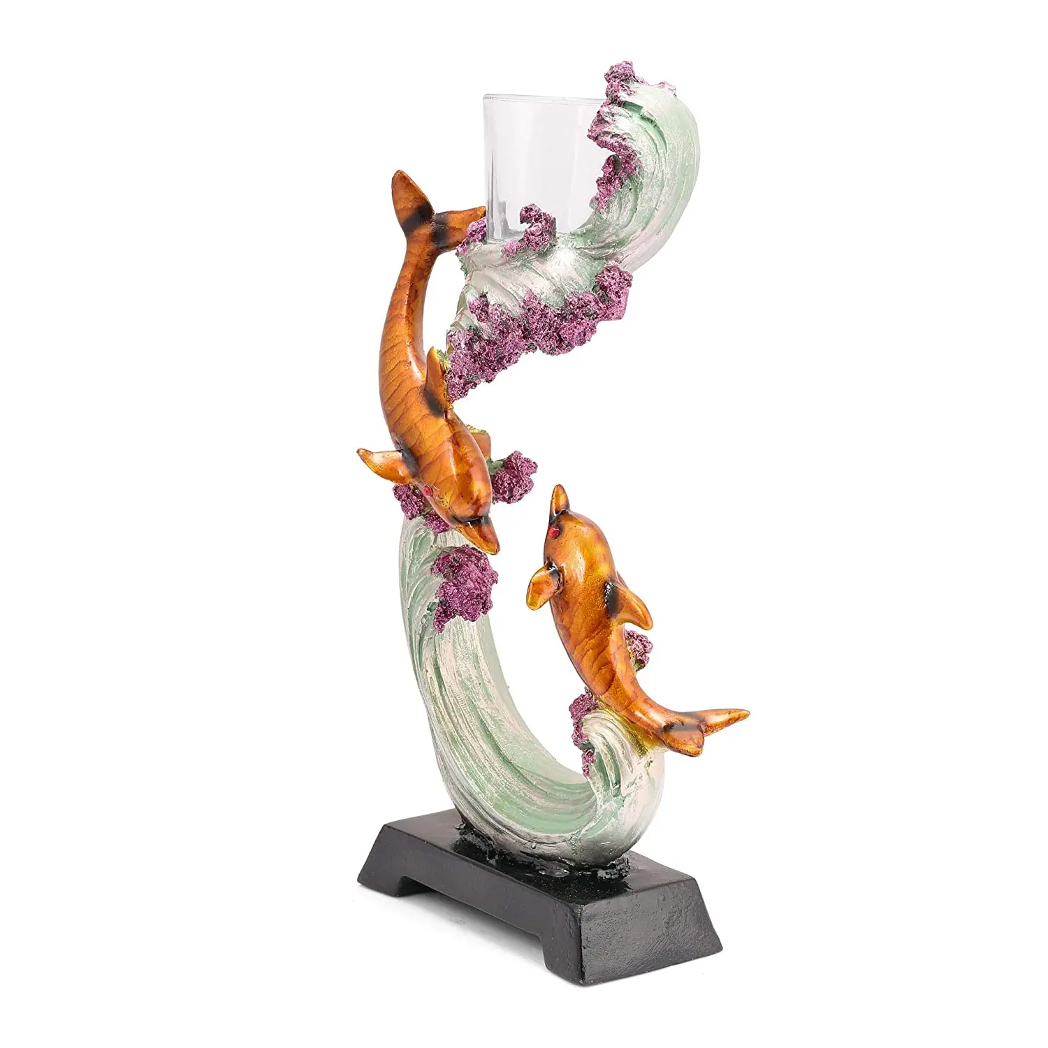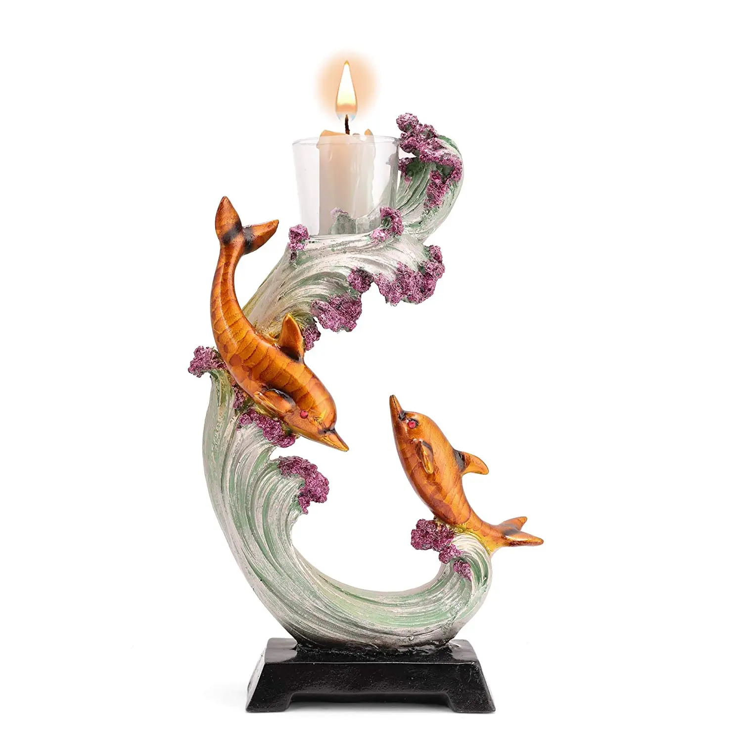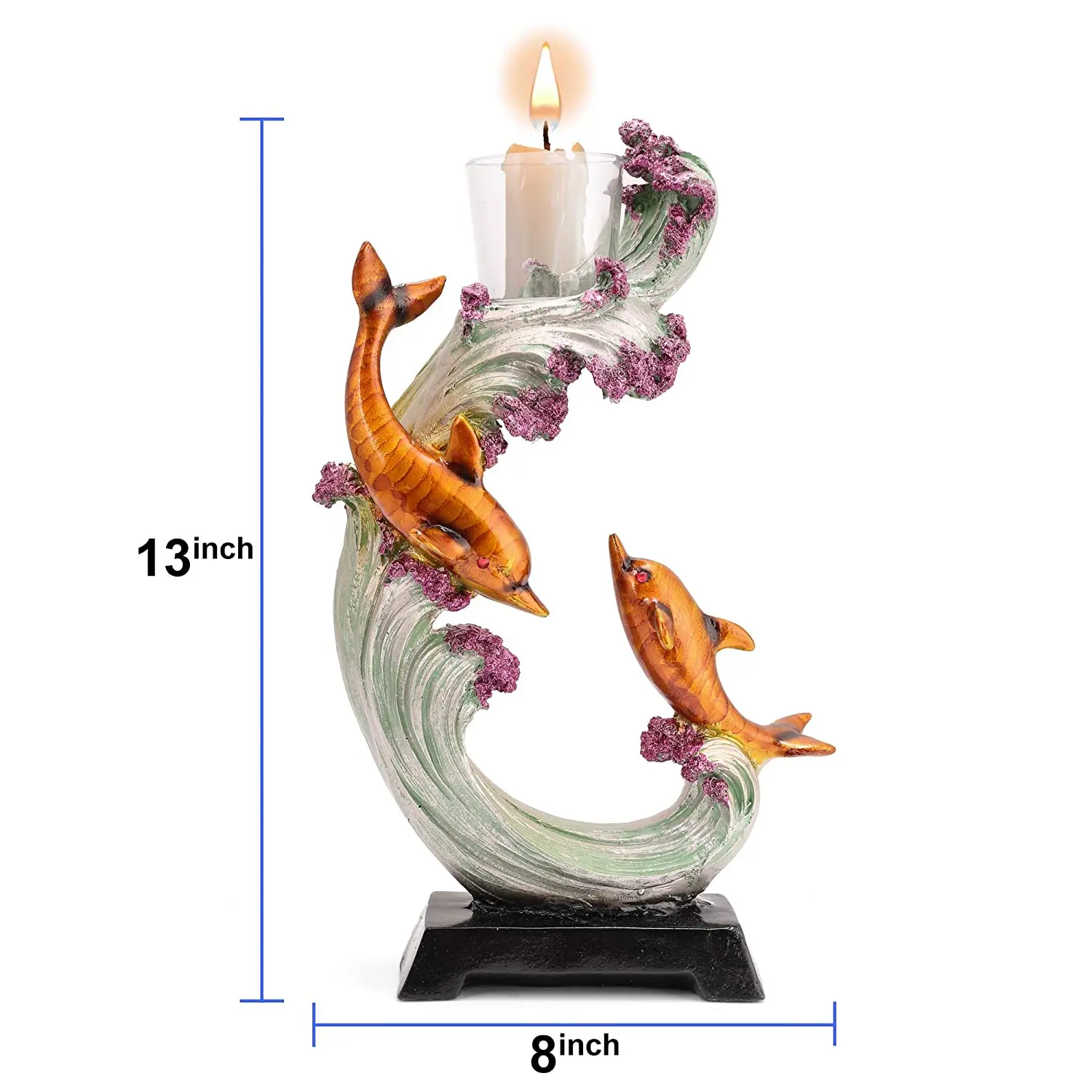 Bring the calming beauty of the ocean into your home with our Polyresin Golden Dolphin Candle Holder. This exquisite showpiece captures the playful spirit of marine life, featuring a pair of vibrant golden-orange dolphins riding a crashing wave. The artistic wave structure, painted in soft greens with unique purple coral textures, curves elegantly to support a clear glass candle cup at the top. When lit, the candle casts a soft, shimmering light that highlights the glossy finish of the dolphins, creating a magical atmosphere. Mounted on a sturdy black rectangular base, this statue is stable and ready to display. Whether you use it to enhance a romantic dinner or to add a splash of color to your bathroom decor, this dolphin figurine is a perfect blend of utility and artistic charm.