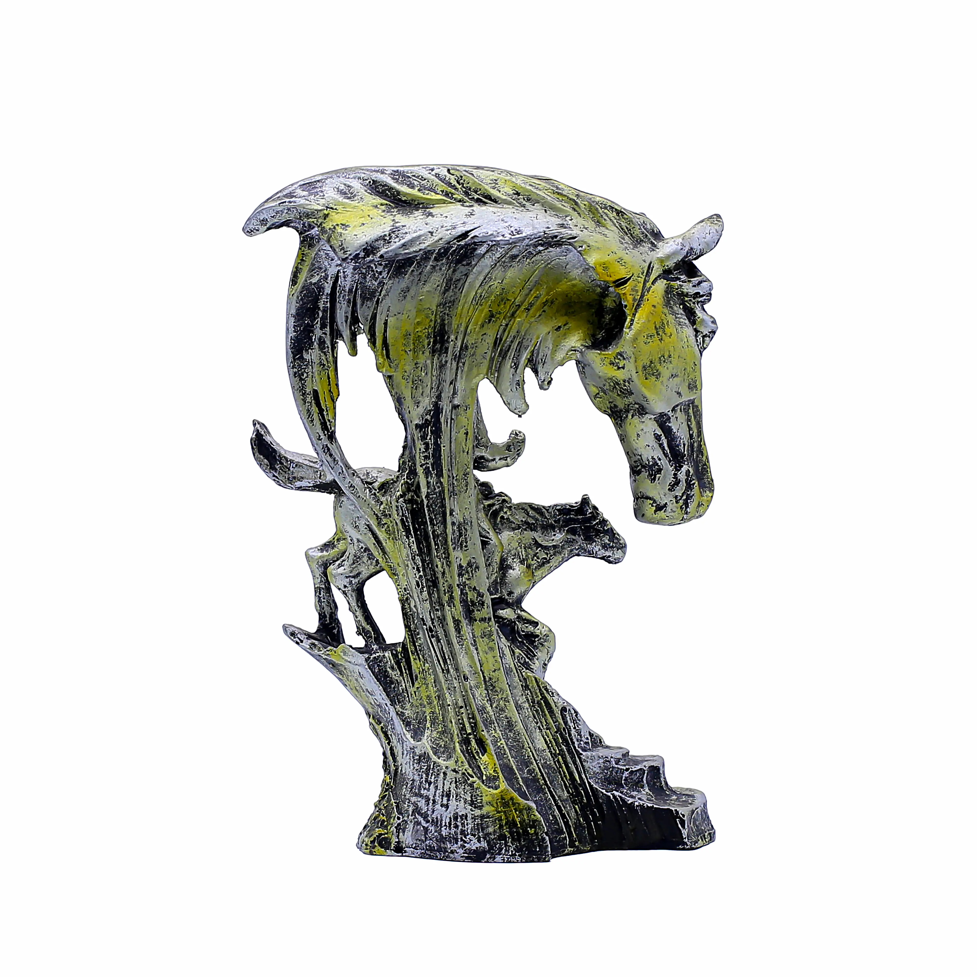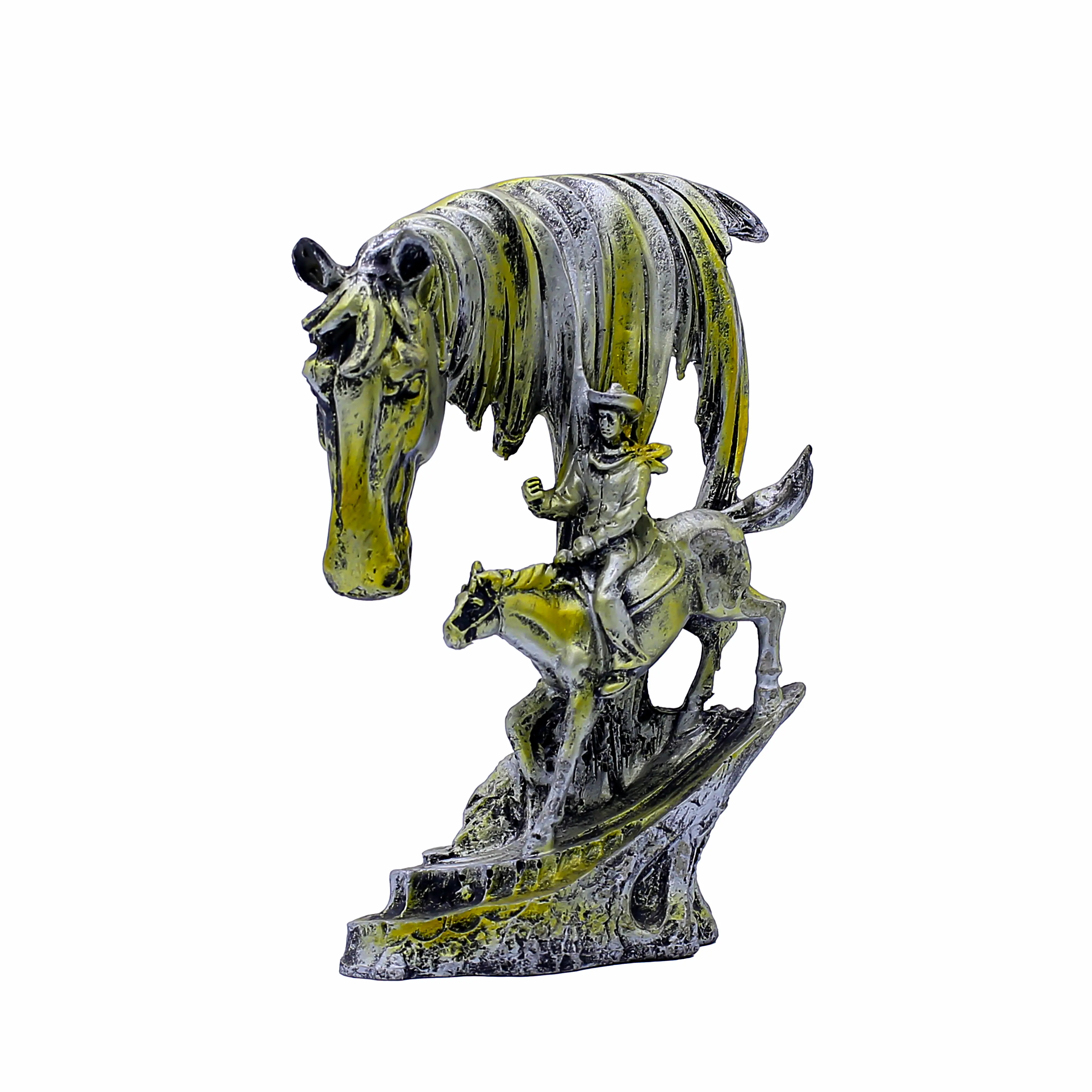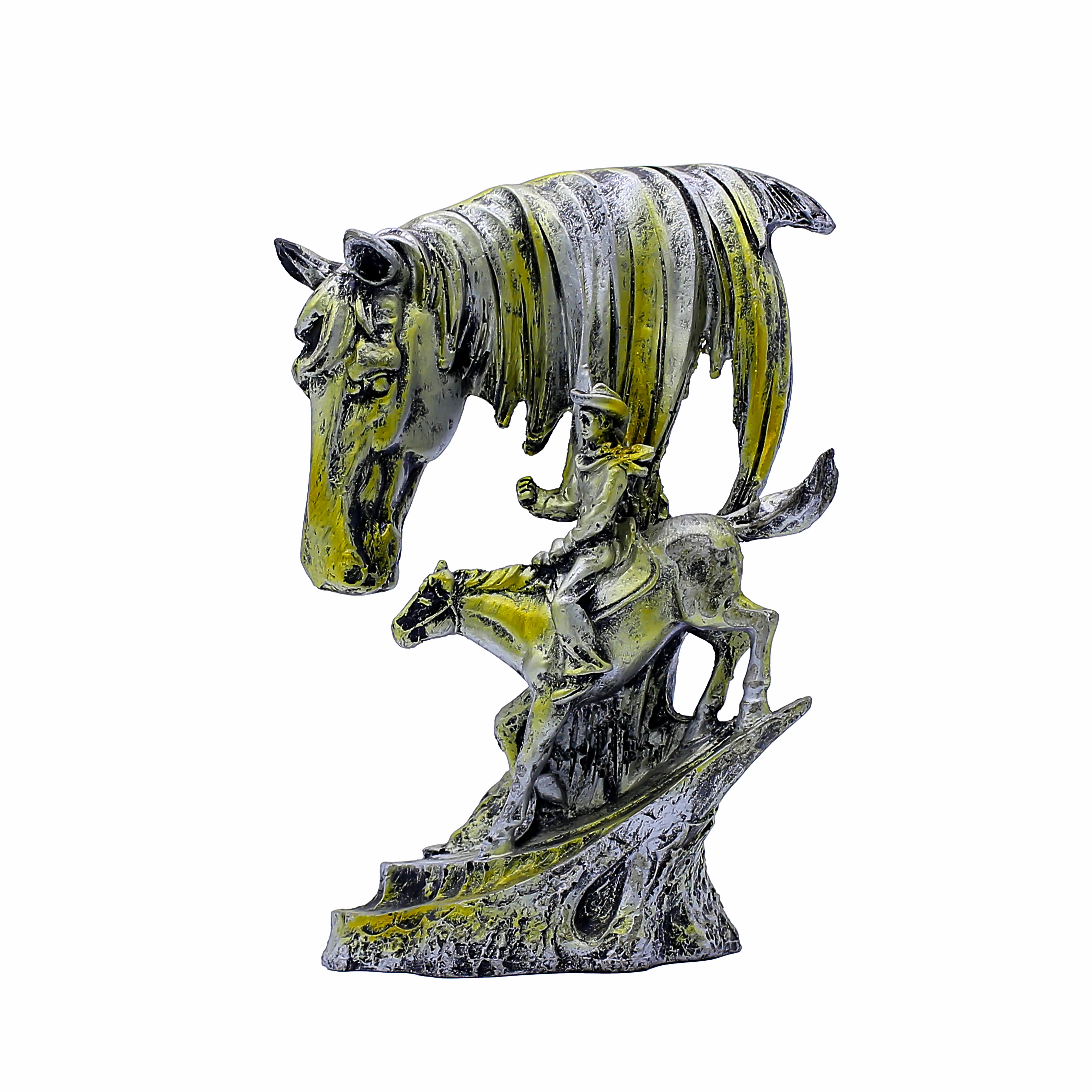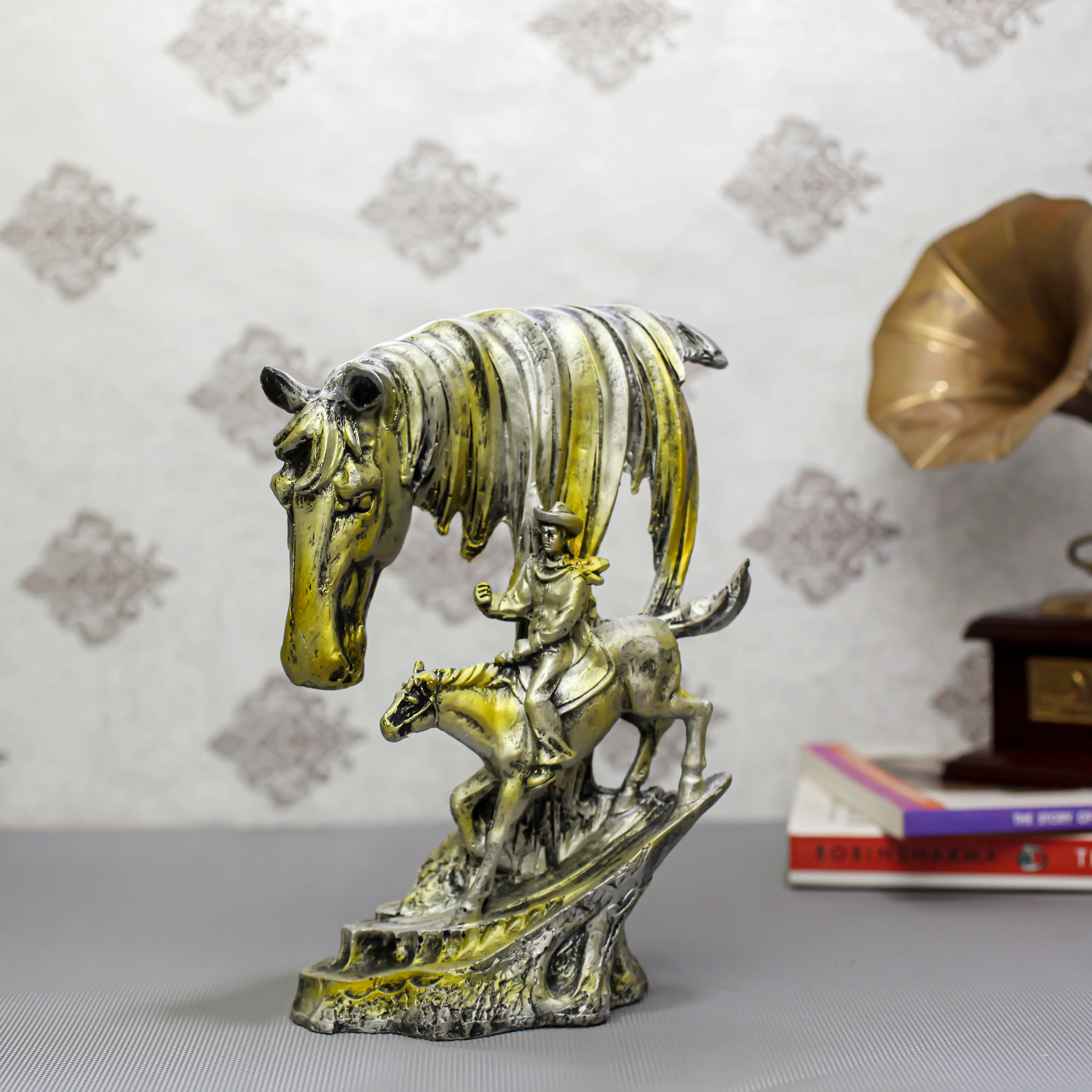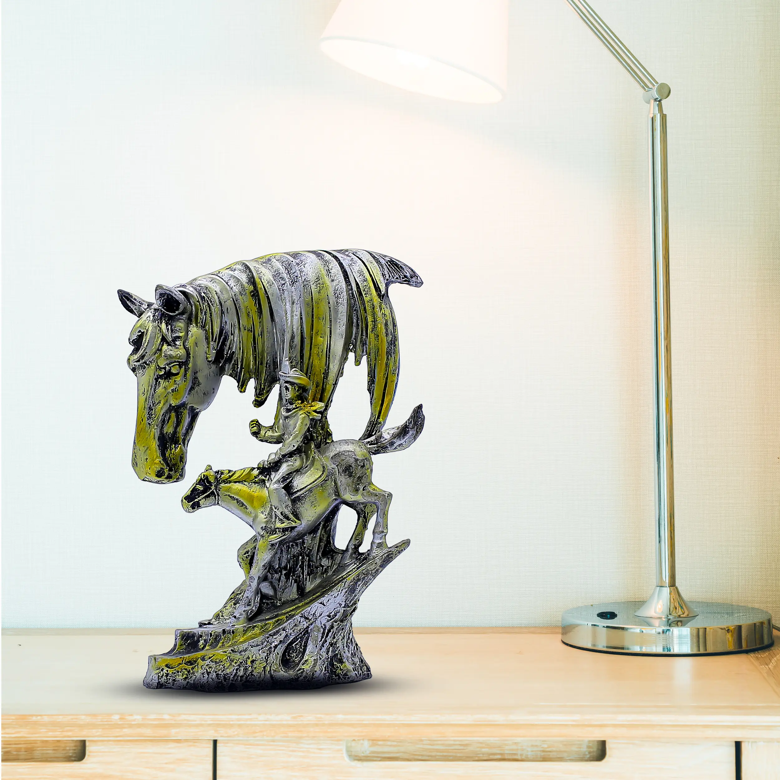 Enhance your interiors with this Artistic Horse & Rider Resin Showpiece, a premium décor piece symbolizing strength, leadership, success, and journey. Designed with a majestic horse head and a finely detailed rider figure, this sculpture adds depth and artistic elegance to any space. Crafted from high-quality resin, it features an antique gold and silver finish that delivers a royal and timeless appeal. Ideal for living rooms, offices, study areas, shelves, and reception desks, this showpiece instantly becomes a conversation-starting centerpiece. Perfect as a housewarming, festive, wedding, anniversary, or corporate gift, it reflects prosperity, motivation, and refined taste. Durable, stylish, and easy to maintain, this horse décor statue is an excellent choice for modern and classic interiors alike.