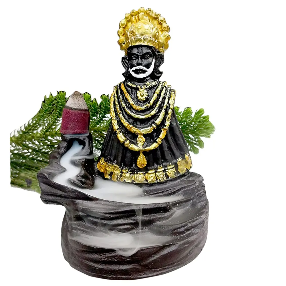 Celebrate your faith and devotion with the Black & Gold Khatu Shyam Ji Resin Backflow Incense Burner. Known as the "Sheesh Ke Dani" (Donor of Head) and the support for the defeated ("Hare Ka Sahara"), Lord Khatu Shyam Ji is worshipped for his immense power and benevolence. This resin masterpiece brings his divine presence into your home in a form that is both artistically beautiful and spiritually uplifting.