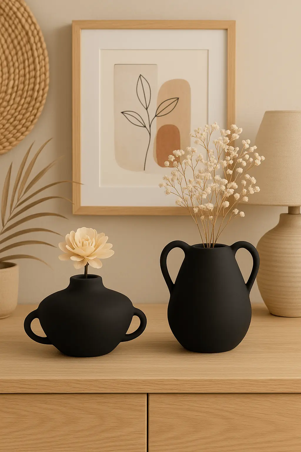 A Textural Experience Crafted from high-quality stoneware, these vases are defined by their finish. We have utilized a specialized soft-touch matte glaze that eliminates glare and reflection. This creates a "velvety" visual effect that exudes luxury and calm. The deep black color is not just a shade; it’s a texture that invites you to touch it, making it a perfect counterpoint to wood, metal, and glass elements in your room.