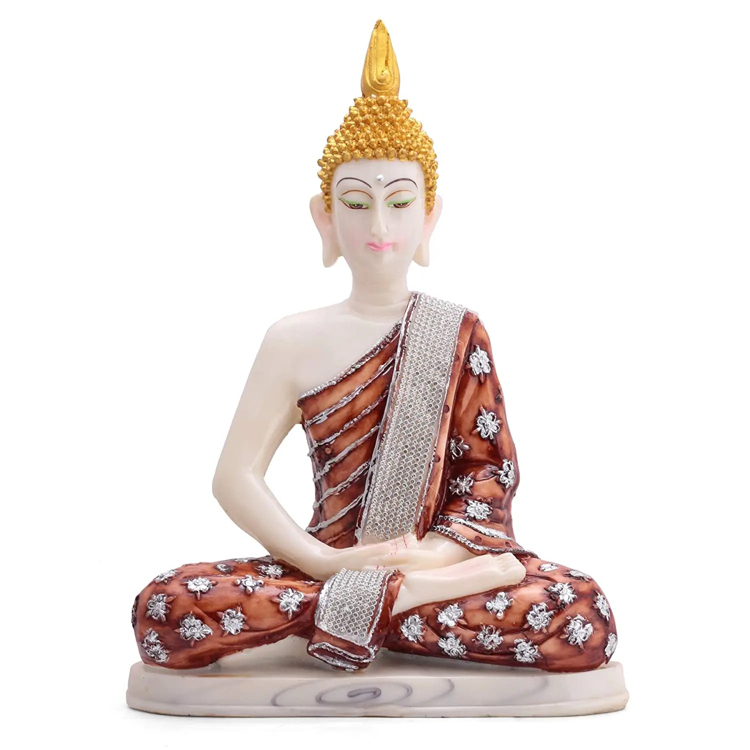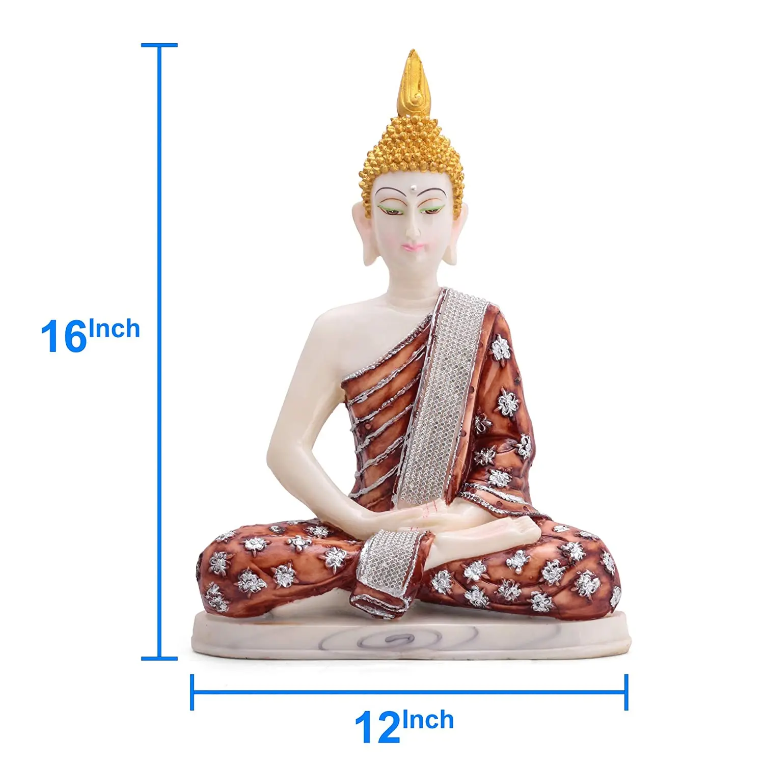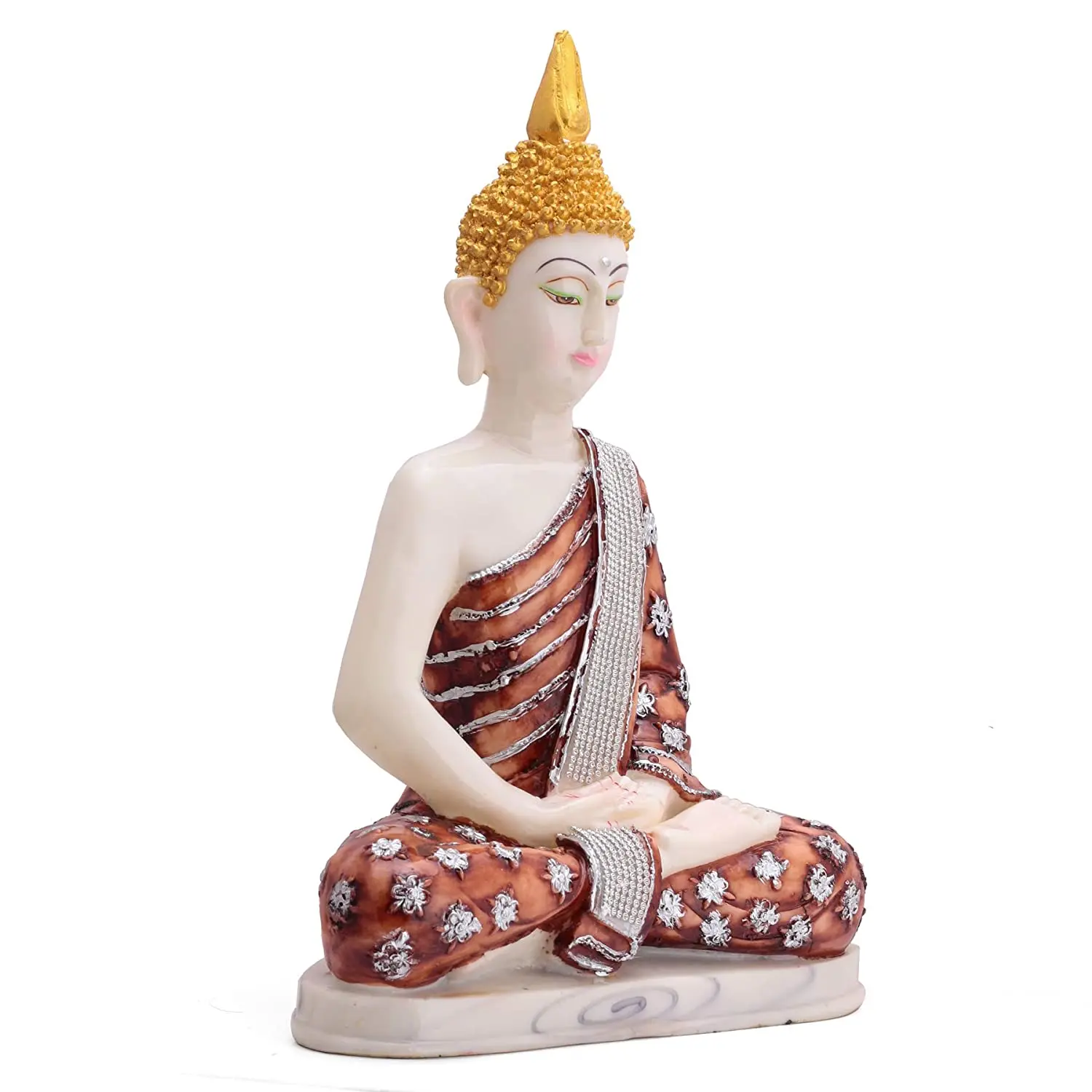 Transform your living space into a sanctuary of tranquility with our Polyresin Meditating Buddha Statue. This stunning showpiece captures the essence of spiritual serenity, featuring Lord Buddha in a deep meditative state. The figure is designed with a soothing white complexion that radiates calmness, topped with a traditional golden headpiece that signifies enlightenment. What sets this statue apart is the magnificent detailing on the attire. The Buddha is draped in a reddish-brown robe, meticulously hand-painted with sparkling silver floral motifs and geometric borders that catch the light beautifully. Whether placed on a console table, inside a glass cabinet, or on your office desk, this figurine serves as a daily reminder of mindfulness and balance. Durable, lightweight, and easy to maintain, it blends traditional spirituality with modern aesthetic appeal, making it a must-have for any art lover.