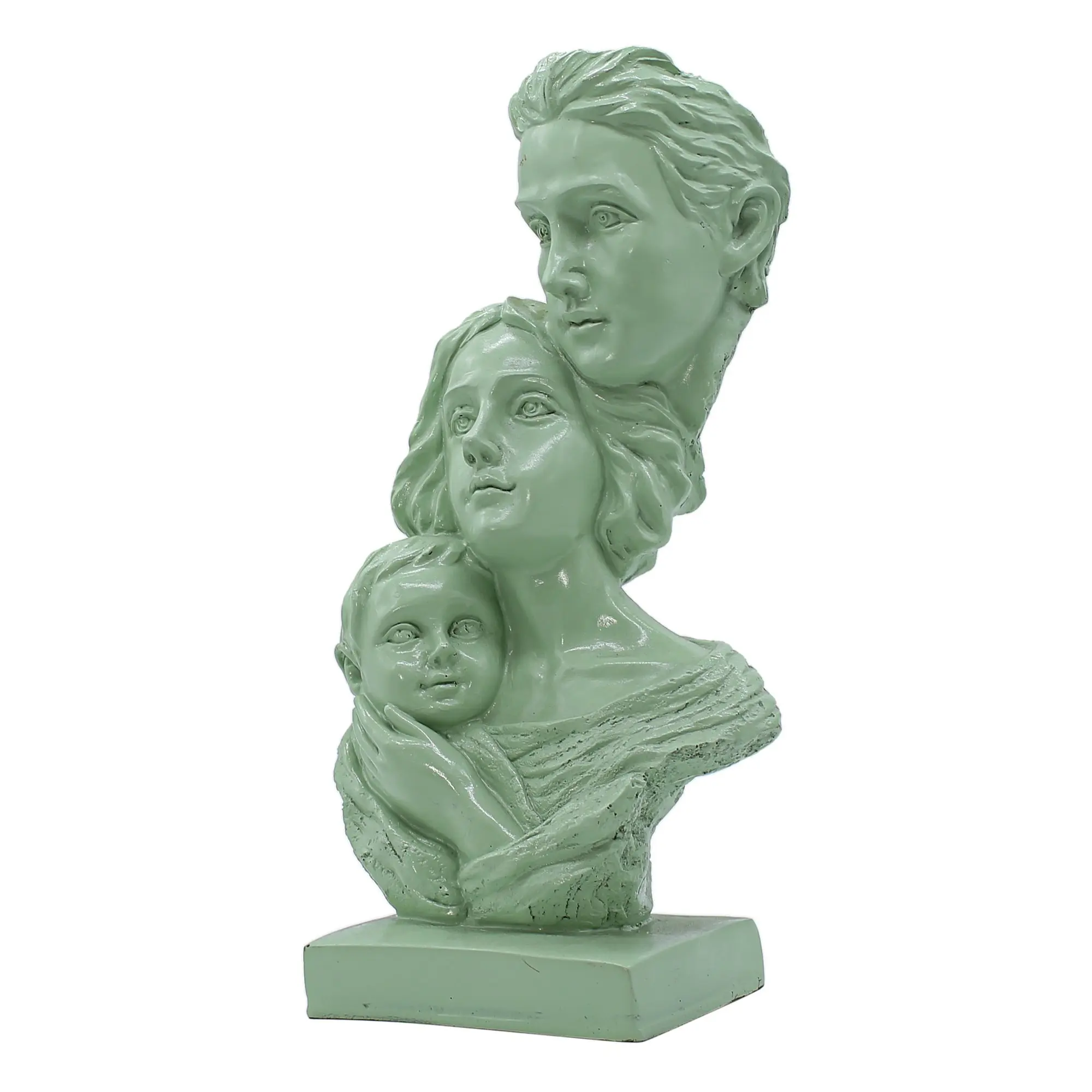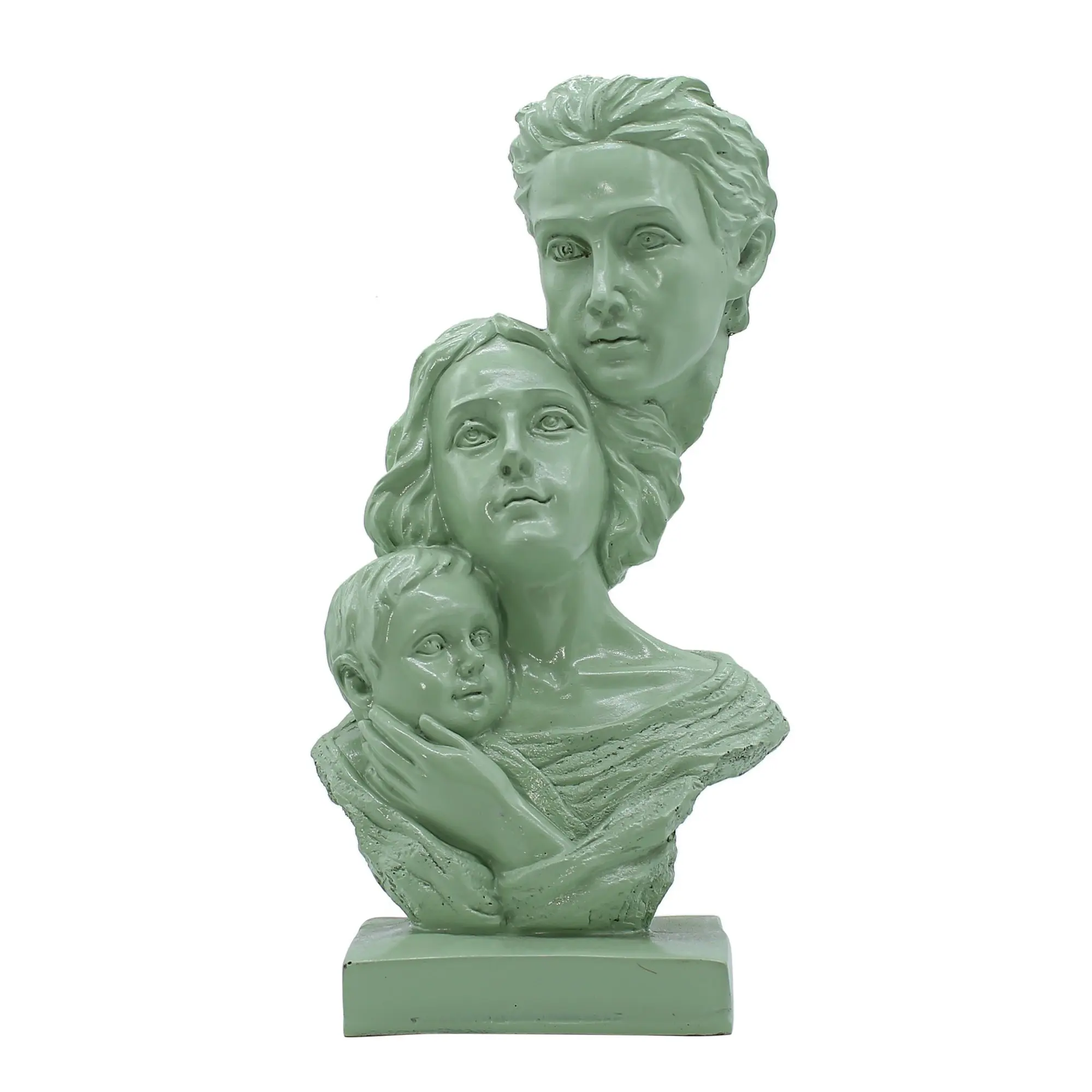 Distinctive Design & Aesthetics This piece distinguishes itself with its creative composition. Rather than standing side-by-side, the figures are artistically layered. The father’s face looks forward with strength, the mother’s face is tilted gently, representing grace, and the child is nestled securely at the bottom. This hierarchy symbolizes the shelter and foundation parents provide. The color choice is equally deliberate. The soft teal (or seafoam green) hue is associated with emotional healing, tranquility, and balance. Unlike standard bronze or gold statues, this fresh color brings a youthful, contemporary vibe to your decor, making it perfect for modern apartments, coastal-themed rooms, or eclectic interiors.