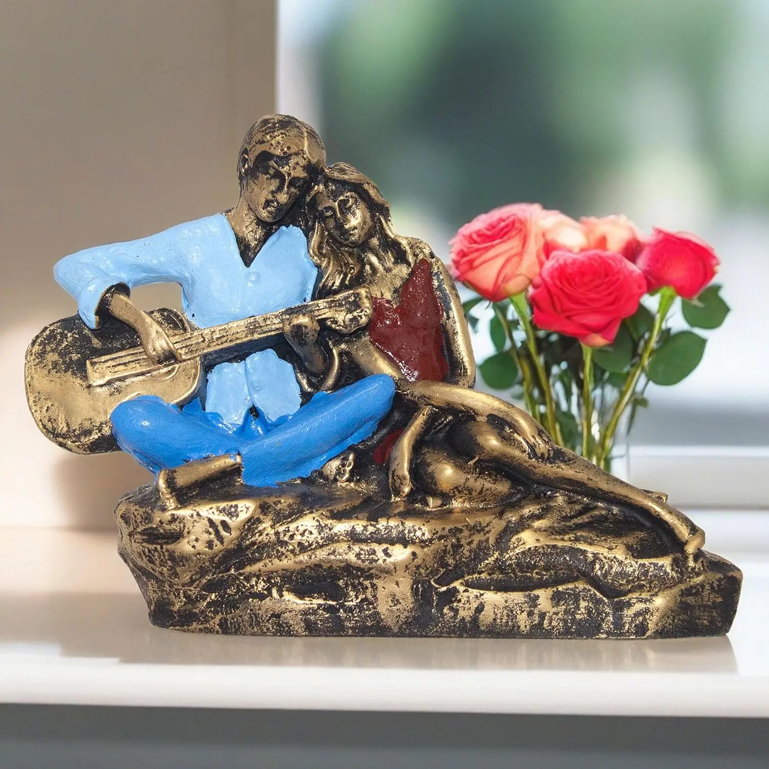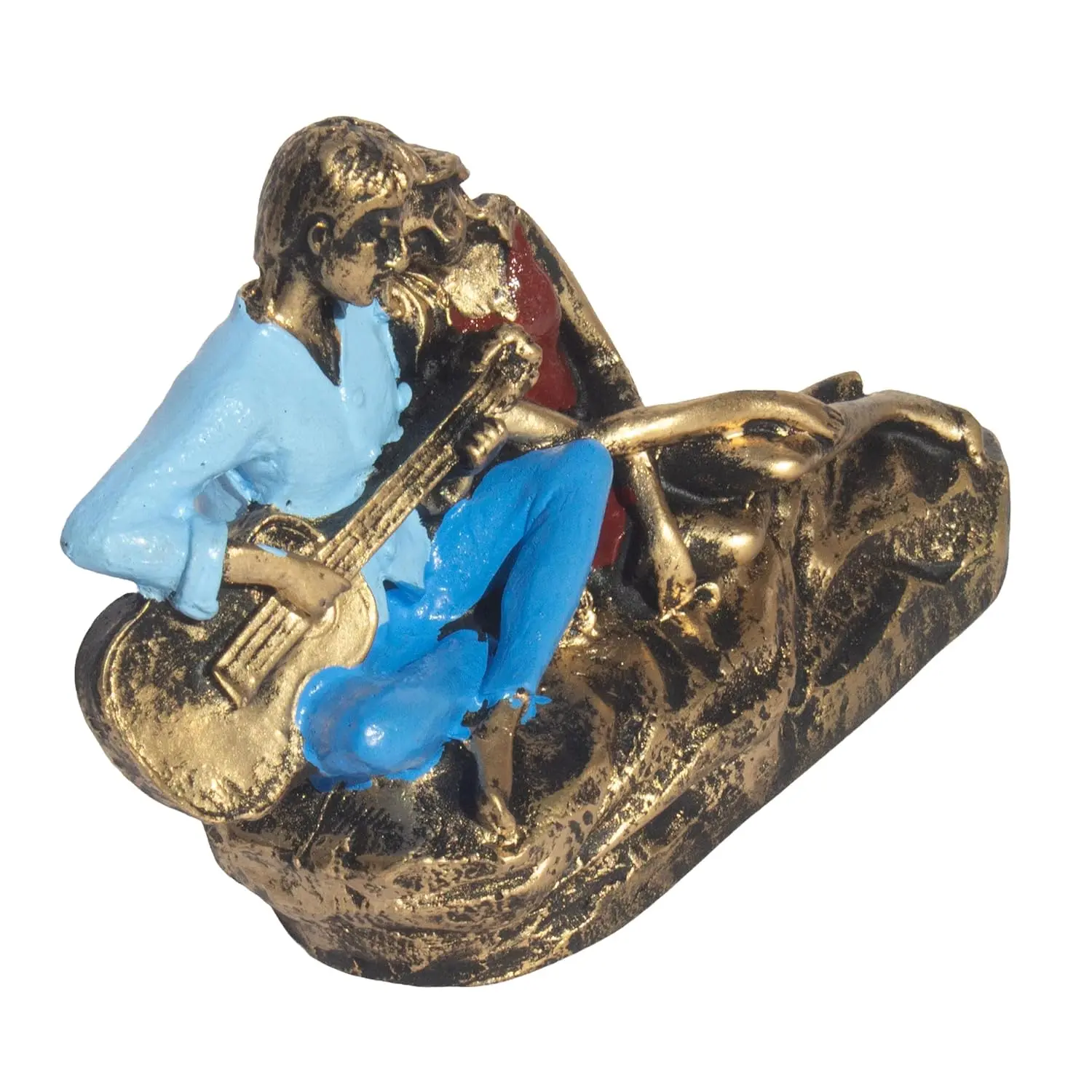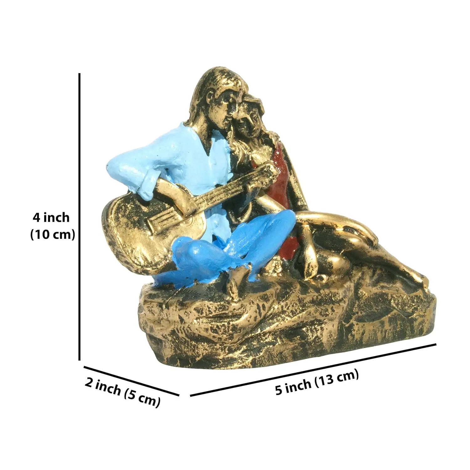 Let love play its tune in your home with our Romantic Musical Couple Statue. This handcrafted showpiece tells a story without words. It freezes a beautiful, intimate moment where a husband/boyfriend serenades his wife/girlfriend with a song. The relaxed body language—him cross-legged with the guitar, her reclining comfortably—radiates peace and intimacy. The craftsmanship is a blend of modern art and traditional warmth. The Antique Gold finish on their faces and limbs gives it a premium, gallery-style aesthetic, while the splashes of Blue and Red on their clothes add life and vibrancy. The textured base, designed to look like a golden rock, adds stability and grandeur. Whether placed on a bedside table or a living room shelf, this statue serves as a constant reminder of the romance that keeps a relationship alive.