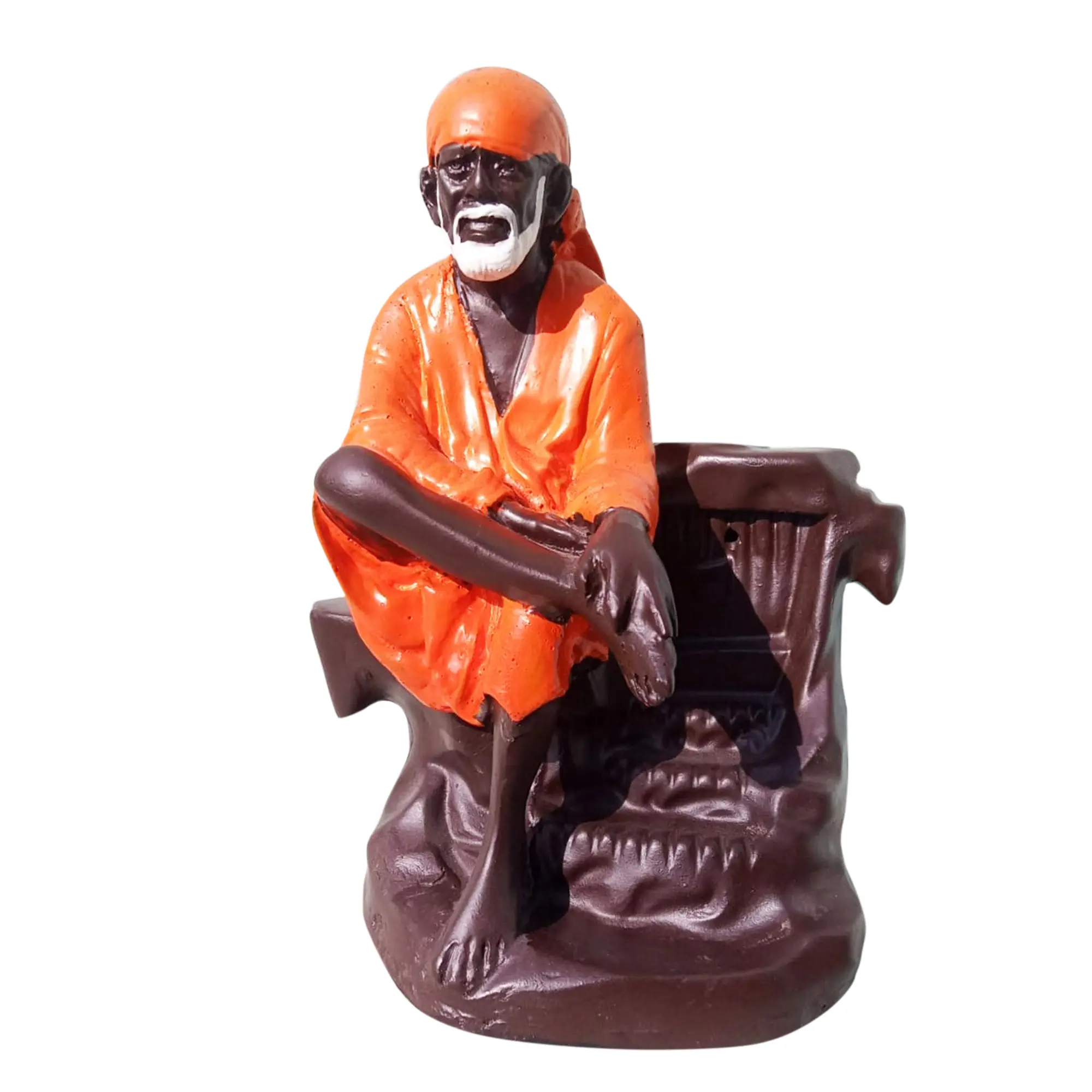 A Tribute to the Saint The focal point of this piece is the lifelike figure of Sai Baba. He is depicted sitting on a stone ledge, wearing his traditional bright orange kafni (robe) and head covering, which stand out vividly against his dark skin tone and white beard. His posture is relaxed, with one leg crossed over the other, embodying a state of deep meditation and approachability. The base is sculpted to look like a dark, glossy rock formation, perhaps reminiscent of the stone he sat upon in Dwarkamai.