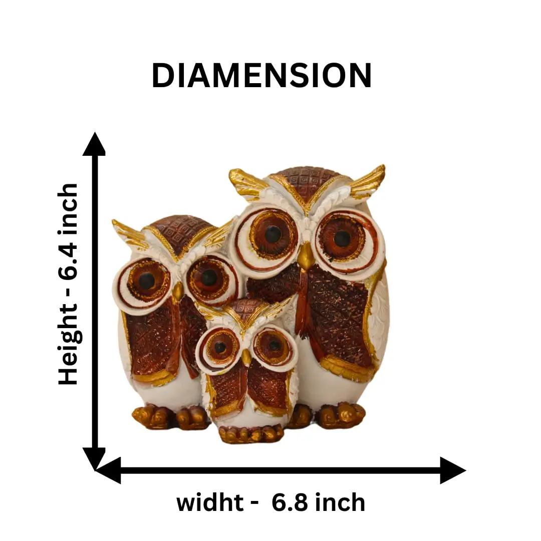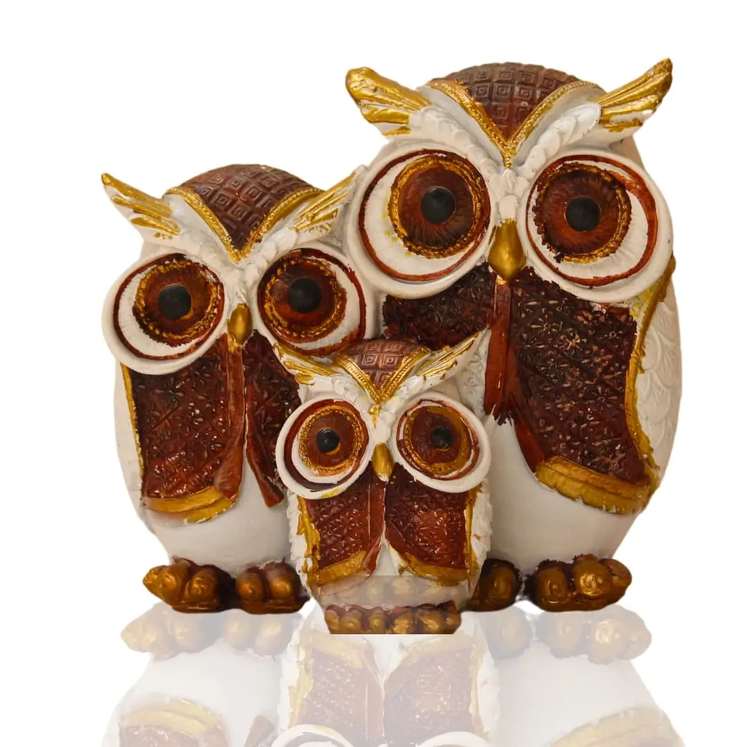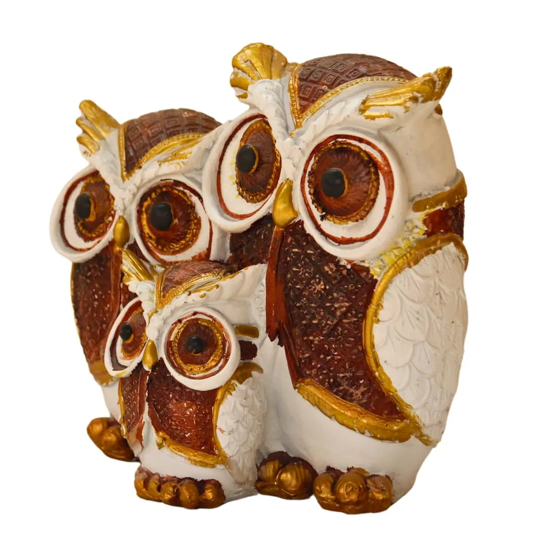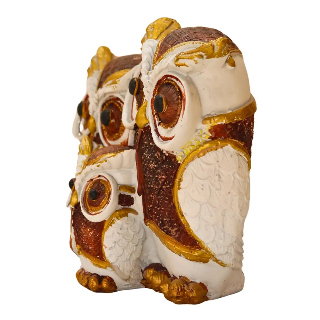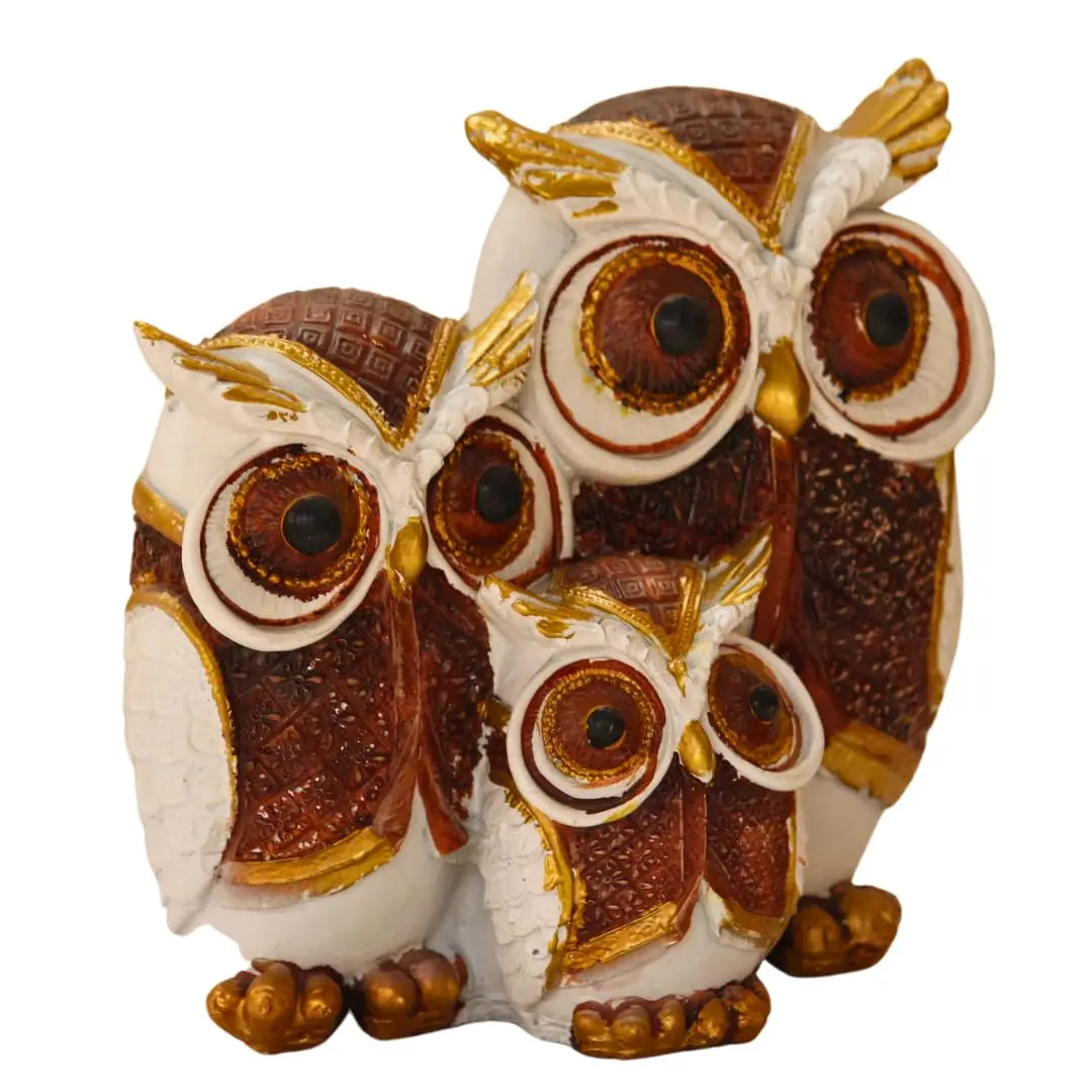Add a touch of wisdom and whimsy to your interiors with our Handcrafted Owl Family Statue. This delightful showpiece captures a family of three owls in a moment of quiet observation. With their large, captivating eyes framed in gold and copper tones, they seem to look right into your soul. The craftsmanship is distinctively artistic. The smooth white resin contrasts beautifully with the textured brown panels on their bodies, which mimic the look of embroidered fabric or carved wood. The Gold Highlights on the eyebrows and feet add a hint of glamour, ensuring the piece doesn't look too rustic. Whether you are styling a "Boho-Chic" living room or looking for a "Wise Companion" for your study table, this stable, heavy-bottomed statue is the perfect choice. It’s a small piece of art that carries a big meaning about the importance of family and knowledge.