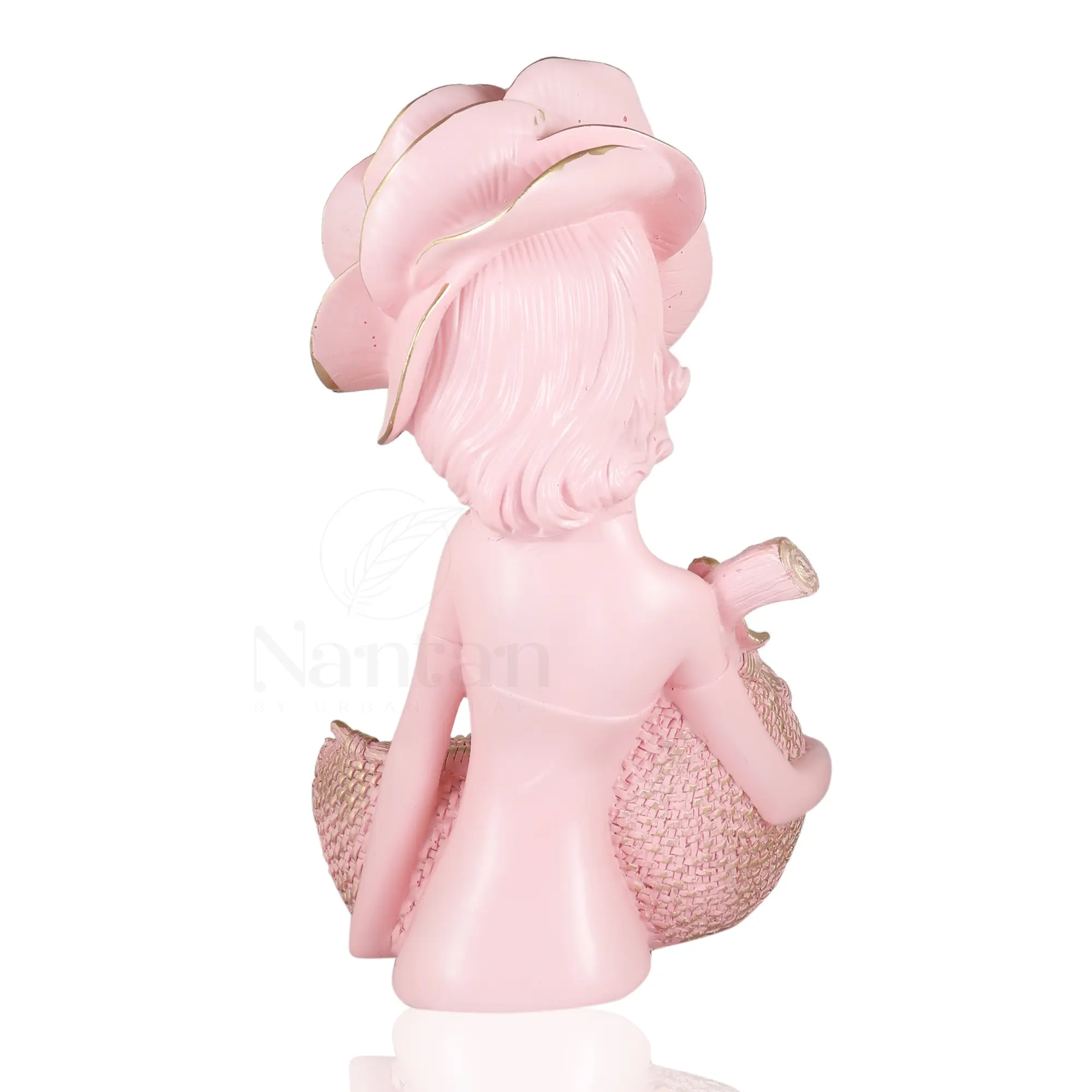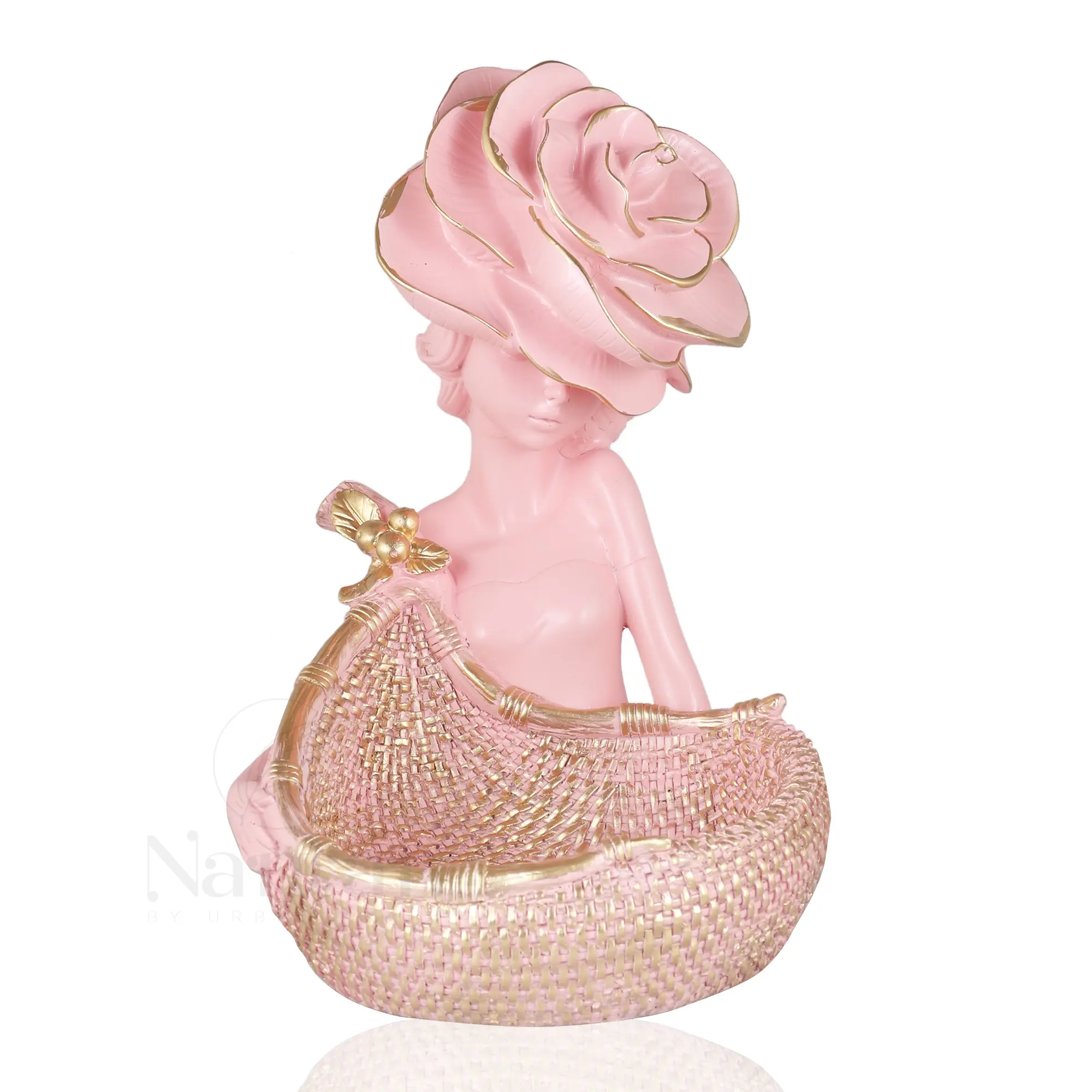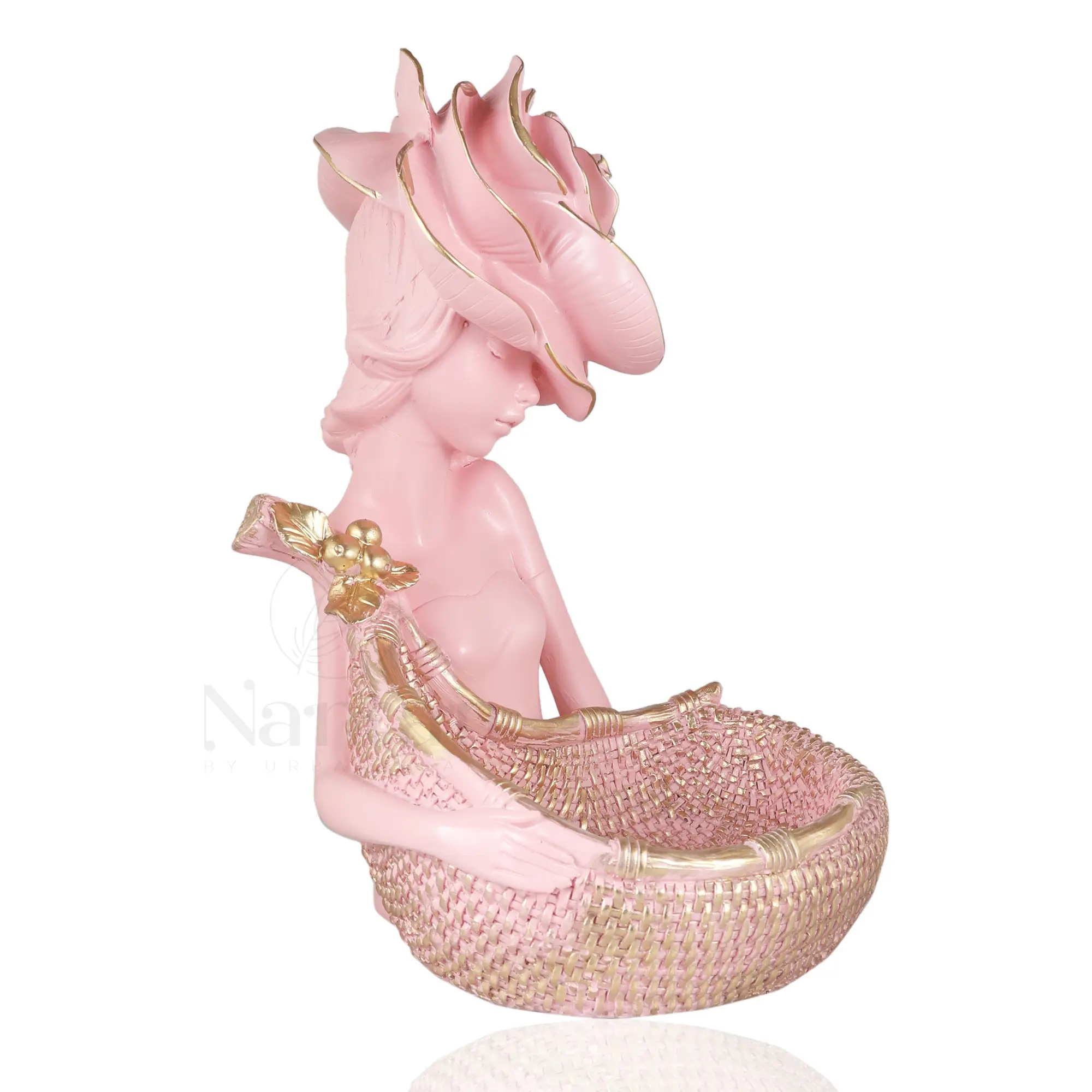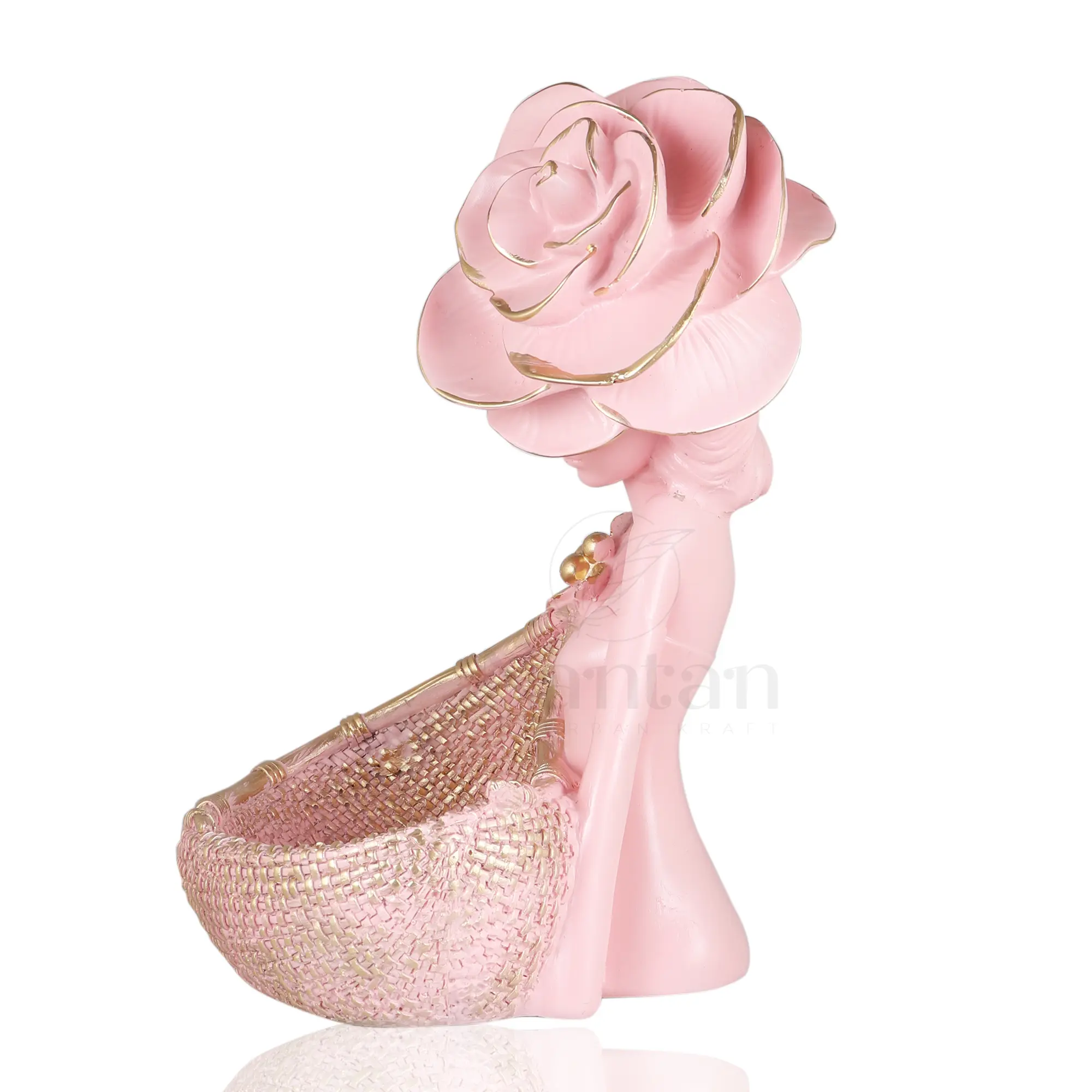 Add a touch of whimsy and elegance to your daily routine with our Pink & Gold Polyresin Rose Girl Storage Bowl. This captivating figurine is designed for the modern home that values both beauty and organization. The sculpture depicts a poised lady holding a basket, but with a surreal twist—her head is a magnificent, blooming pink rose outlined in shimmering gold. This piece solves the problem of "clutter" with style. Place it on your foyer console table, and it becomes the perfect catch-all for your keys and loose change. On a dining table, it serves as a delightful candy or fruit server. On a vanity, it keeps your rings and earrings safe. The intricate detailing on the basket mimics the look of woven wicker, showcasing the expert craftsmanship of our artisans. It is not just a statue; it is a functional piece of art that brings a smile to your face every day.