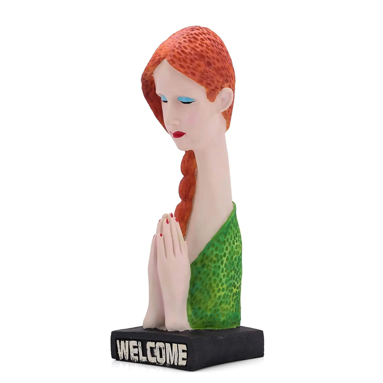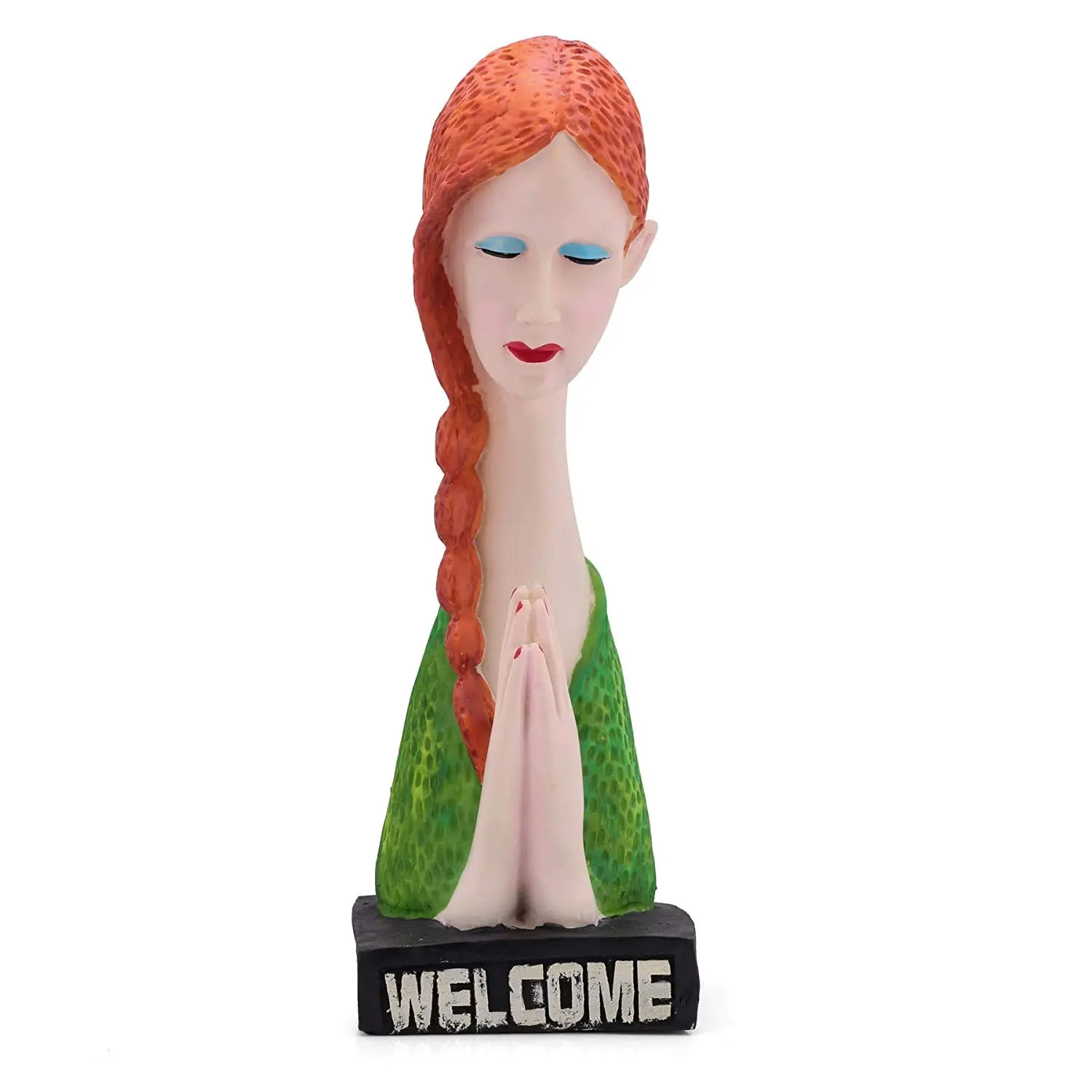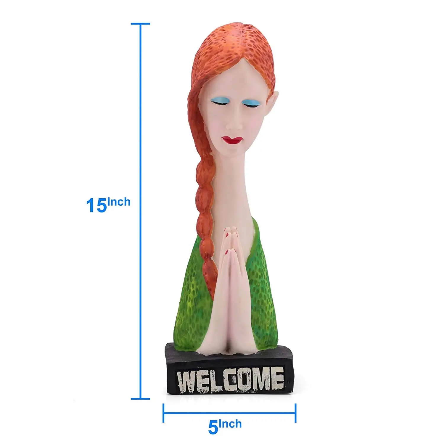 First impressions matter, and there is no better way to greet your guests than with our Polyresin Welcome Lady Statue. This delightful showpiece combines the traditional warmth of the "Namaste" gesture with a quirky, modern aesthetic. The figurine features a serene girl with striking red braided hair and a patterned green outfit, bowing her head slightly in a respectful greeting. What sets this statue apart is the bold "WELCOME" text inscribed on the base. It serves as both a beautiful piece of art and a functional sign board for your home or business. Whether you place it on your foyer console to greet family or at your office reception desk to welcome clients, this statue radiates positivity and politeness. It is a colorful, happy addition that instantly makes any space feel more hospitable.