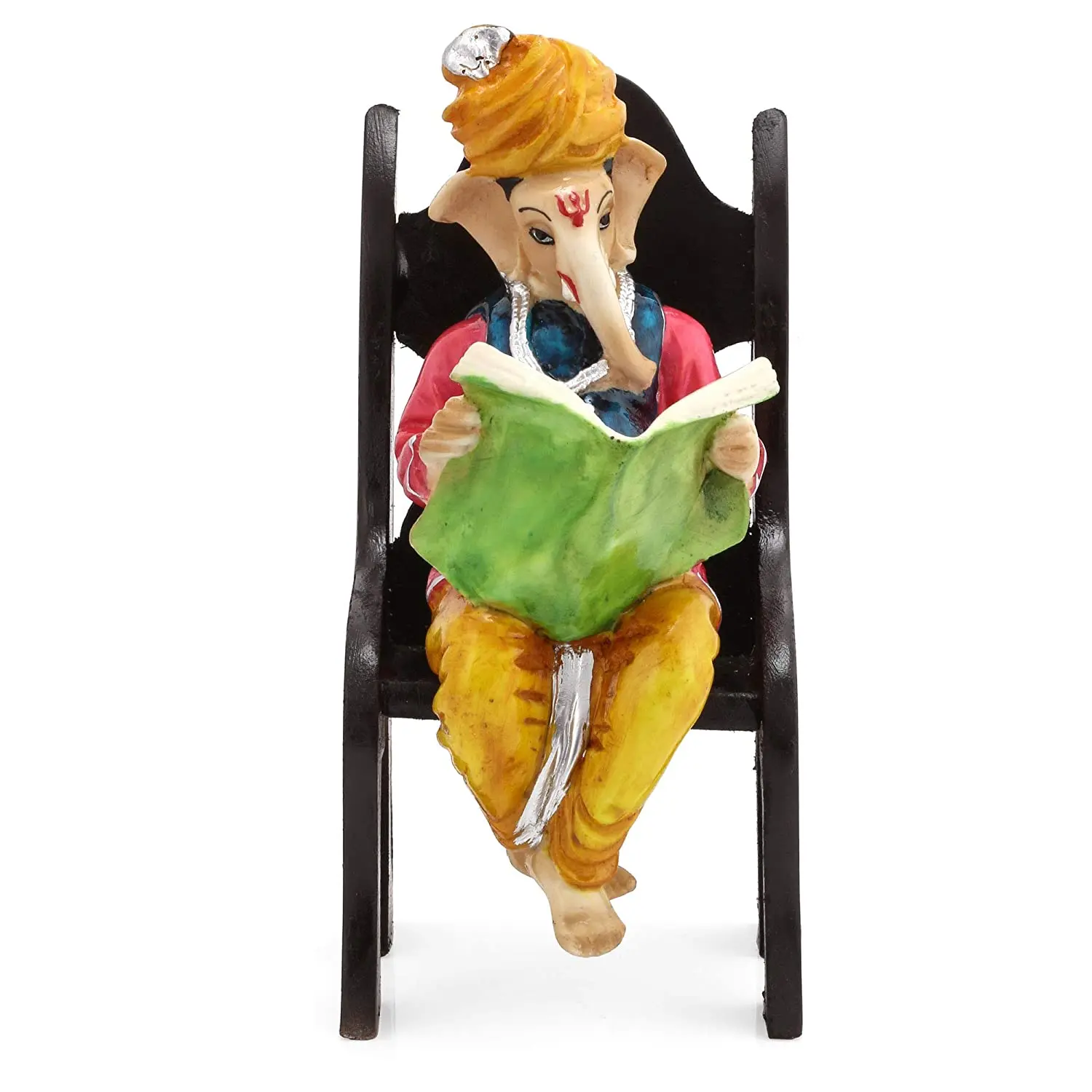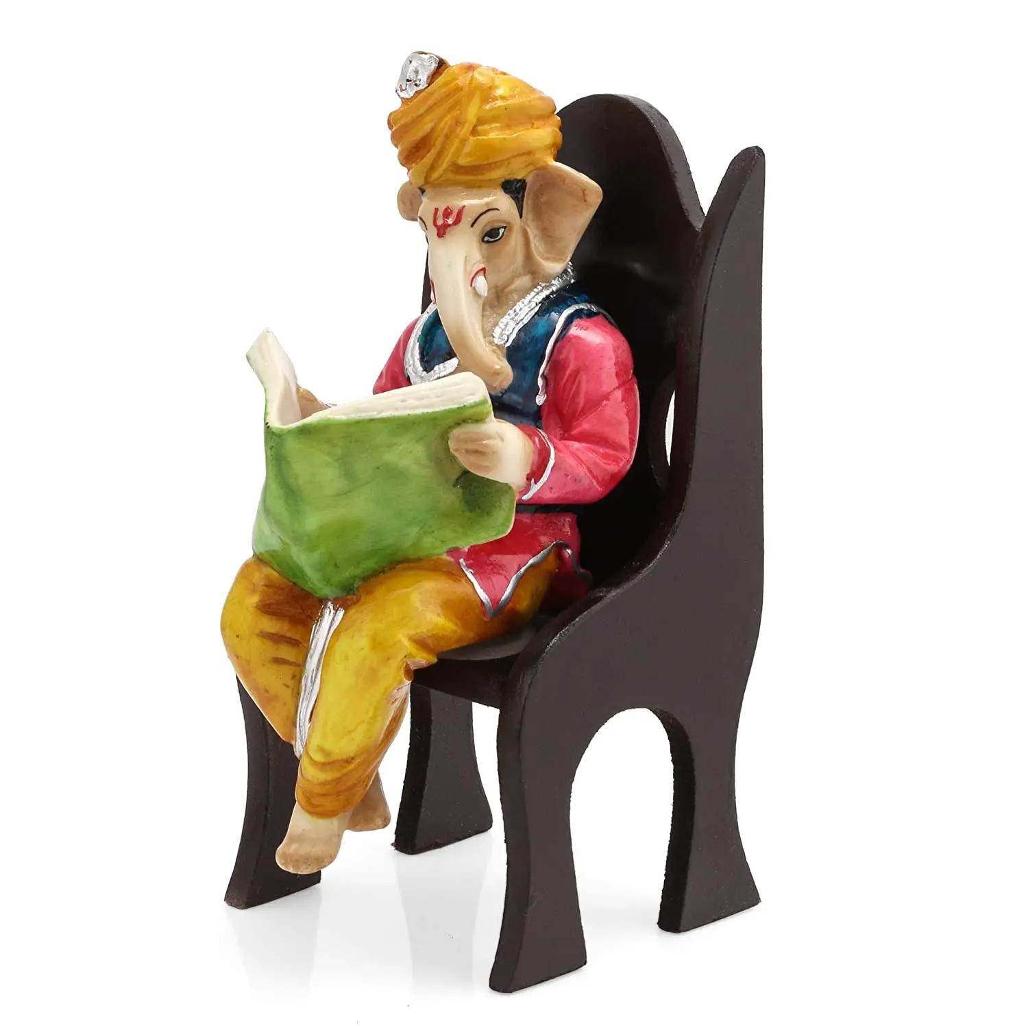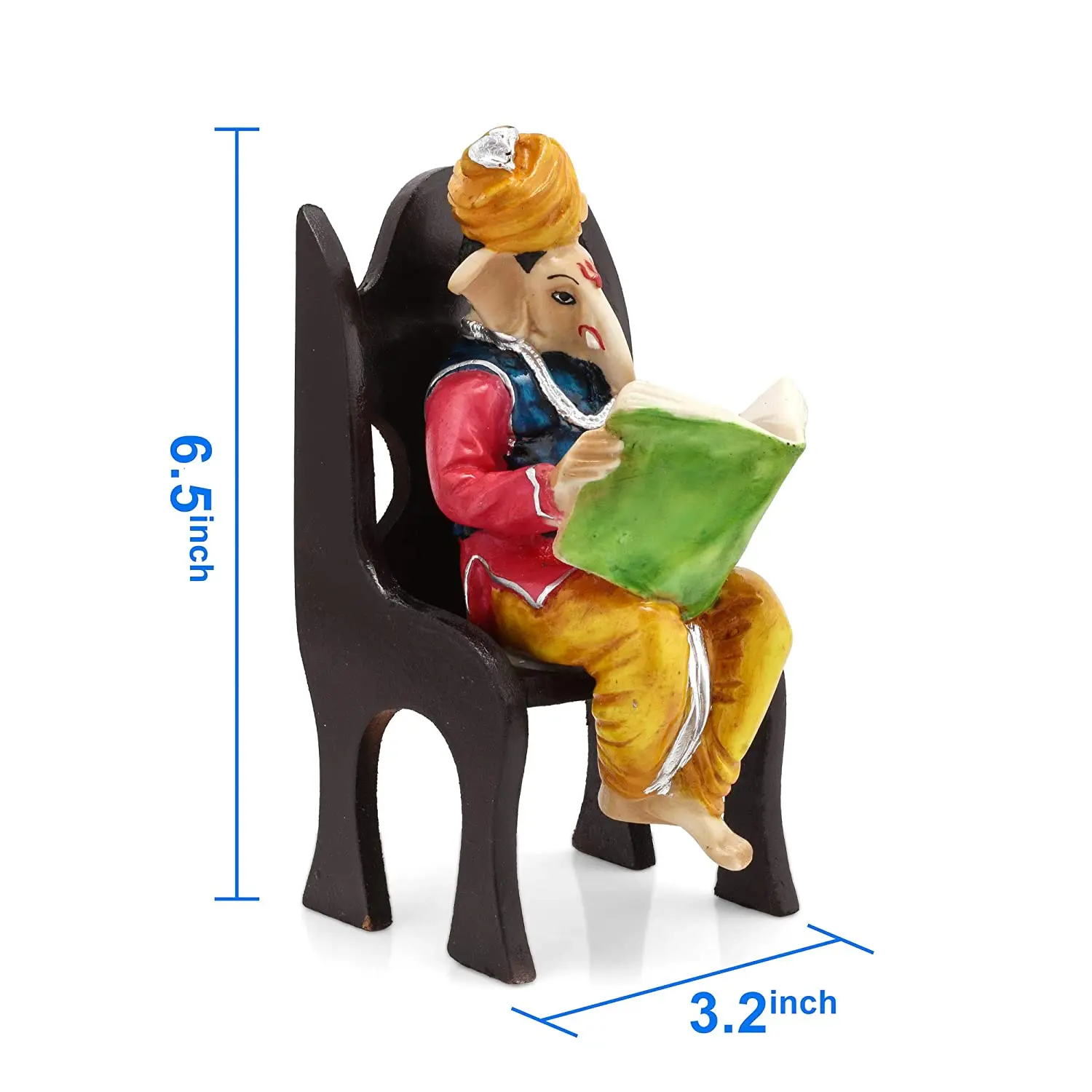 Artistic Design & Craftsmanship Molded from durable polyresin, this figurine captures a delightful moment of the deity in study. Unlike traditional poses where he sits on a lotus or mouse, here Ganesha is depicted sitting on a modern, high-back chair, bridging the gap between ancient tradition and modern lifestyle. He holds an open green book, signifying the evergreen nature of knowledge. The craftsmanship is evident in the fine detailing—from the texture of his trunk to the folds of his yellow dhoti and the intricate jewelry around his neck. The dark brown chair provides a neutral base that makes the bright colors of his attire pop.