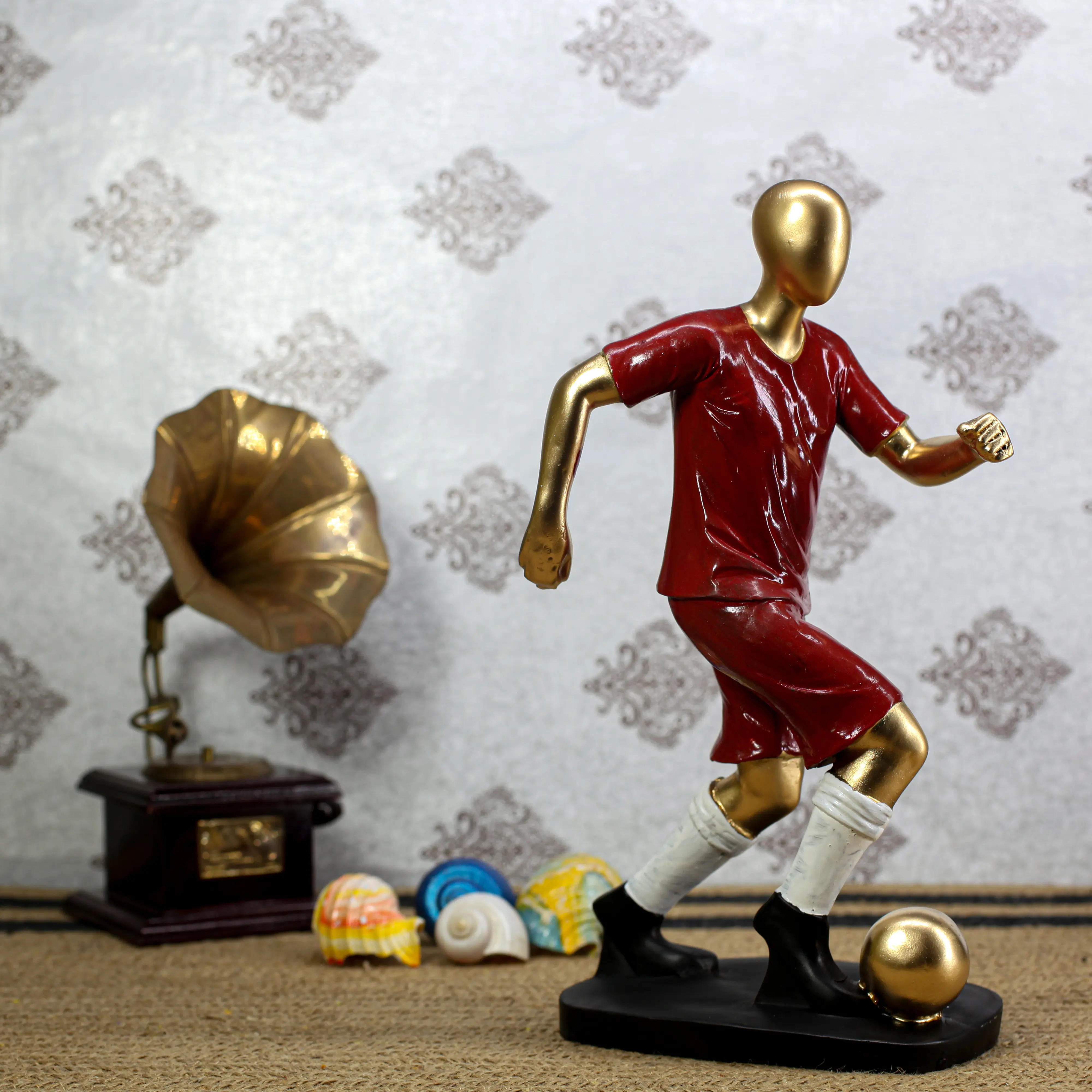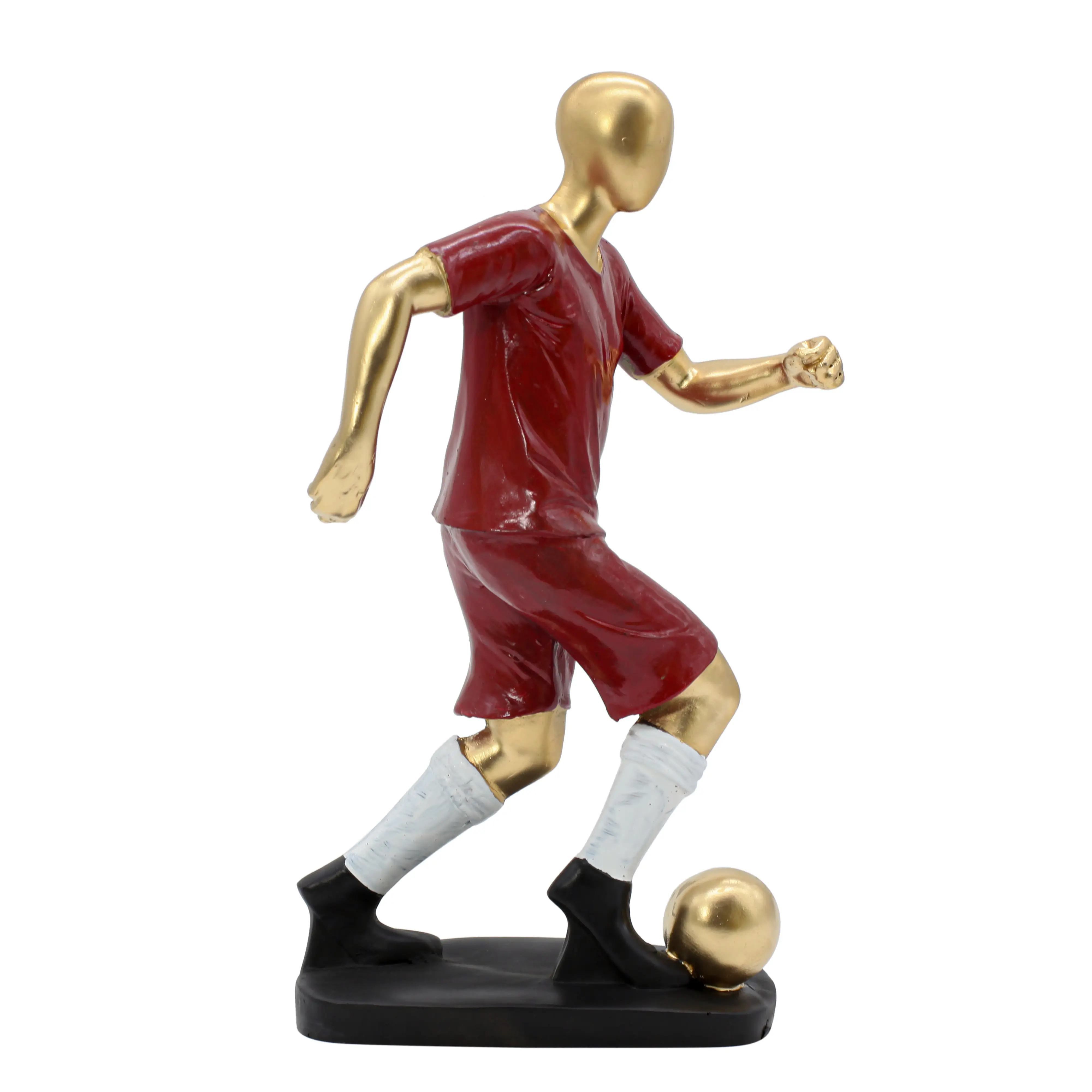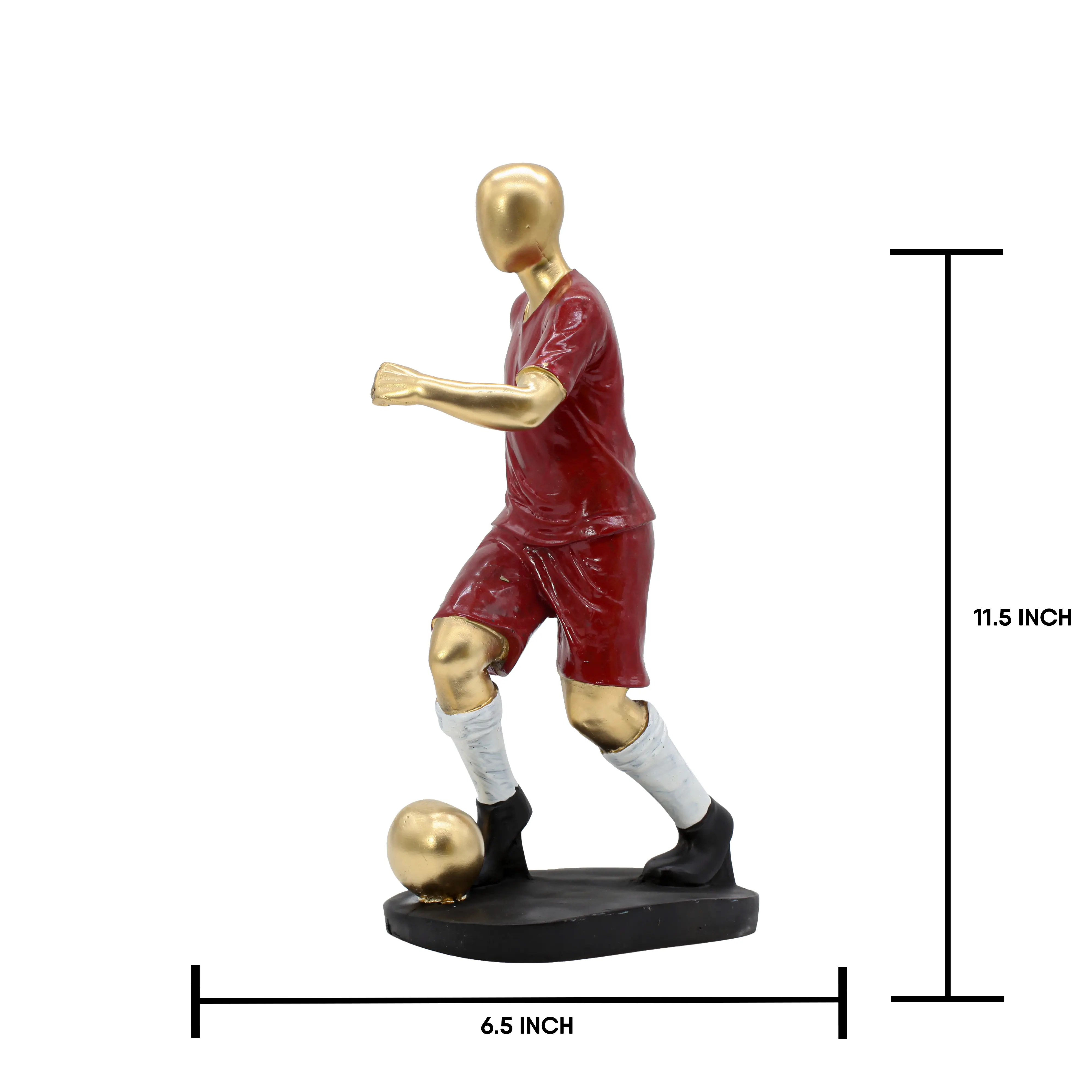 Kick off your decor style with our Red & Gold Football Player Statue. This figurine is a tribute to agility, focus, and the drive to win. Unlike static statues, this piece is full of movement—the player’s arms are pumping, knees are high, and the ball is glued to his feet, ready for a strike. The aesthetic is a blend of modern art and sports memorabilia. The Gold Skin Finish elevates it from a toy to a piece of art, while the Red Uniform adds a splash of passionate color to your room. The statue stands securely on a sturdy, irregular black base that mimics the ground. Whether you place it next to your TV during match days or keep it on your office desk as a symbol of your competitive spirit, this soccer player is a champion in every sense.