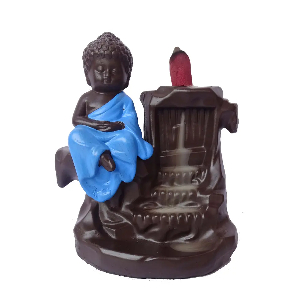 Artistic Design & Detail The focal point of this burner is the Little Monk, an endearing figure representing the purity of the "Baby Buddha." Unlike other statues that may show strict prayer poses, this monk is depicted in a casual, resting pose with legs dangling comfortably. He wears a vibrant sky-blue robe that symbolizes tranquility and healing. The base is sculpted to look like a rugged cliff or rock formation, finished in a deep, glossy brown that provides a sophisticated, earthy foundation.
