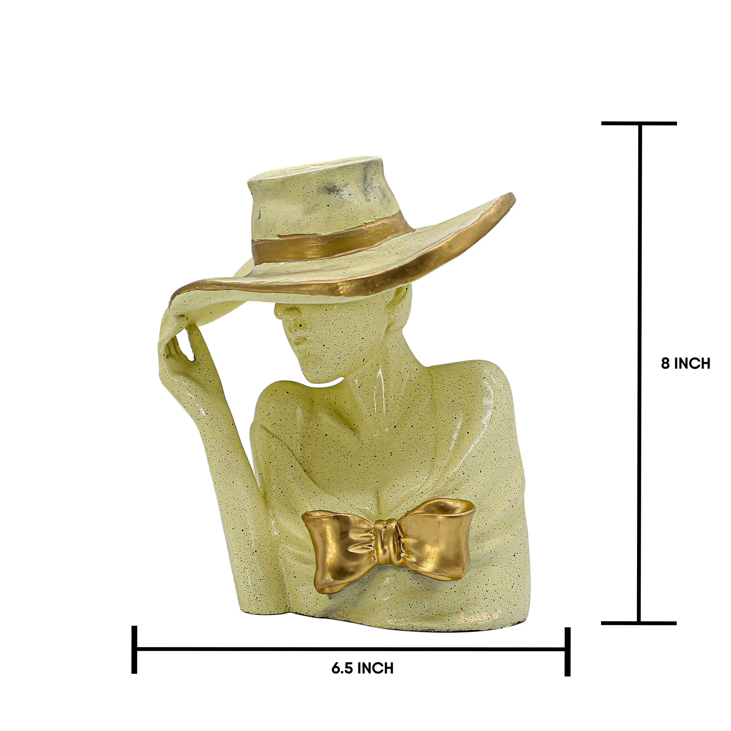 Infuse your home with the allure of vintage glamour with our Resin Elegant Lady Bust with Hat. This exquisite sculpture celebrates the timeless beauty of classic fashion. The figure depicts a woman in a pose of quiet confidence, one hand gently tipping the brim of her large sun hat, obscuring her eyes in a mysterious and alluring way. The bust is finished in a warm, speckled cream tone that gives it an organic, stone-like appearance. This neutral base is elevated by striking gold accents—a shimmering band around the hat and a bold gold bow resting on her chest. Crafted from sturdy resin, this piece is perfect for adding a feminine, sophisticated touch to your makeup vanity, entryway console, or a curated bookshelf. It is not just a statue; it is a statement of style.