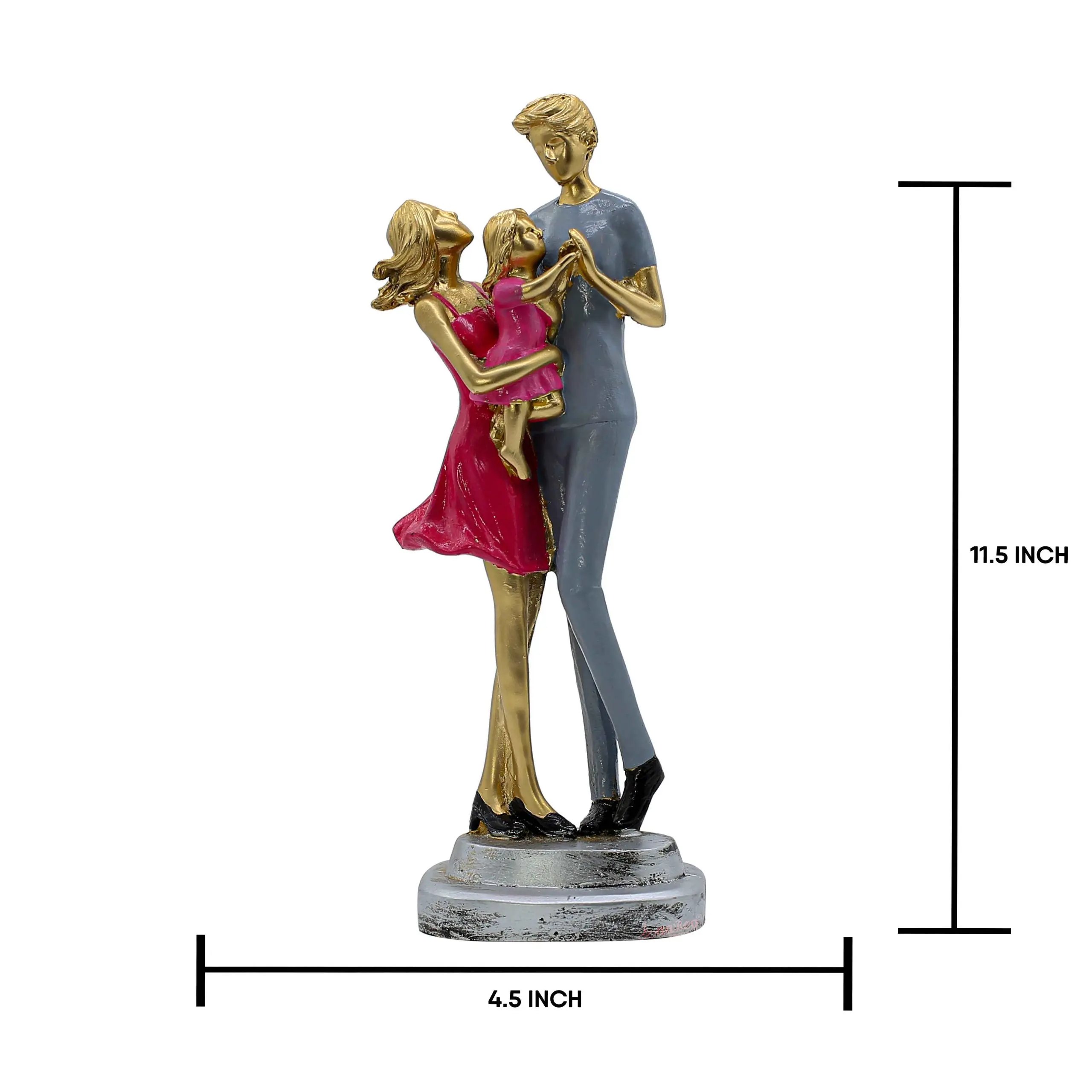 The Contrast: To balance the brightness of the pink, the father is painted in a cool, understated grey ensemble. The skin of all three figures is finished in a luxurious golden metallic tone, adding a touch of elegance and warmth to the piece.
