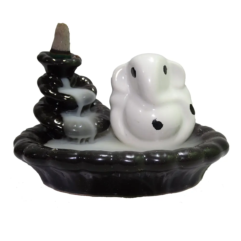 Modern Design Meets Tradition This incense burner offers a contemporary take on traditional idols. The Lord Ganesha figure is sculpted in a minimalist style, with soft curves and a pure white finish dotted with black accents. He sits beside a tiered "waterfall" structure on a scalloped black base. The monochromatic black-and-white color scheme ensures that this piece fits effortlessly into modern, minimalist, or traditional Indian interiors.